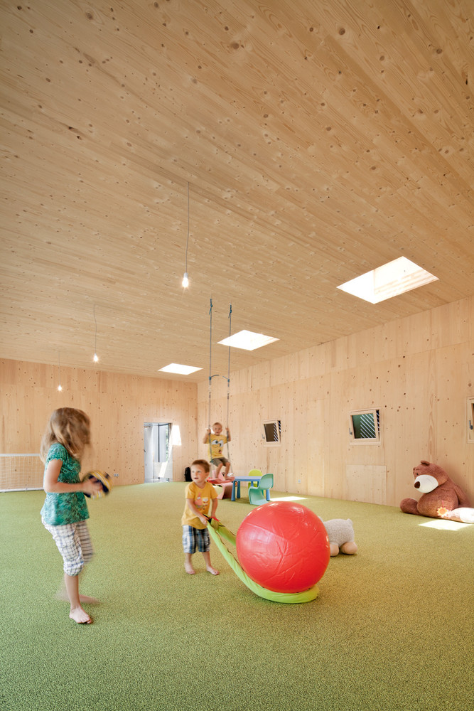 Rozbudowa domu przyniosła także przestrzeń dla dzieci. W miejscu dawnego domku na drzewie powstała imponująca sala zabaw o wysokości 3,5 m, wyposażona w ściankę wspinaczkową, huśtawkę i bramkę piłkarską. Z zewnątrz nowa część przypomina ogromną drewnianą skrzynię, a wewnątrz została zaplanowana tak, by w przyszłości mogła zostać podzielona na cztery osobne pokoje. To elastyczne rozwiązanie odpowiada na potrzeby rosnącej rodziny i zapewnia przestrzeń do wspólnej zabawy oraz nauki.