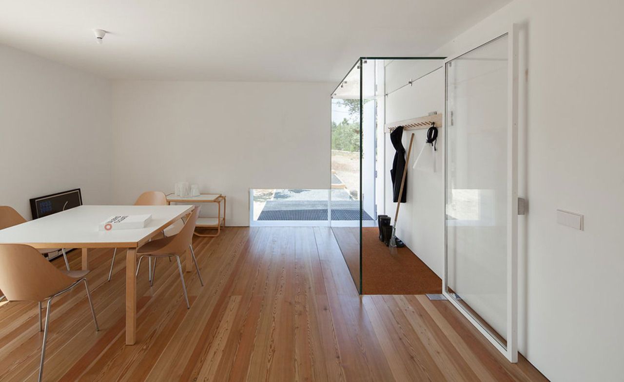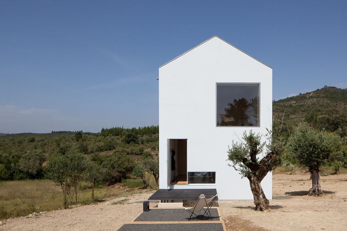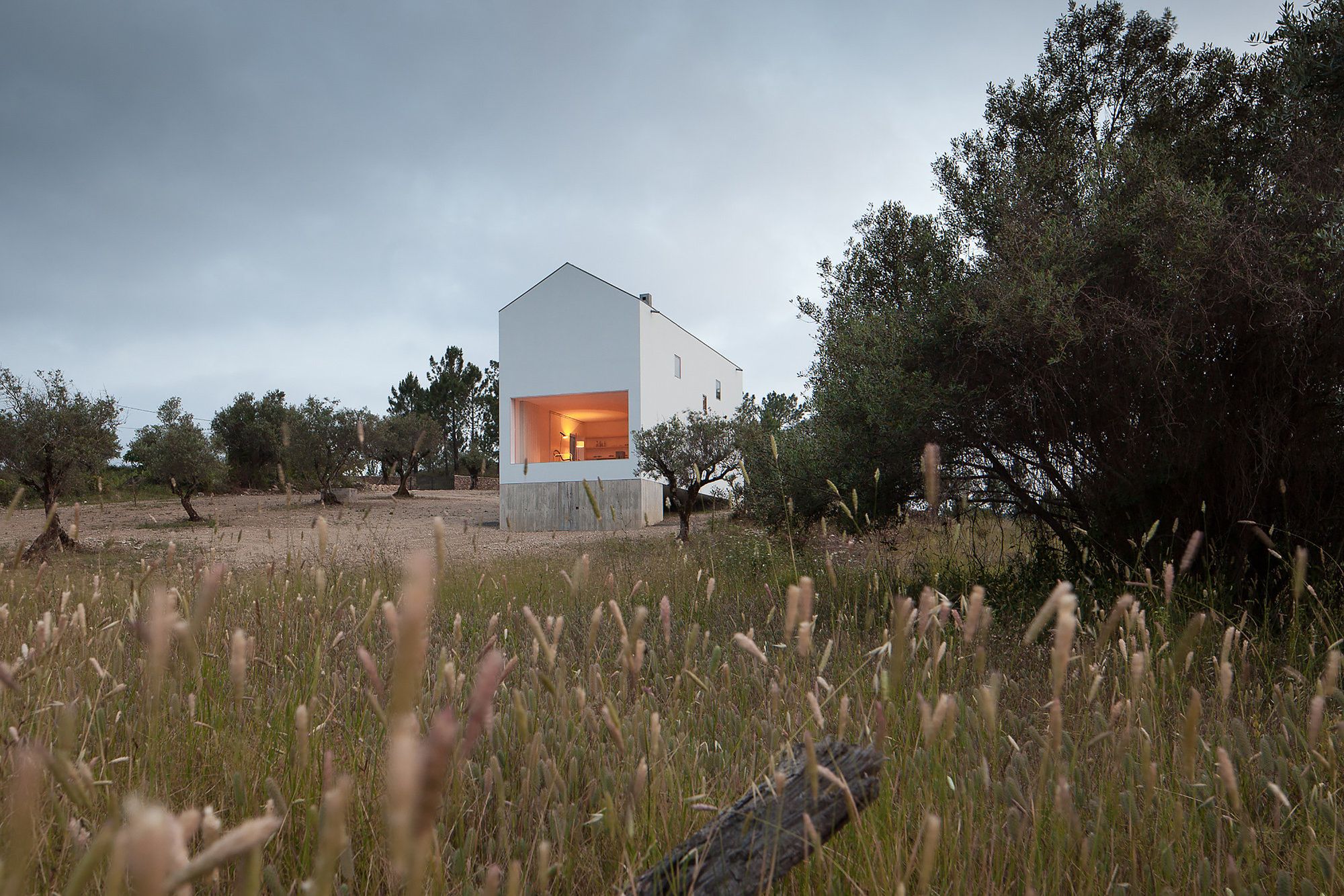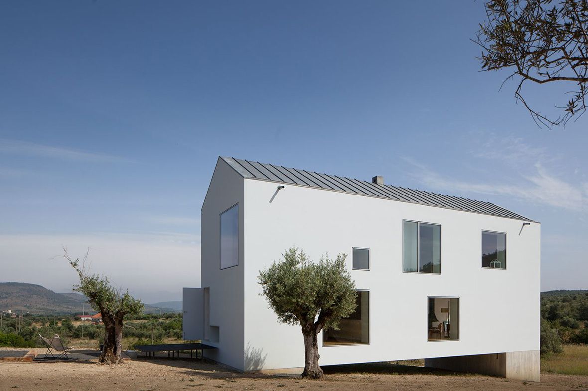 Nowy budynek zlokalizowano w zachodniej części działki, z dala od drogi głównej, co zapewnia prywatność, optymalną ekspozycję na słońce oraz otwarcie widoków na otaczającą zieleń. Usytuowanie domu zostało starannie dobrane tak, aby nie ingerować w naturalne ukształtowanie terenu i zachować istniejące zbocze oraz drzewa. Dwupiętrowy, prostokątny dom z dwuspadowym, cynkowanym dachem został częściowo oddzielony od stoku betonową piwnicą, w której zaprojektowano niewielką piwniczkę na wino. Ta oszczędna forma architektoniczna podkreśla dialog między nowoczesnym domem jednorodzinnym a krajobrazem portugalskiej wsi.