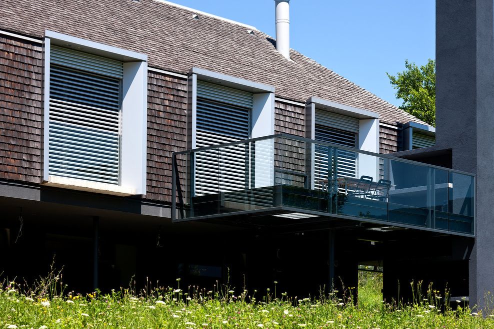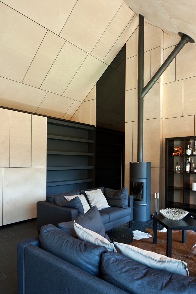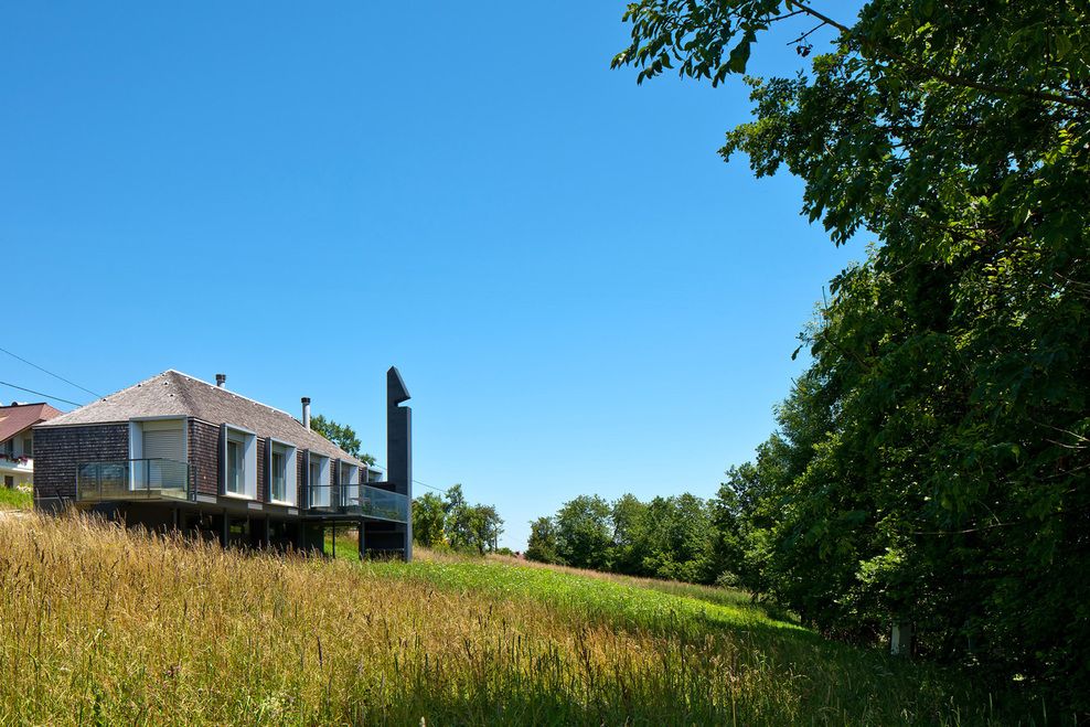 Projekt wolnostojącego domu letniskowego położonego na wzgórzu w Hohenthurn w Austrii powstał z myślą o harmonijnym połączeniu tradycji górskiej architektury z nowoczesnymi rozwiązaniami. Budynek rozciąga się ze wschodu na zachód, osadzony na piwnicy ze zbrojonego betonu, która pełni funkcję fundamentu oraz częściowo ukrytego dolnego poziomu domu. Ściany z betonu i konstrukcja z twardego drewna, pokryte typowym regionalnym gontem, tworzą spójną formę, w której ściany i dach łączą się w jedną powierzchnię, nawiązując do tradycyjnych górskich zabudowań. Balkon południowy pełni funkcję punktu widokowego na okoliczne góry, podkreślając bliskość domu z przyrodą, a masywny komin zakotwiczony w ziemi staje się charakterystycznym elementem krajobrazu.