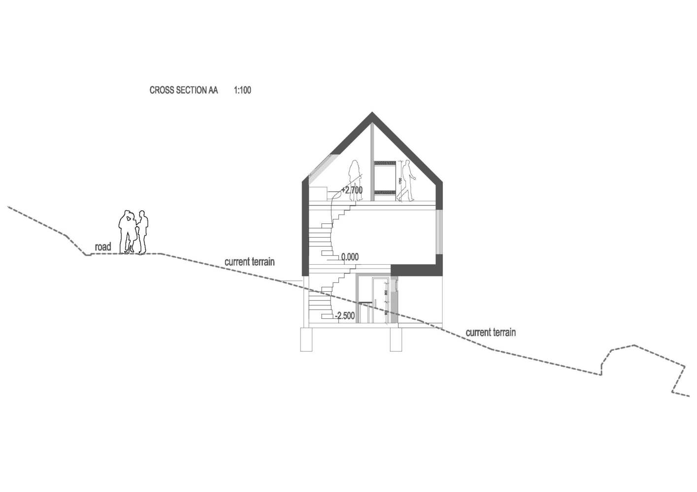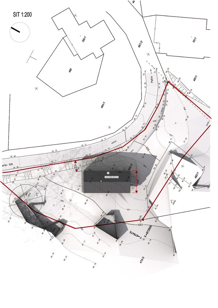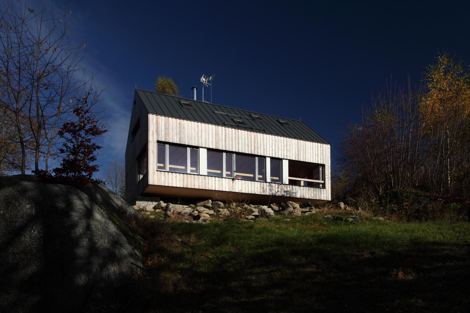 Górna część konstrukcji opiera się na kamiennej podstawie, co przywodzi na myśl efekt przesunięcia budynku przez lawinę, jakby dom został dosłownie „wciśnięty” w teren. Działka, na której znajduje się dom, zapewnia panoramiczne widoki na rozciągającą się poniżej dolinę, a sama lokalizacja na skalistej ziemi podkreśla związek budynku z naturą. Formacja skalna w południowo-zachodniej części działki pozwala podziwiać nie tylko widoki na region, ale również wprowadza naturalny akcent do całego projektu.