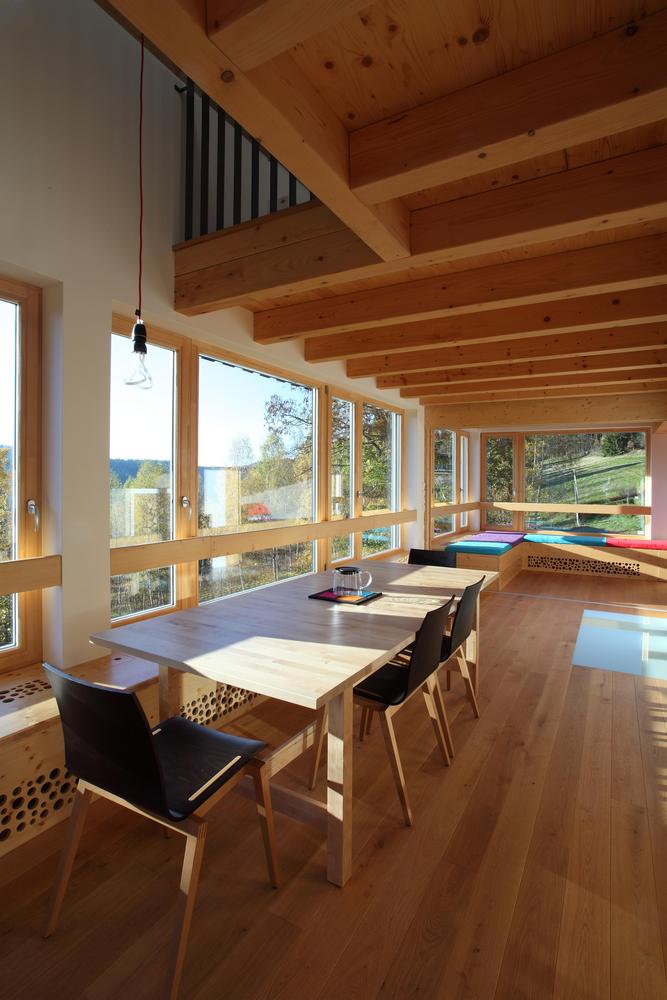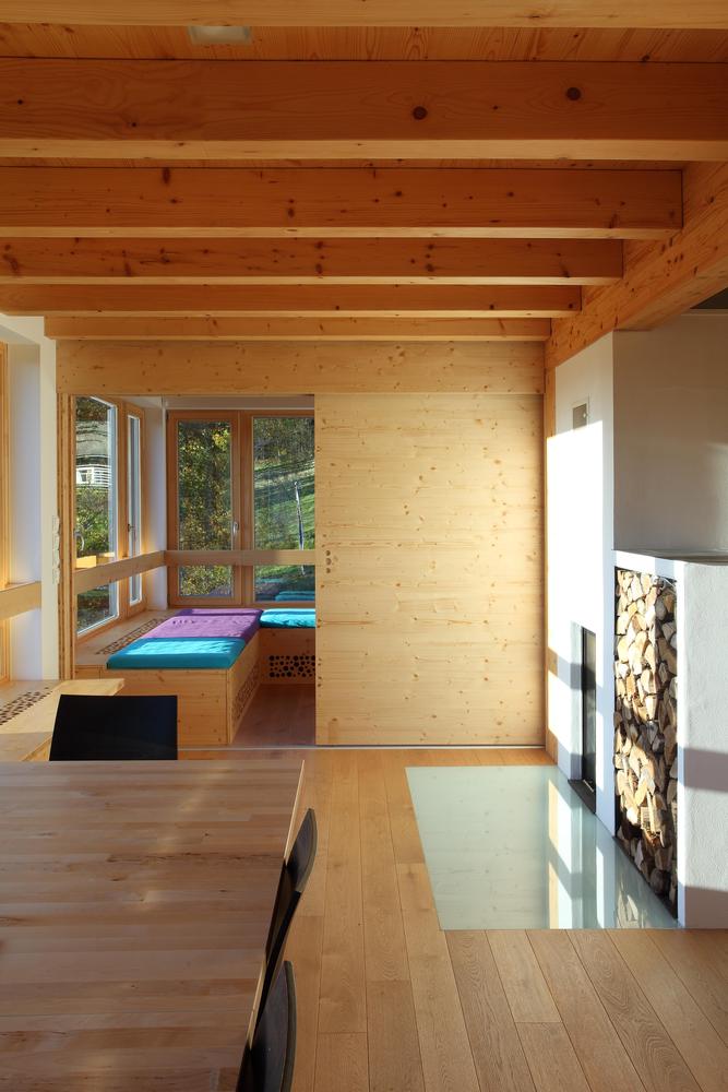 Wnętrze domu wyróżnia się wykorzystaniem drewna, które jest obecne w różnych formach i wykończeniach. Ściany przesuwne z drewna świerkowego, podłogi dębowe w salonie oraz długa ławka umiejscowiona pod dużym, panoramicznym oknem tworzą spójną, naturalną przestrzeń. Kominek w centralnej części domu zapewnia ciepło nie tylko w salonie, ale również na poddaszu, tworząc przytulną atmosferę w całym domu.