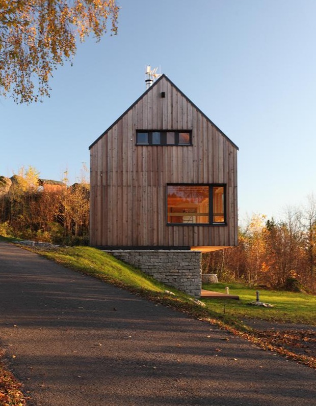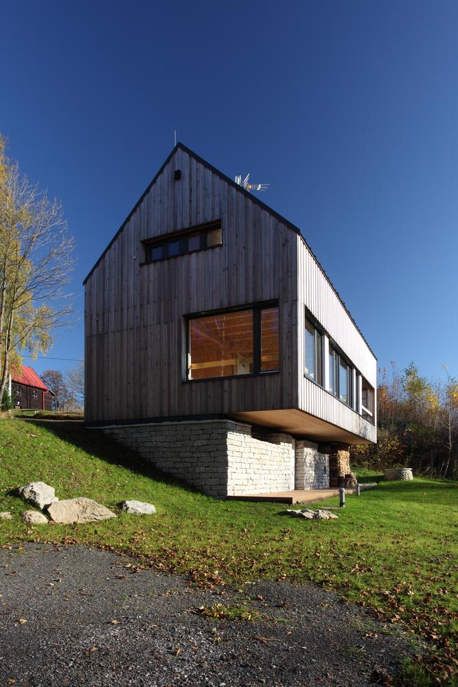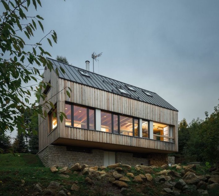Fasada domu została zaprojektowana z modrzewiowych desek, które biegną pionowo i będą z czasem zmieniały swój kolor, co dodatkowo podkreśla naturalny charakter budynku. Ramy okien oraz metalowy dach w ciemnoszarym kolorze doskonale komponują się z lokalnym kamieniem użytym do wykończenia podstawy domu. Takie wykończenie sprawia, że budynek wtapia się w otoczenie, stając się integralną częścią górskiego krajobrazu.