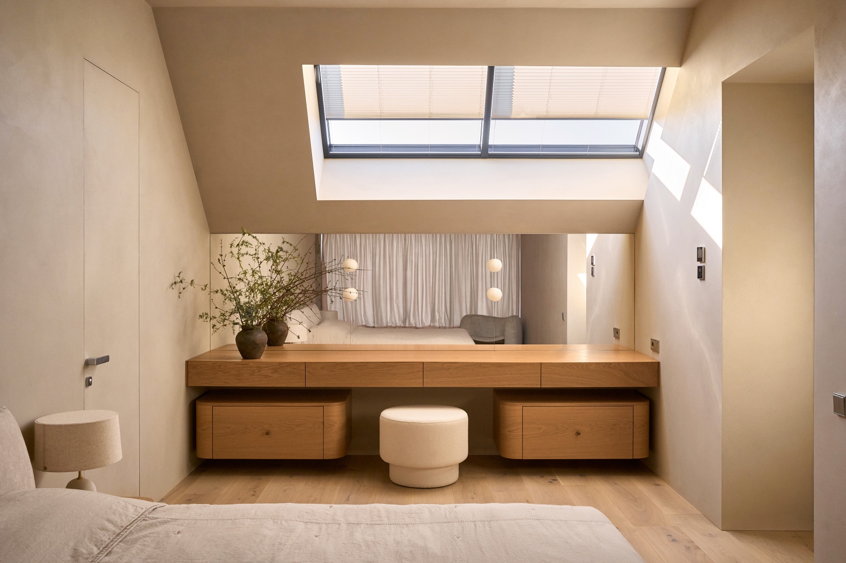 Sypialnia główna, utrzymana w tej samej materialnej konsekwencji, staje się miejscem szczególnie wyciszonym – przestrzenią, która nie potrzebuje dekoracji, bo jej siła tkwi w subtelności i świetle.