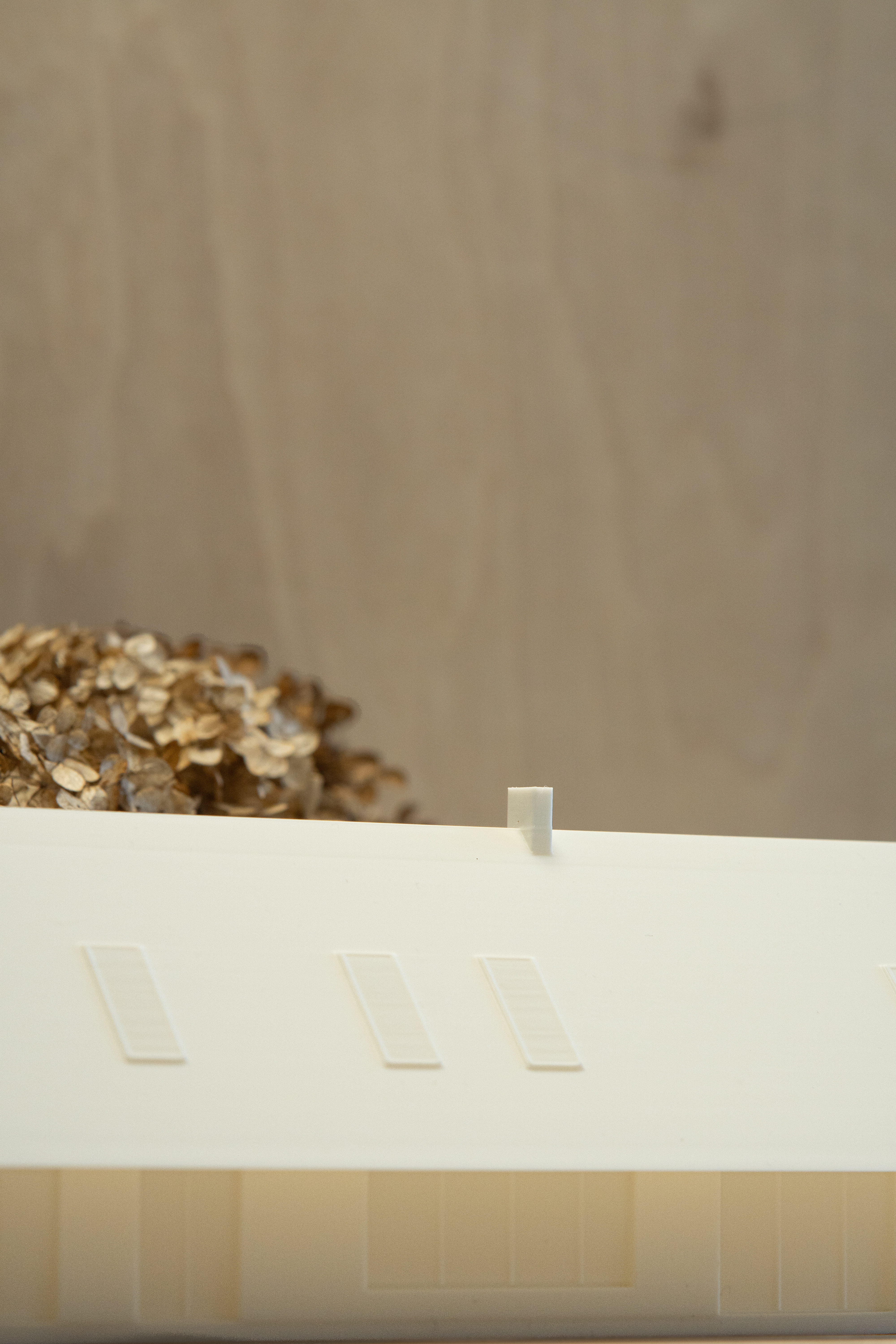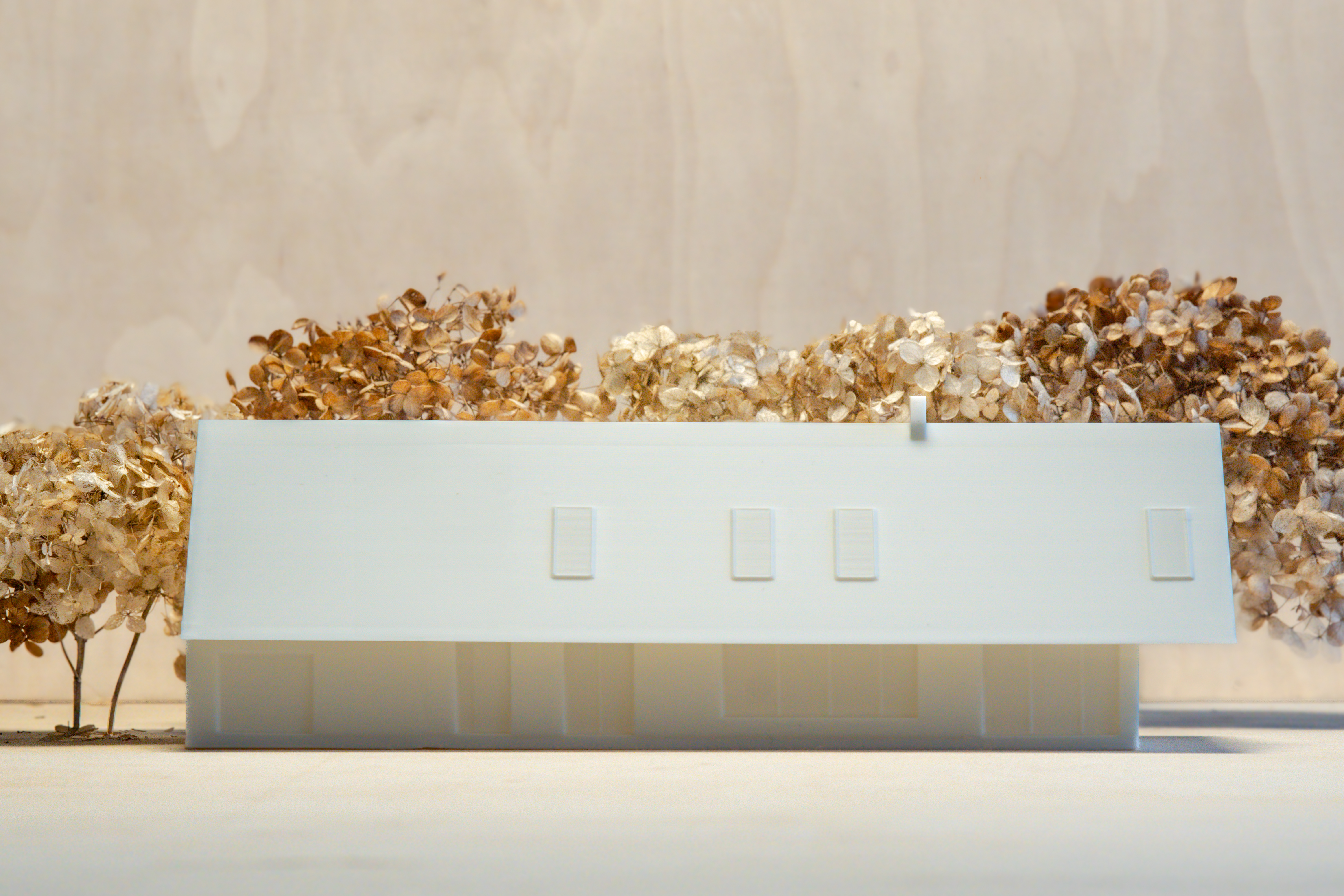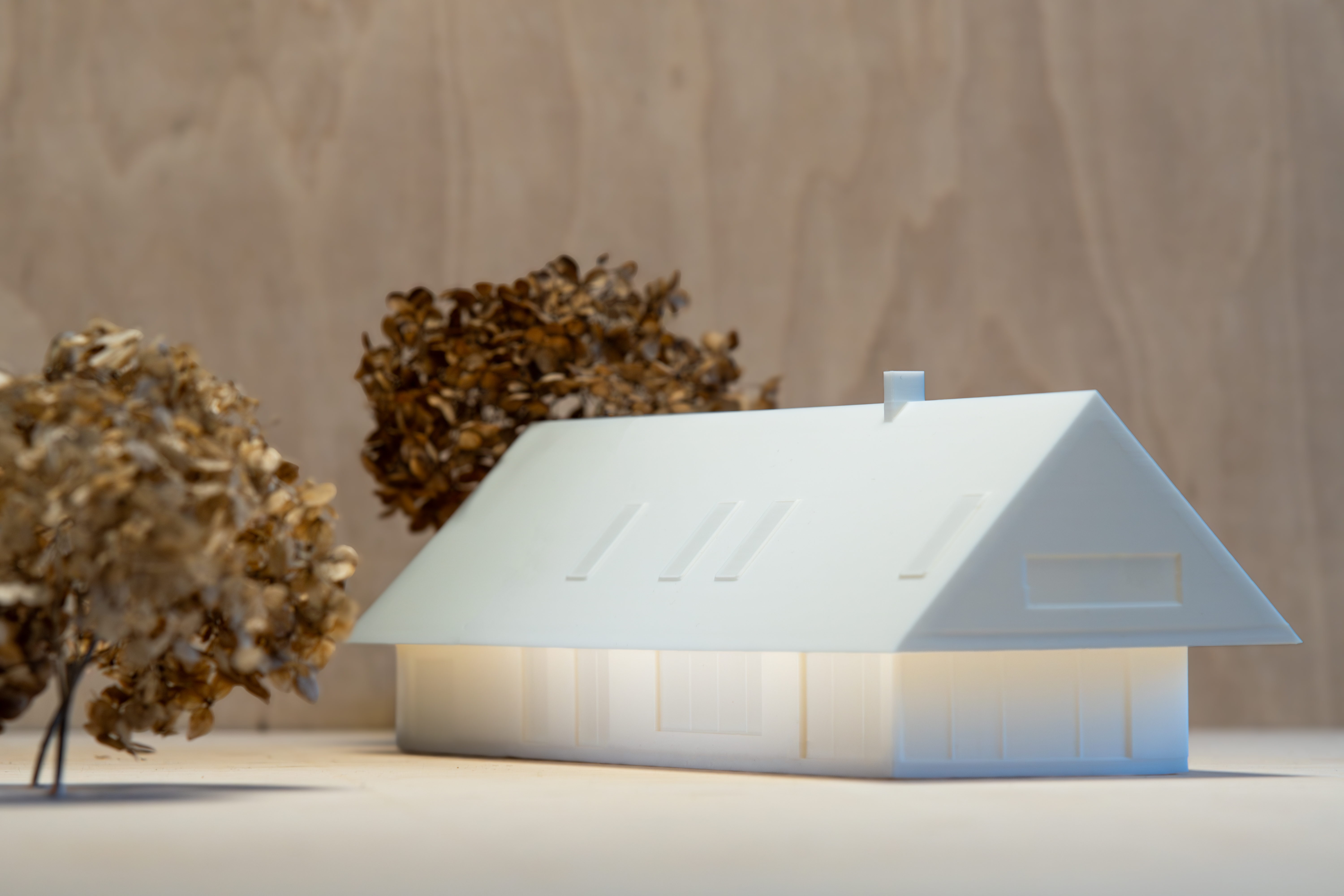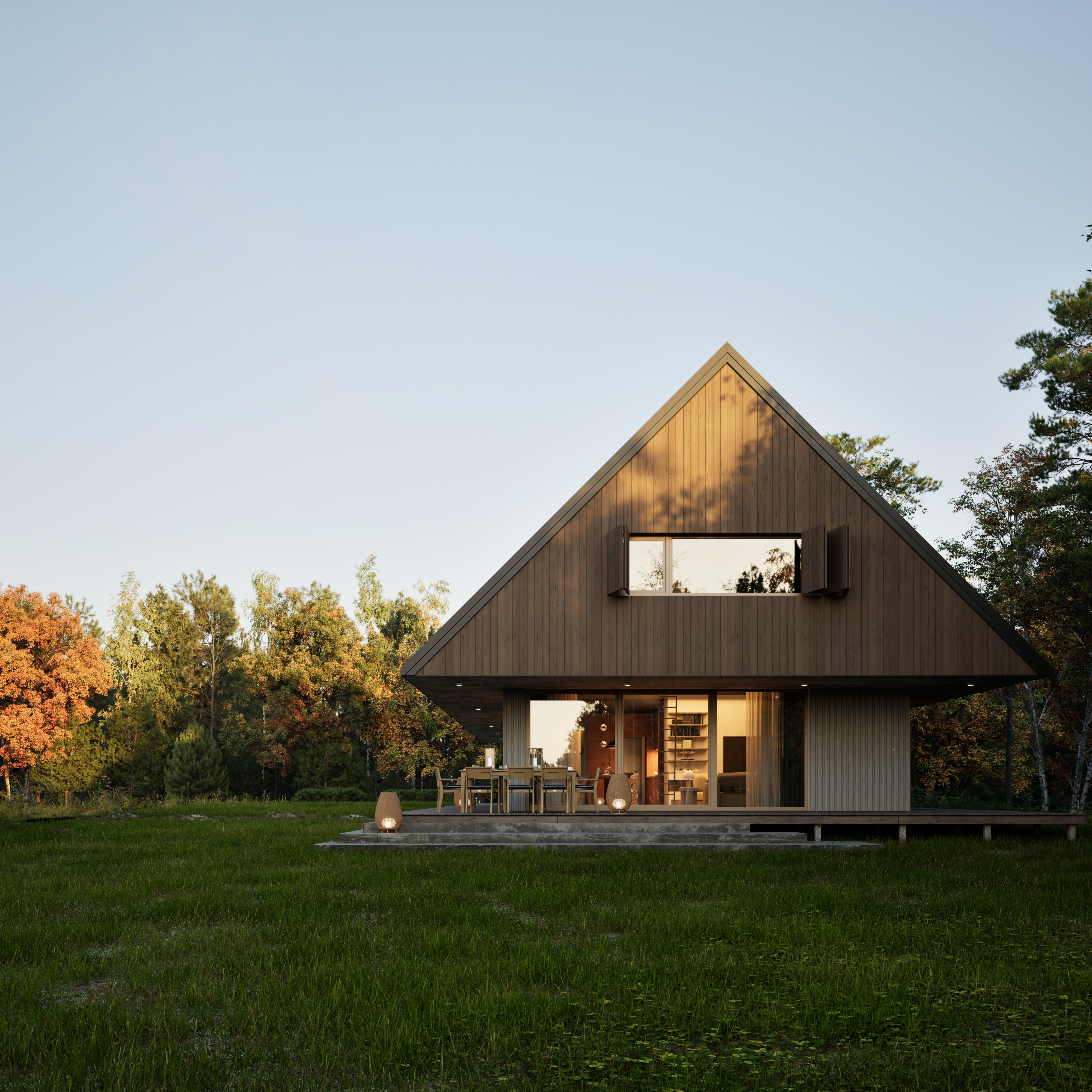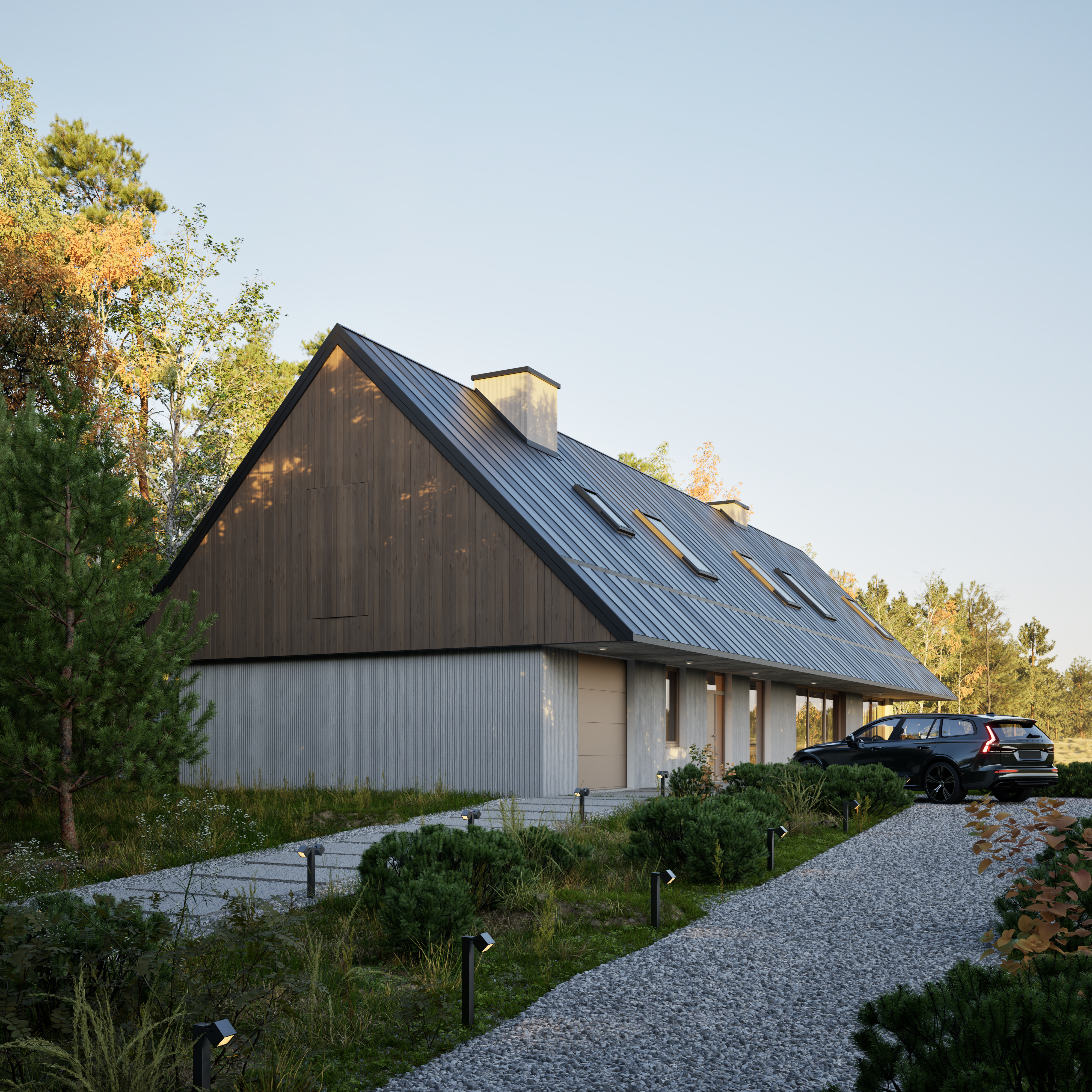 Budynek został zaplanowany jako jednorodzinny dom dla rodziny 2+2, o charakterystycznej, wydłużonej bryły z dachem dwuspadowym. Inspiracją dla jego kształtu była tzw. „nowoczesna stodoła” – prosta, ale zarazem nawiązująca do tradycji i otoczenia. Nie chcieliśmy przeładowywać formy zbędnymi udziwnieniami, dlatego bryła pozostała czytelna i spójna. Zdecydowaliśmy się na szczotkowany tynk w dolnej partii elewacji oraz drewniane deski na ścianach szczytowych poddasza. Takie wykończenie przywołuje skojarzenia z klasycznymi wiejskimi zabudowaniami, a zarazem współgra z naturalną kolorystyką okolicy. Całość wieńczy prosta, dwuspadowa połać dachu pokryta blachą, która podkreśla ponadczasowy charakter domu.