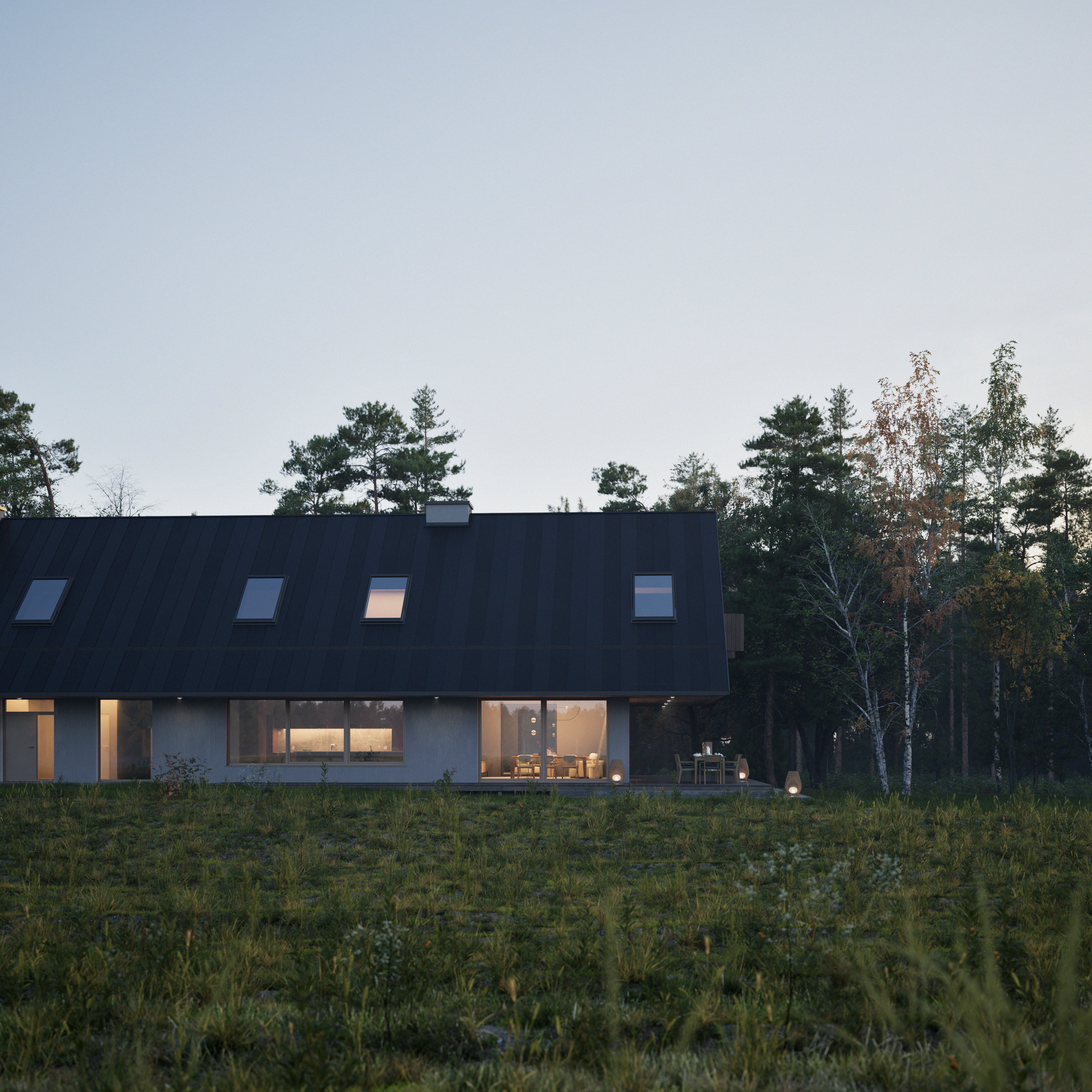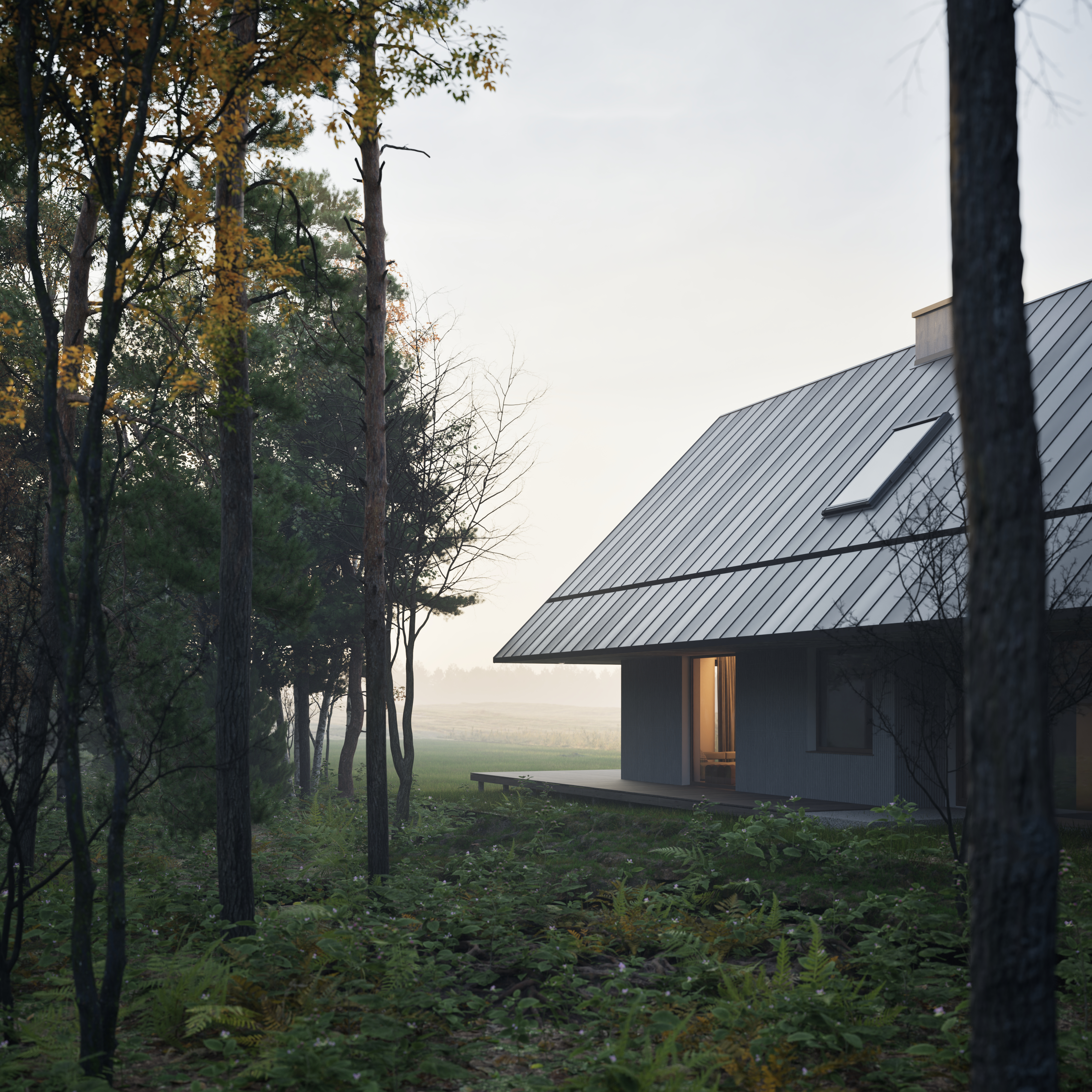 Budynek, który zaprojektowaliśmy, powstanie pod Warszawą, tuż przy granicy z Kampinosem, w malowniczym otoczeniu pól i lasu. Od strony frontowej działka sąsiaduje z pasem drzew, stanowiącym część kampinoskiej przyrody, a od pozostałych stron rozciągają się otwarte przestrzenie pól. Już na etapie wstępnej koncepcji zależało nam na tym, by dom idealnie wpisał się w sielski krajobraz oraz wykorzystał walory widokowe działki.