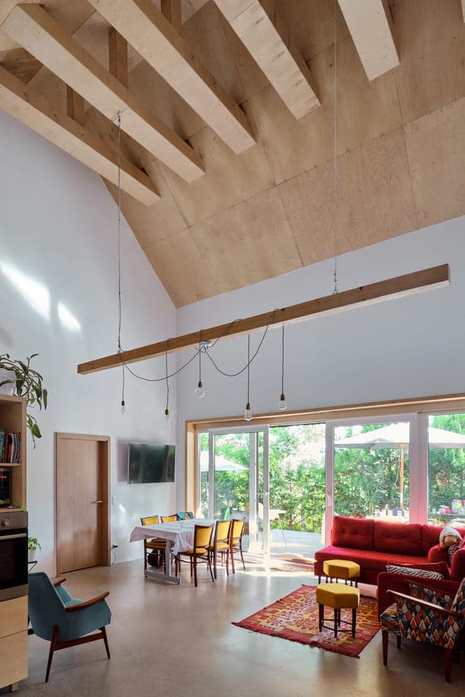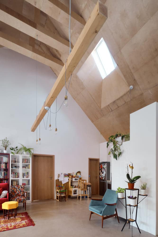 Centralna część dzienna to otwarta przestrzeń o podwójnej wysokości, w której dominują strzeliste połacie dachu i betonowa posadzka o wysokim połysku. Architekci zadbali o płynne połączenie wnętrza z ogrodem, projektując długi, zadaszony taras, który pozwala na bliski kontakt z naturą przez cały rok. Dzięki przemyślanej kompozycji przestrzeni oraz starannie wykadrowanym widokom, dom oferuje zróżnicowane doświadczenia przestrzenne – od zamkniętych zakątków po przewiewne otwarcia, zarówno w pionie, jak i poziomie.