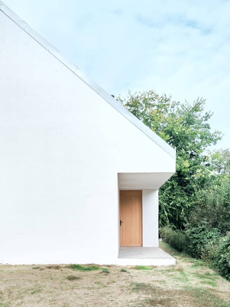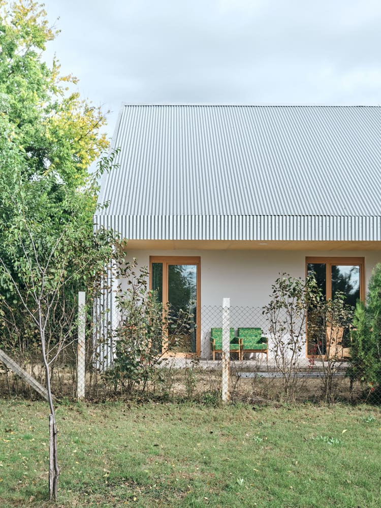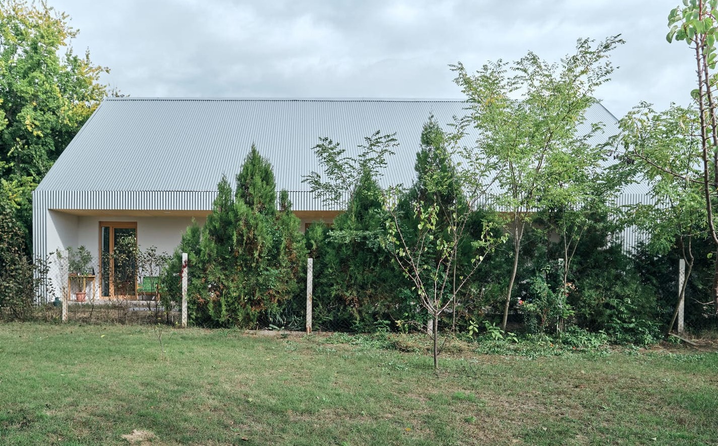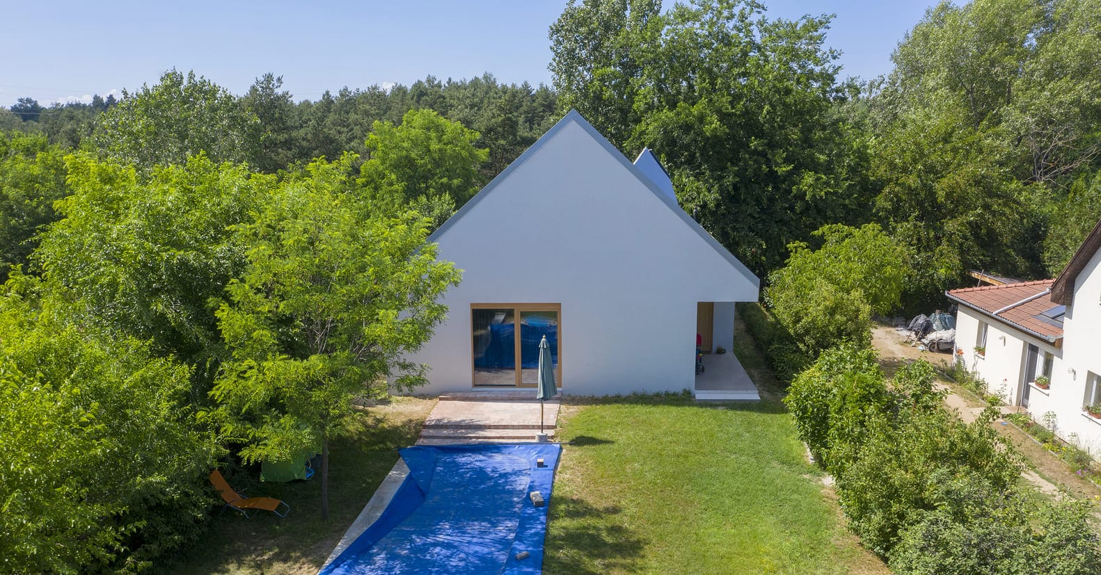 Inspiracją do stworzenia koncepcji była przyroda i ponadczasowość, które zdeterminowały zarówno formę architektoniczną, jak i wybór materiałów. Ściany pokryto białym tynkiem, a dach wykonano z metalu – oba te rozwiązania często spotykane są na węgierskich wsiach, jednak tutaj zyskały nowoczesną reinterpretację. Prosta forma elewacji zmienia się w zależności od światła, tworząc naturalny dialog z otoczeniem. Przestrzeń wewnętrzna została subtelnie podzielona na trzy strefy: publiczną, prywatną oraz przestrzeń dla dzieci, co czyni dom wyjątkowo funkcjonalnym, mimo jego niewielkich rozmiarów.