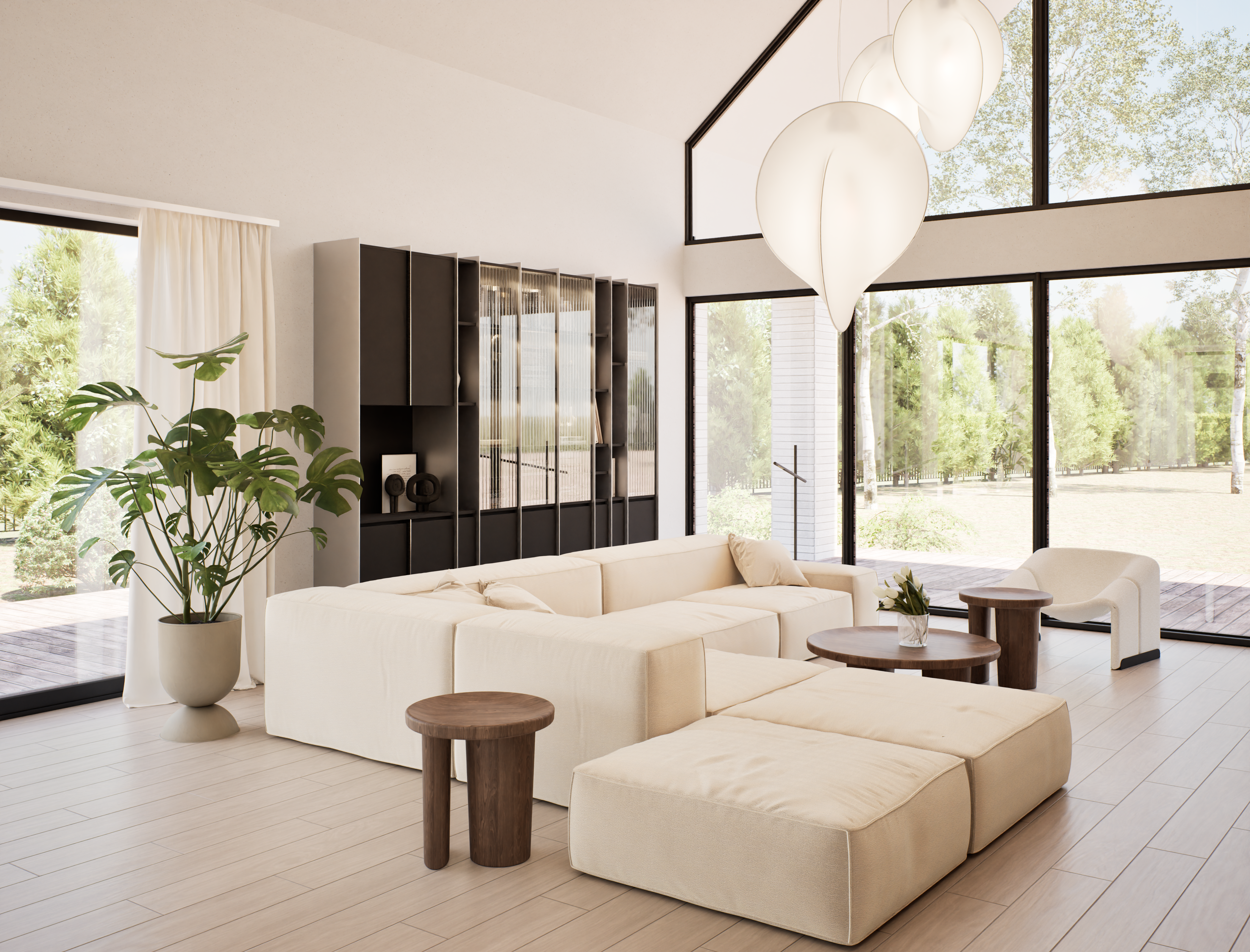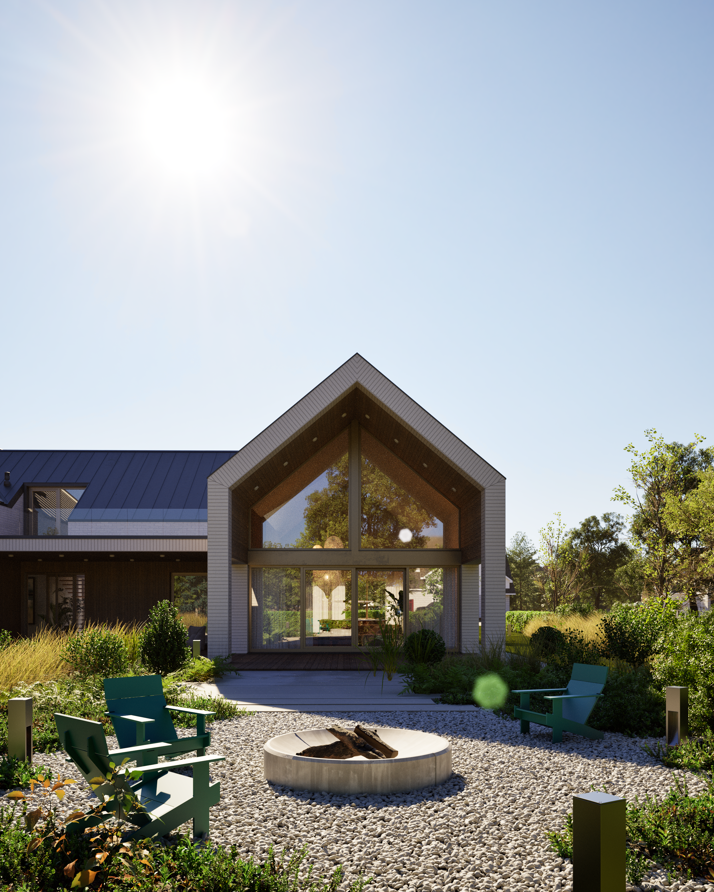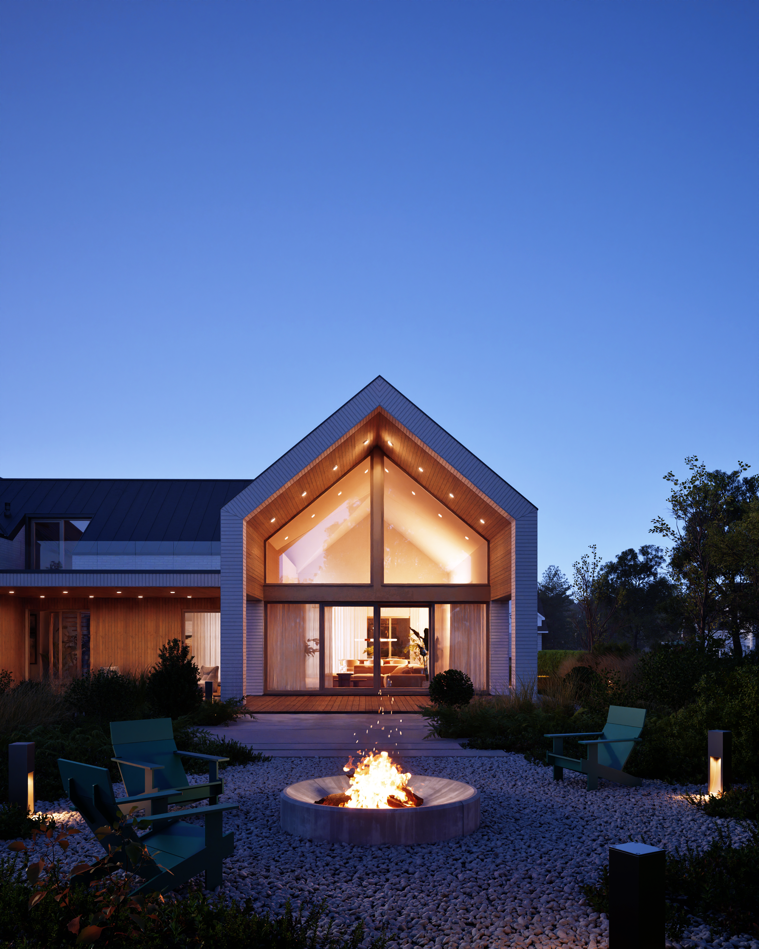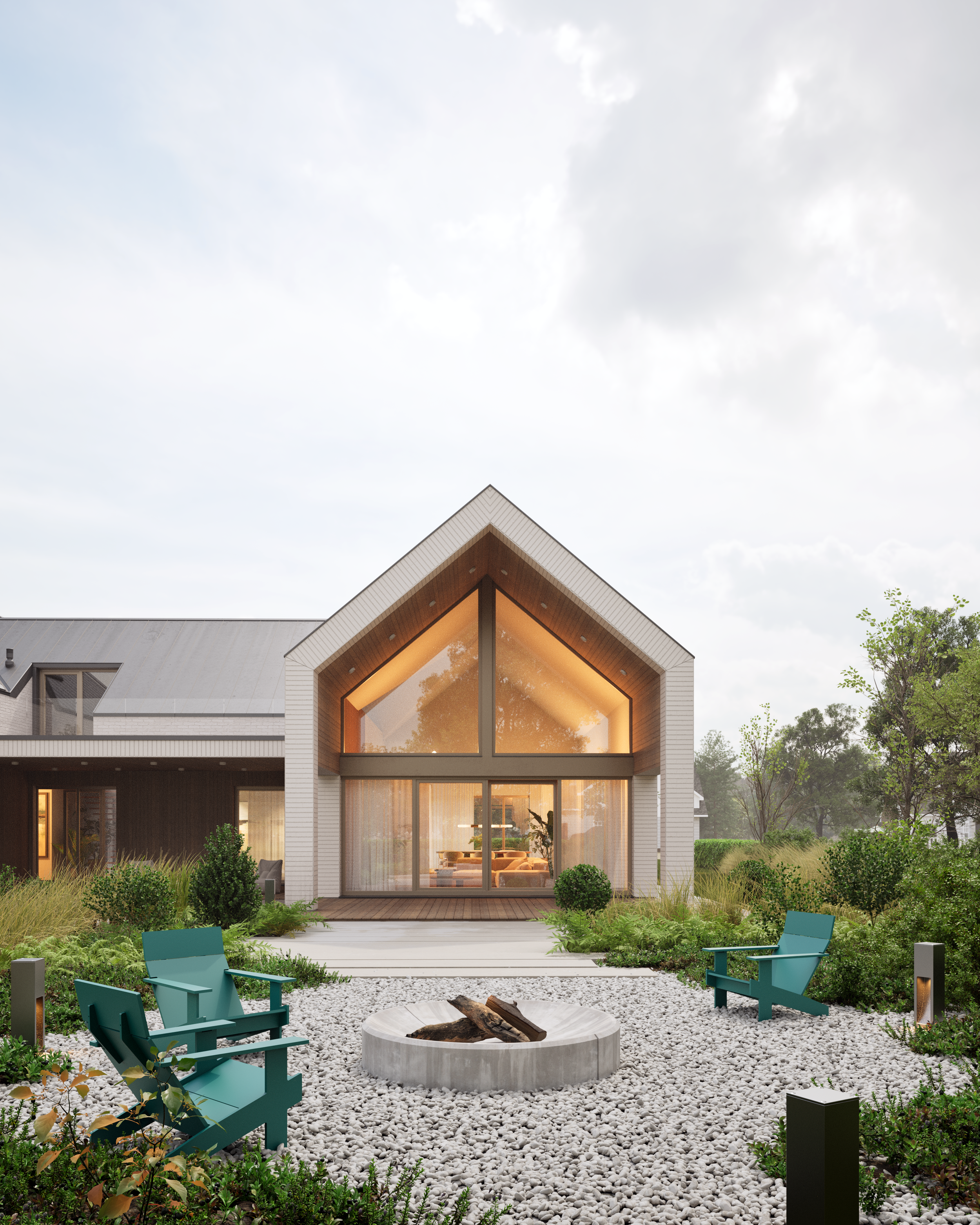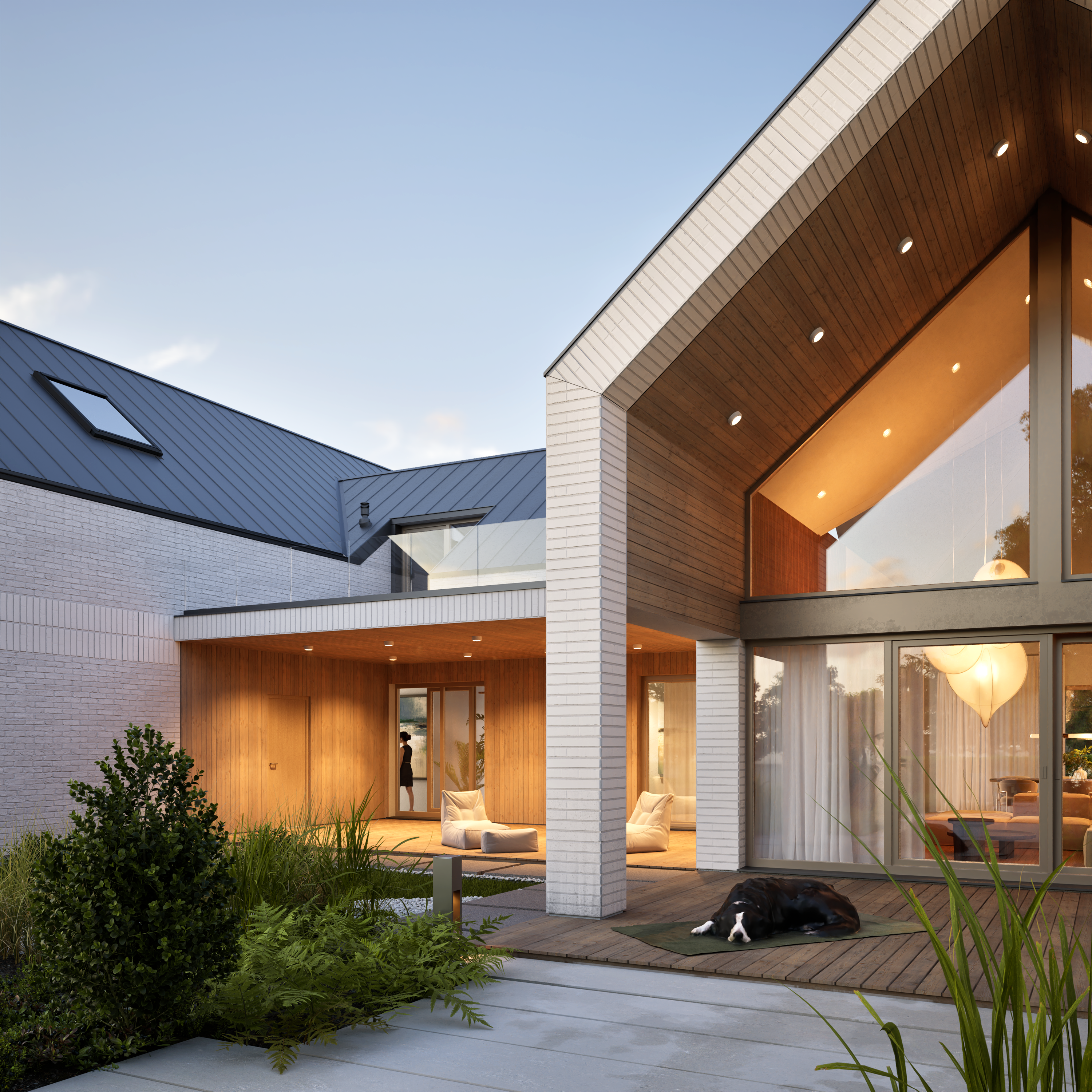 Jednym z głównych założeń projektowych było stworzenie półotwartego atrium – przestrzeni pomiędzy skrzydłami budynku, otwartej na południowo-zachodnią, główną część ogrodu, która zapewnia kontakt z zielenią, światłem i prywatnością. Dom „pracuje” w pełnej zgodzie z orientacją względem stron świata – każde z pomieszczeń ma optymalne doświetlenie i otwarcie widokowe.