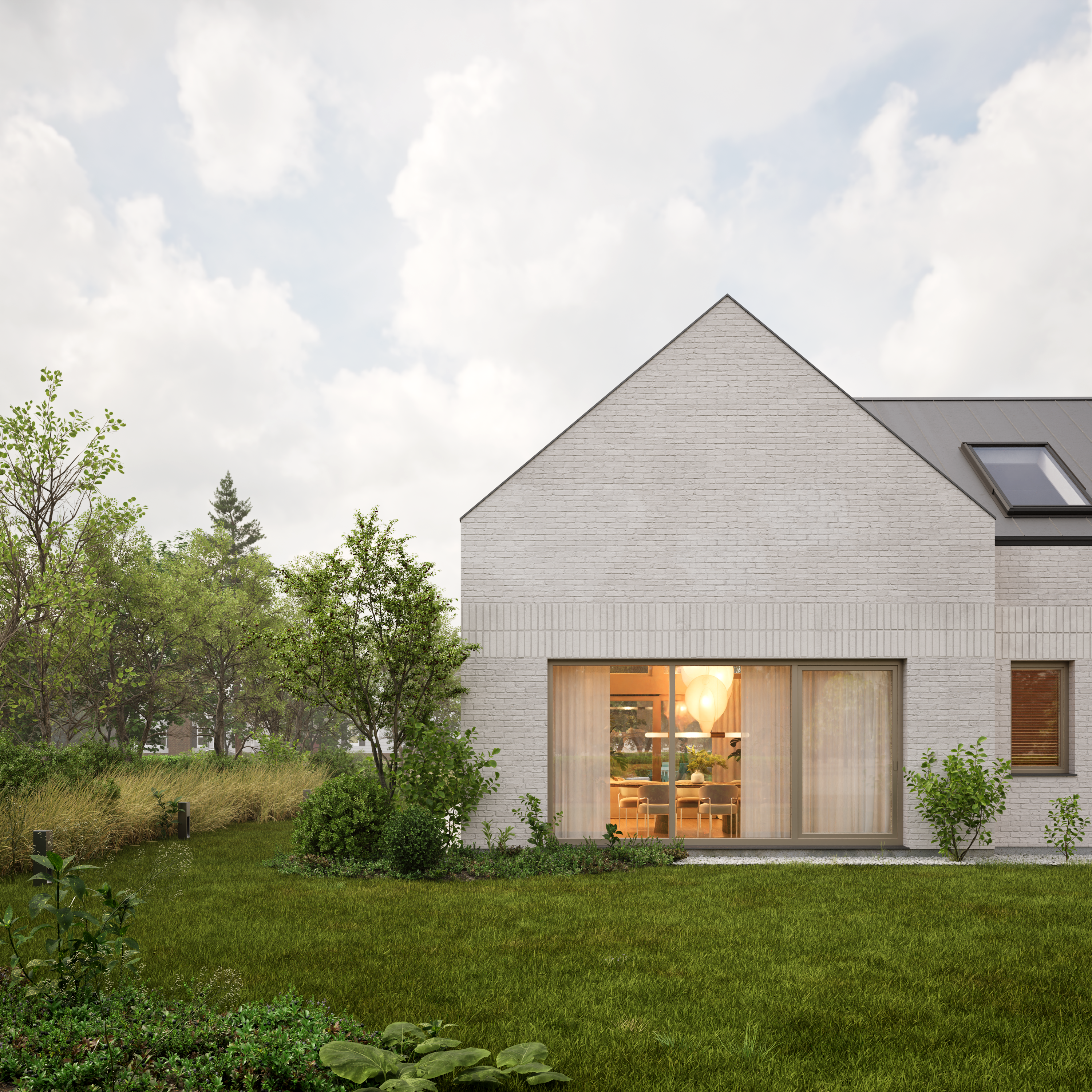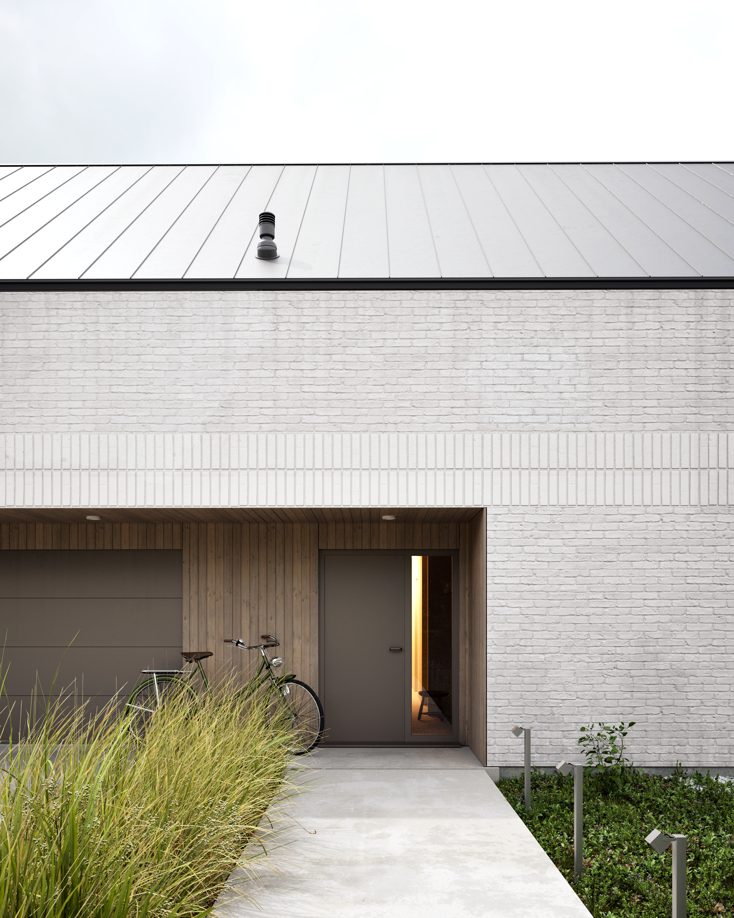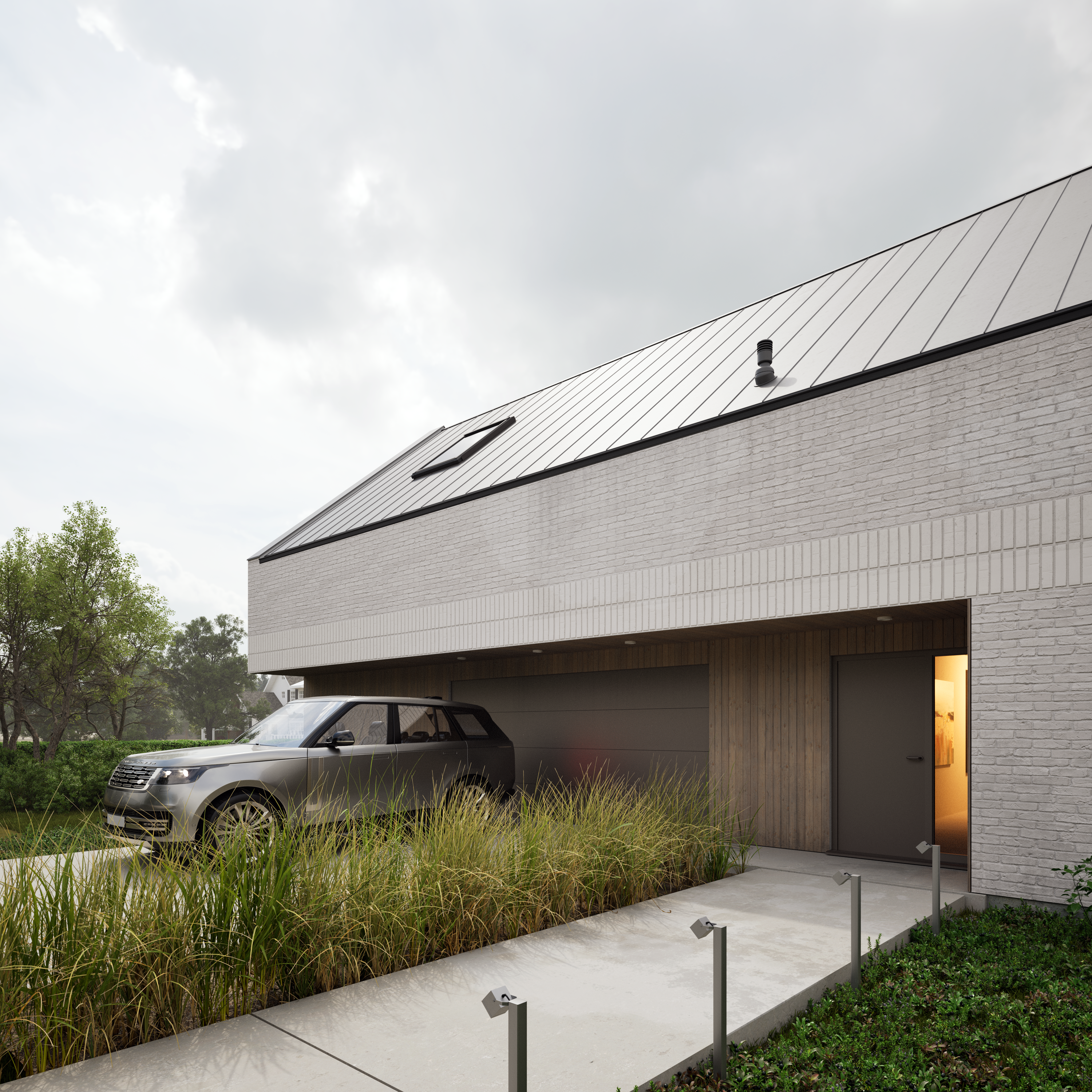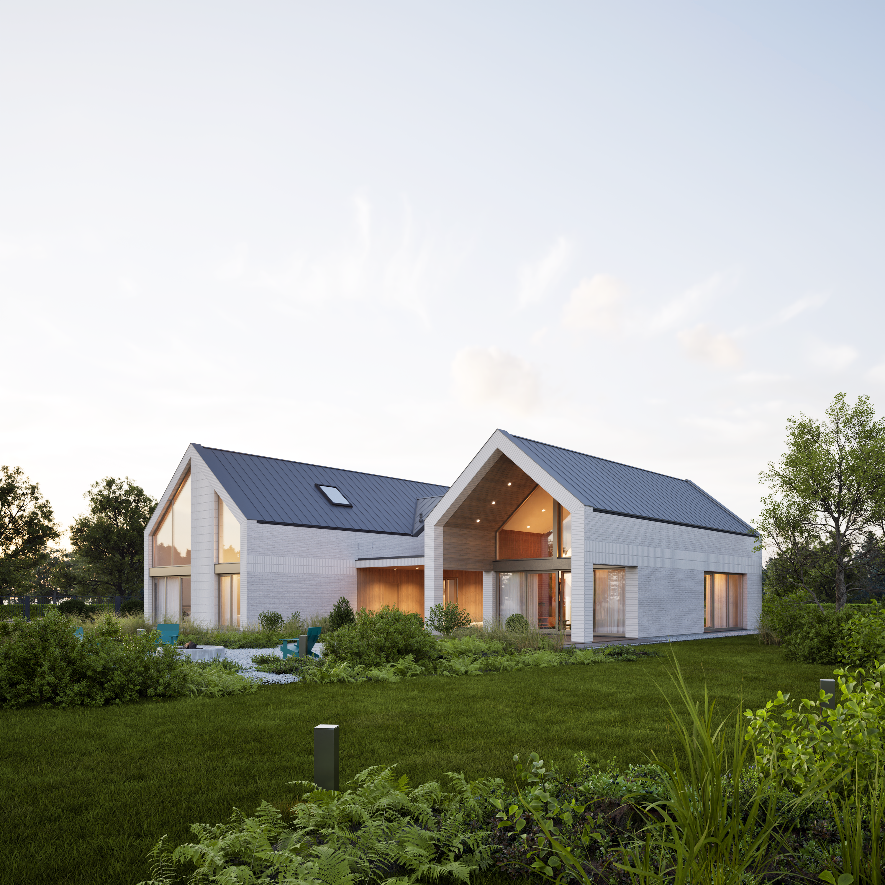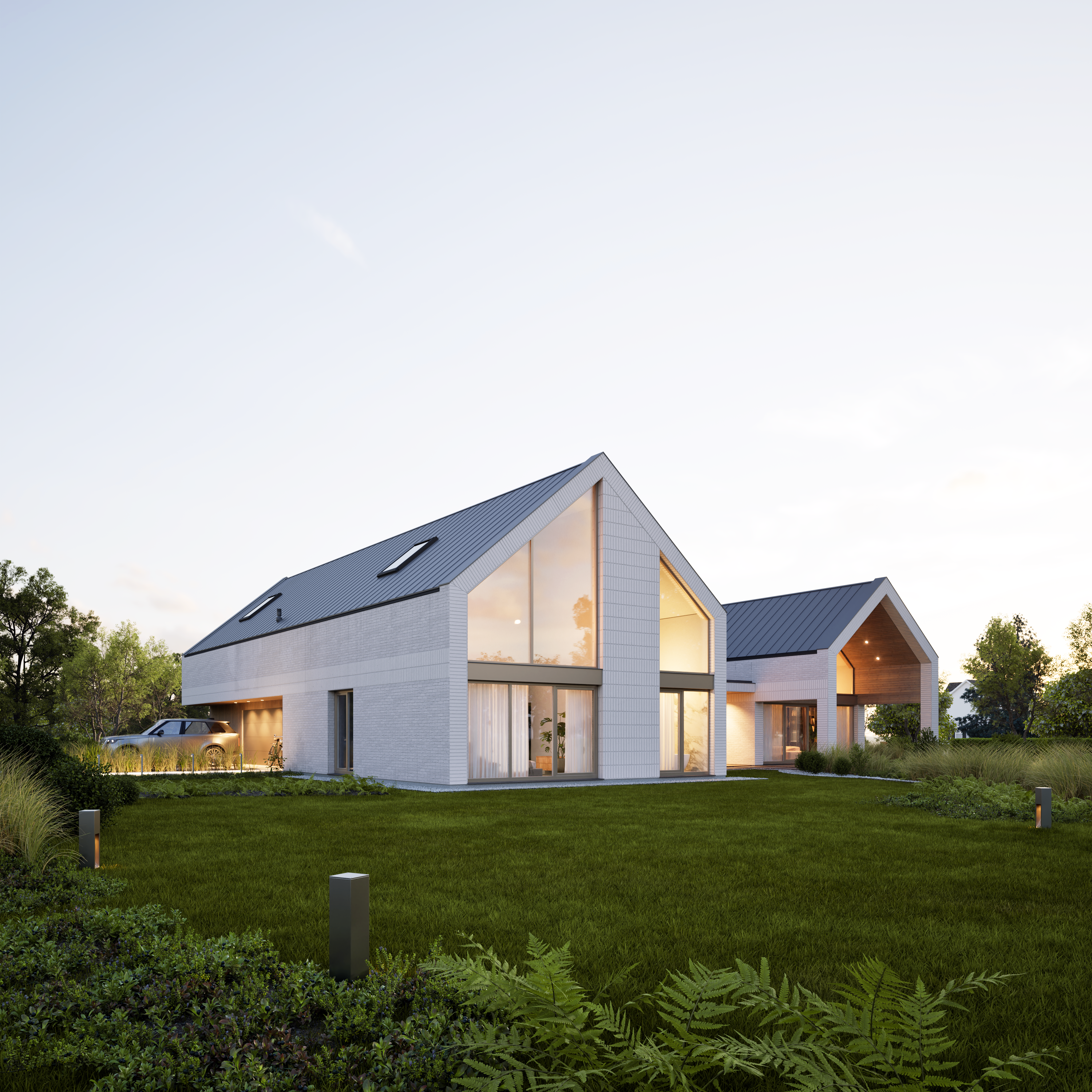 Forma budynku nawiązuje do archetypu domu-stodoły, interpretowanego w sposób współczesny: czysta, dwuspadowa bryła, klarowny detal, naturalne materiały i konsekwencja kompozycyjna. Elewacje wykończono jasną płytką klinkierową, która harmonizuje z polnym otoczeniem i podkreśla spokojny charakter zabudowy. Od strony dojazdu dom przyjmuje bardziej zamkniętą formę, chroniąc prywatność mieszkańców. Od strony ogrodu otwiera się szerokimi przeszkleniami – zarówno w salonie, jak i w sypialni głównej.