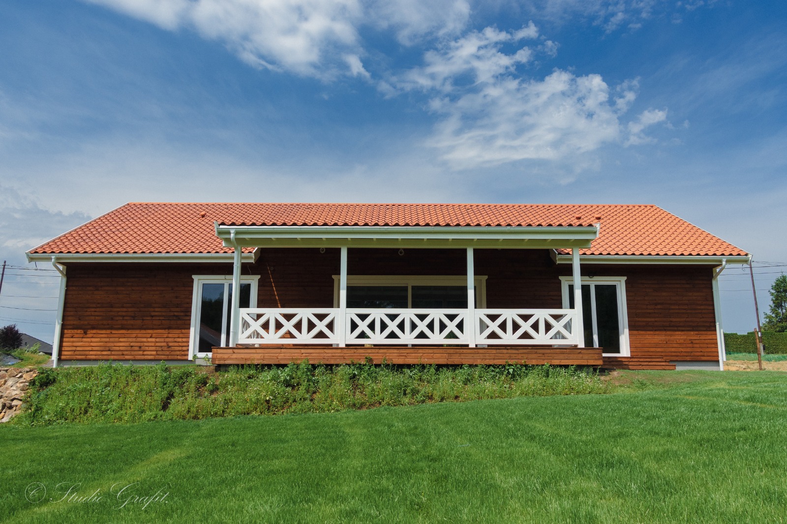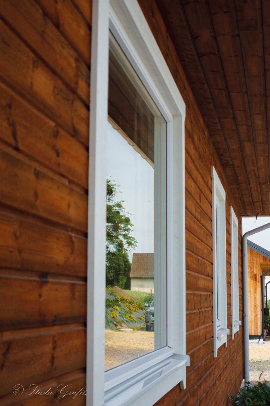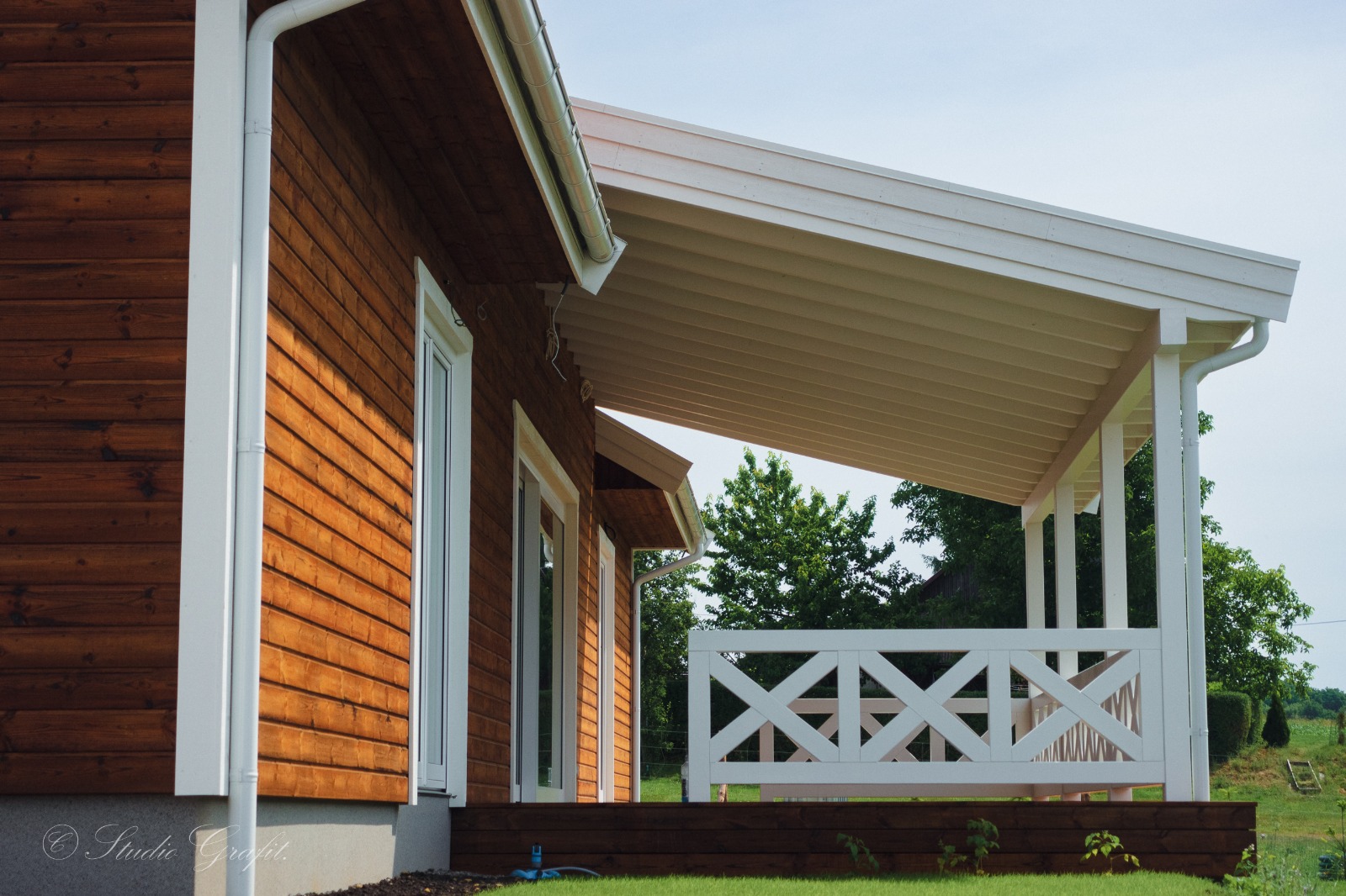 182 m² przestrzeni użytkowej zamknięte w klasycznej, ponadczasowej bryle z ceramiczną dachówką i drewnianą elewacją z wentylowaną ścianą. Jasne, przeszklone wnętrza otwierają się na obszerny, zadaszony taras z widokiem na zieleń – gotowe na długie poranki i jeszcze dłuższe wieczory.