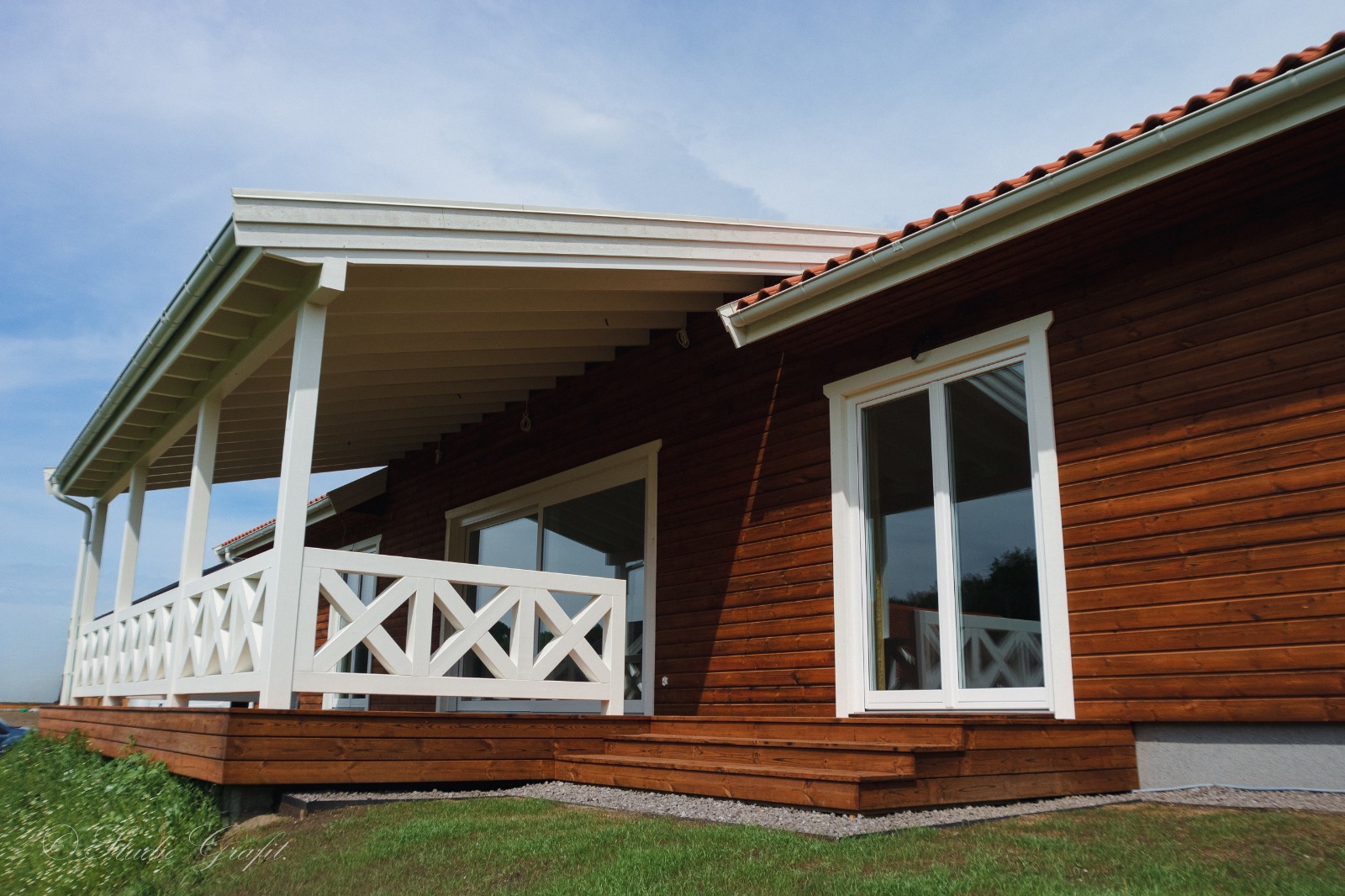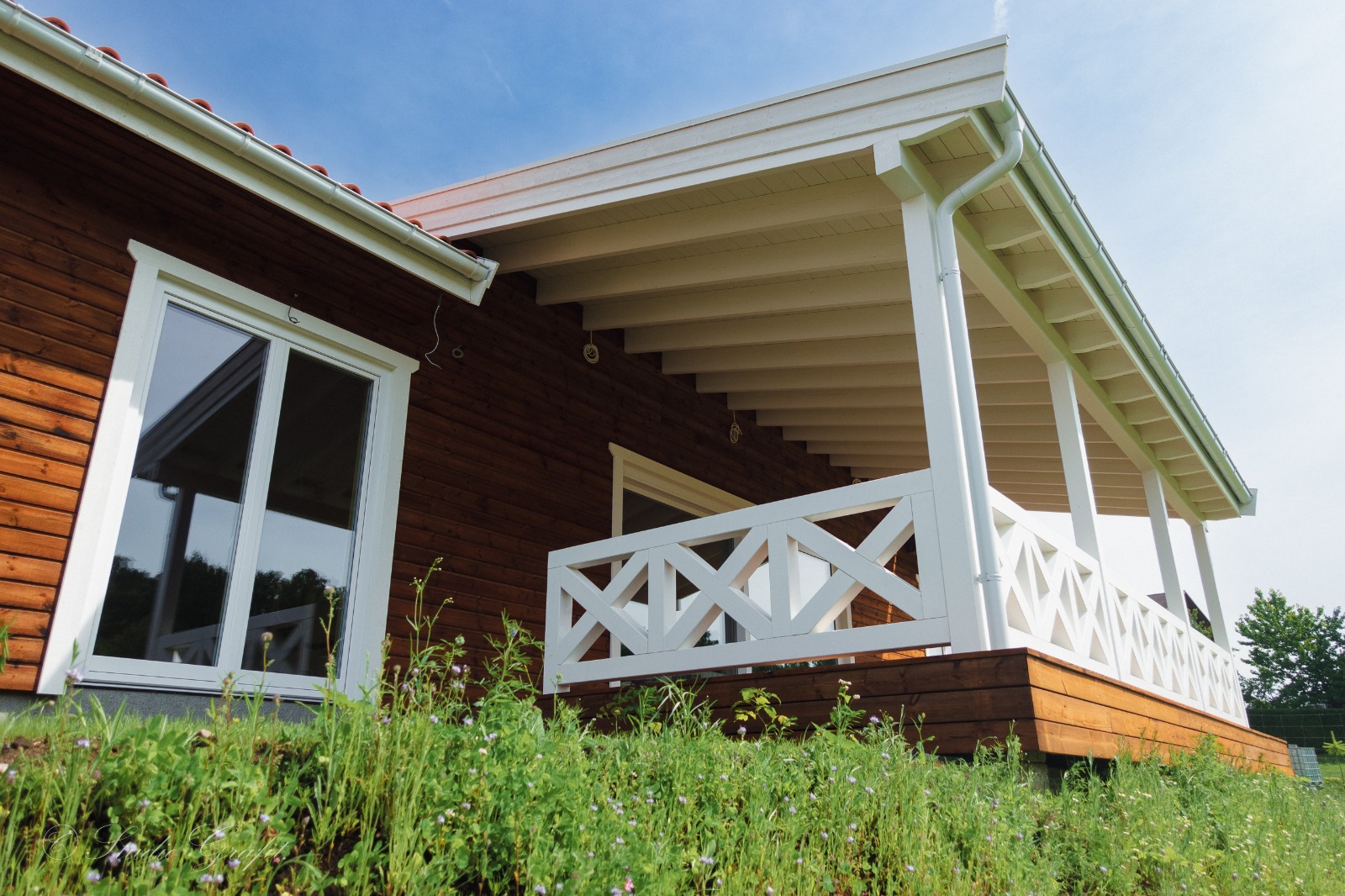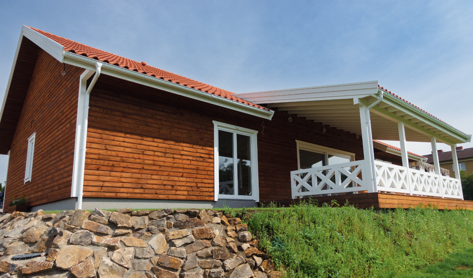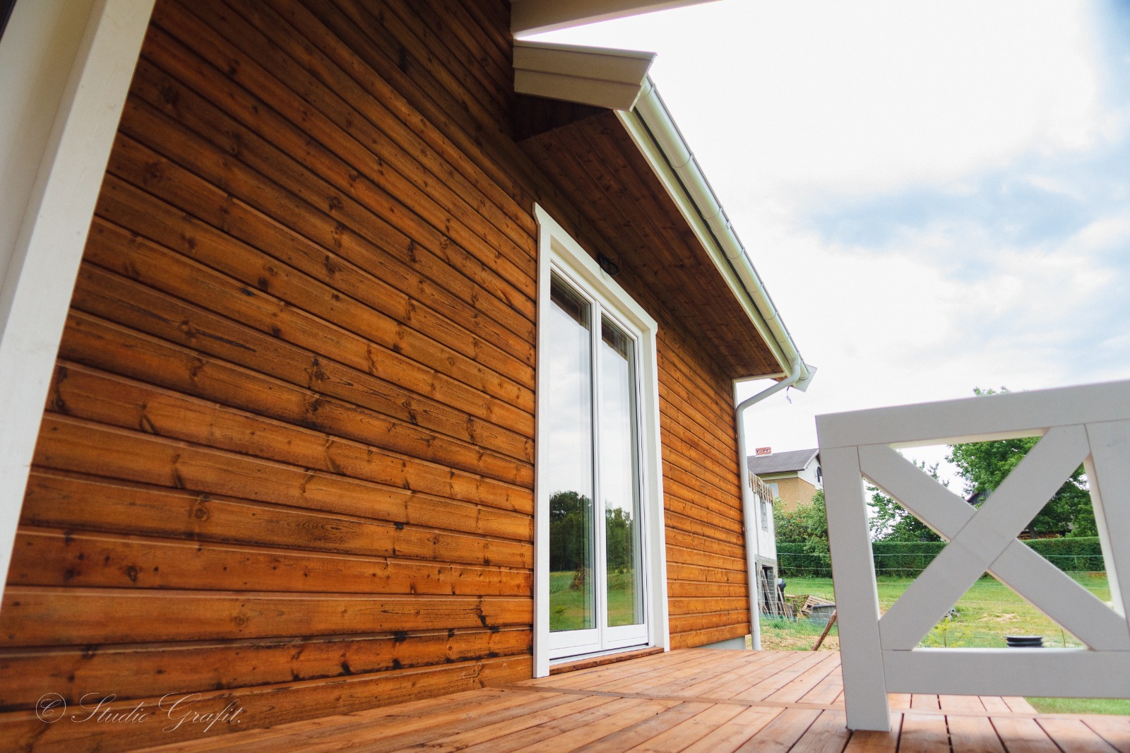 182 m² przestrzeni użytkowej zamknięte w klasycznej, ponadczasowej bryle z ceramiczną dachówką i drewnianą elewacją z wentylowaną ścianą. Jasne, przeszklone wnętrza otwierają się na obszerny, zadaszony taras z widokiem na zieleń – gotowe na długie poranki i jeszcze dłuższe wieczory.