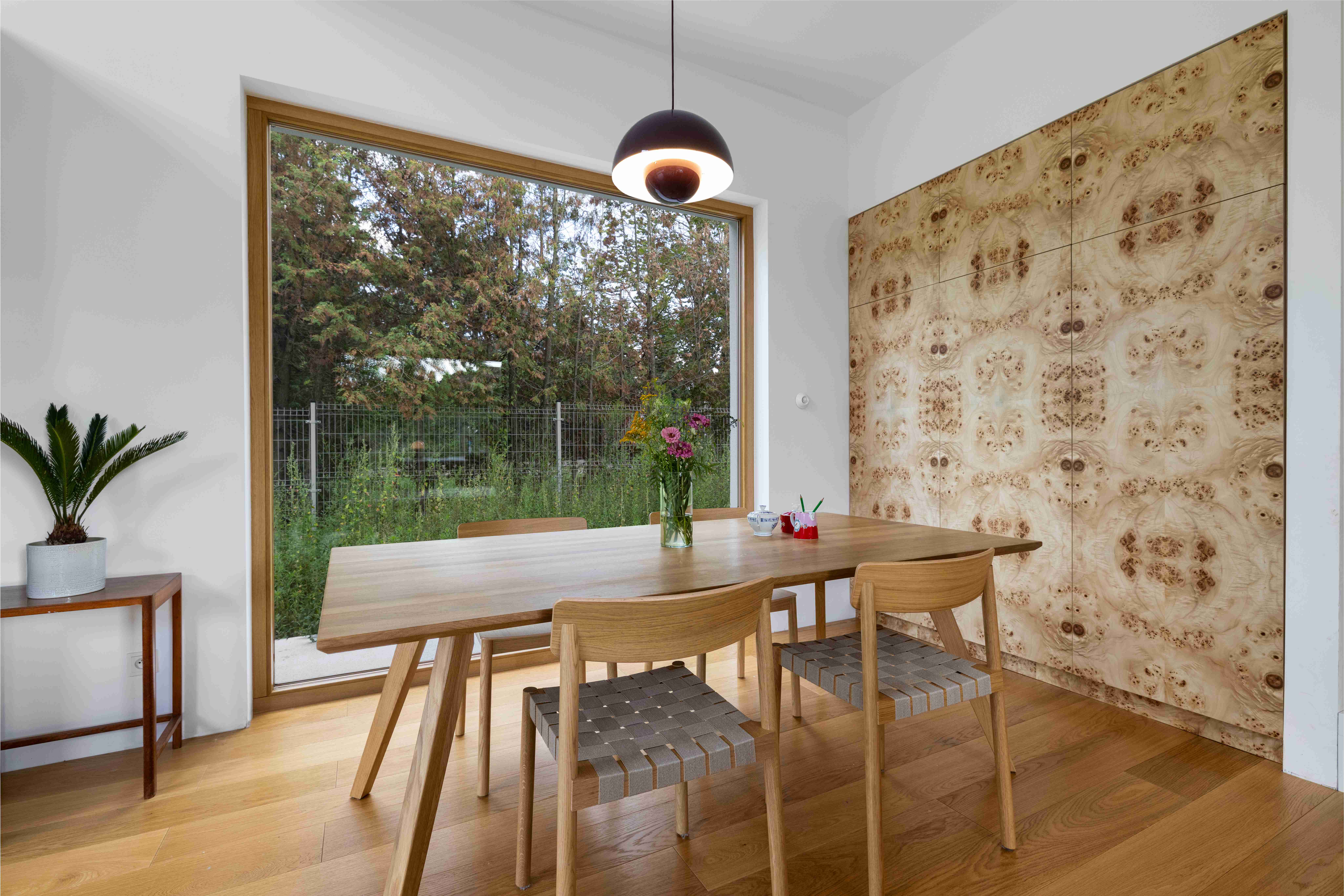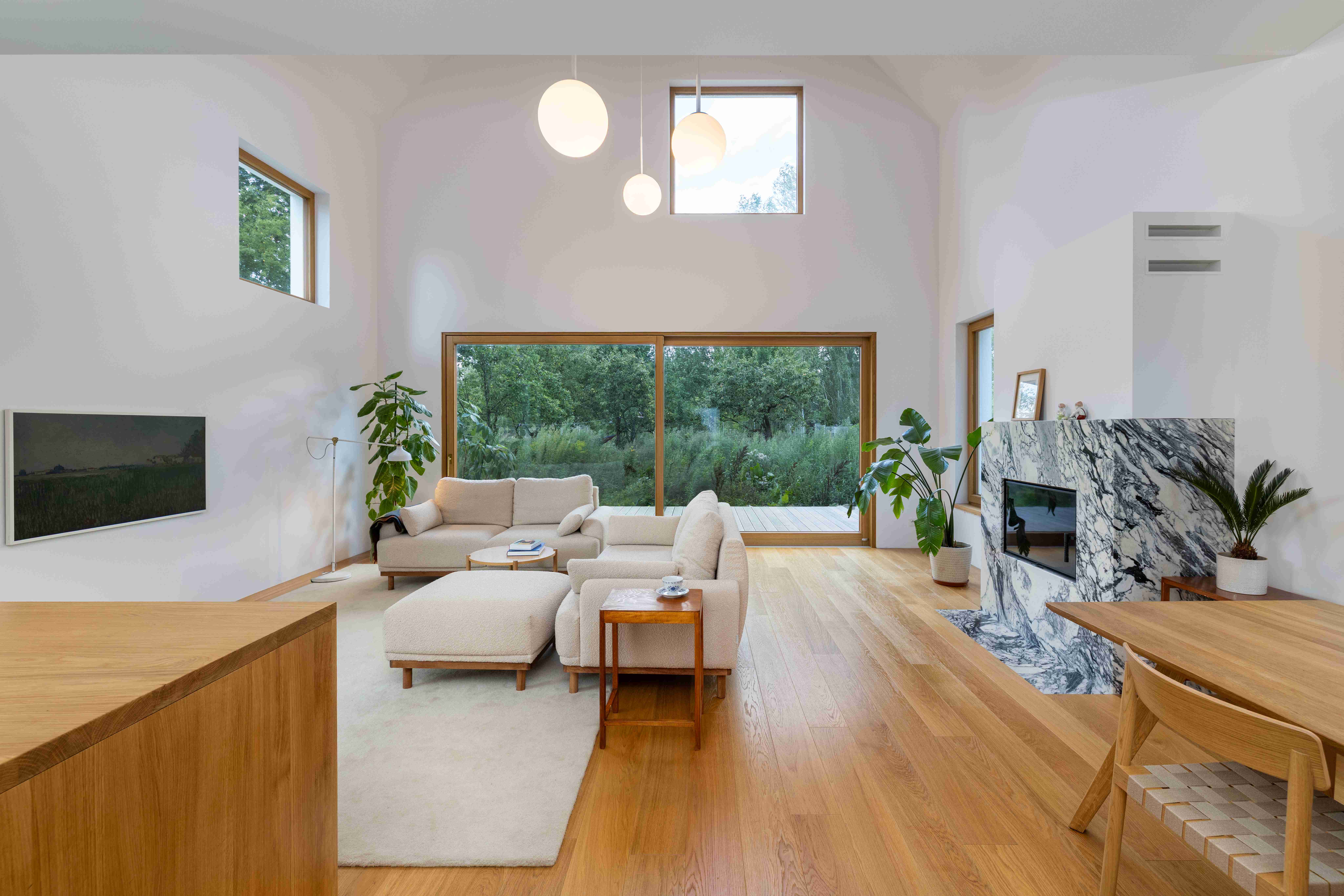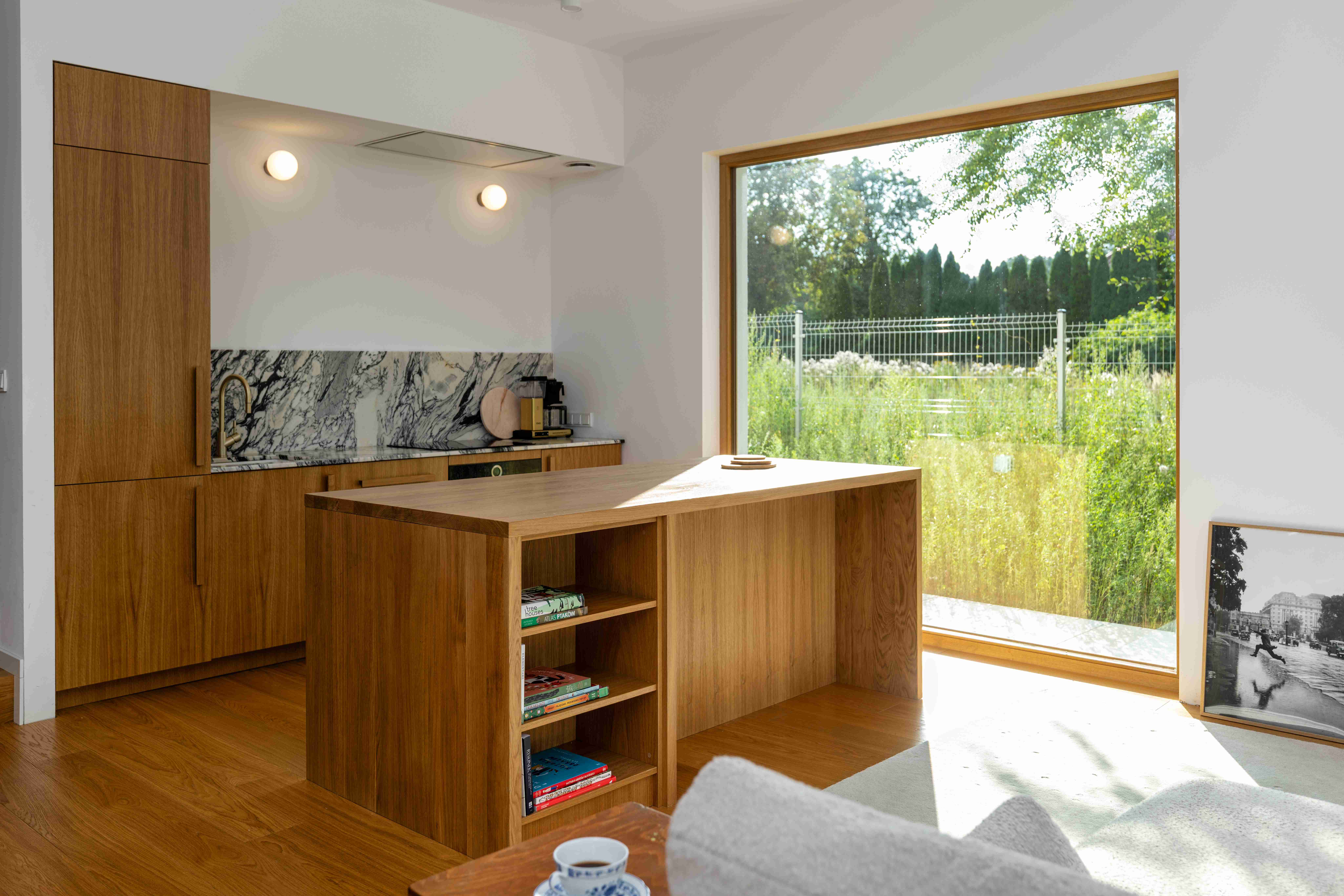 Za wyjątkowy charakter domu odpowiada również stolarka okienna marki Nardos – polskiej firmy, która od lat łączy tradycję rzemiosła z nowoczesną technologią. Ich okna z naturalnego drewna nie tylko podkreślają bliskość z przyrodą, ale też wprowadzają do wnętrza ciepło i autentyczność. Nardos tworzy rozwiązania, które nie dominują nad architekturą, lecz stają się jej integralną częścią – subtelnym łącznikiem między wnętrzem a światem zewnętrznym.