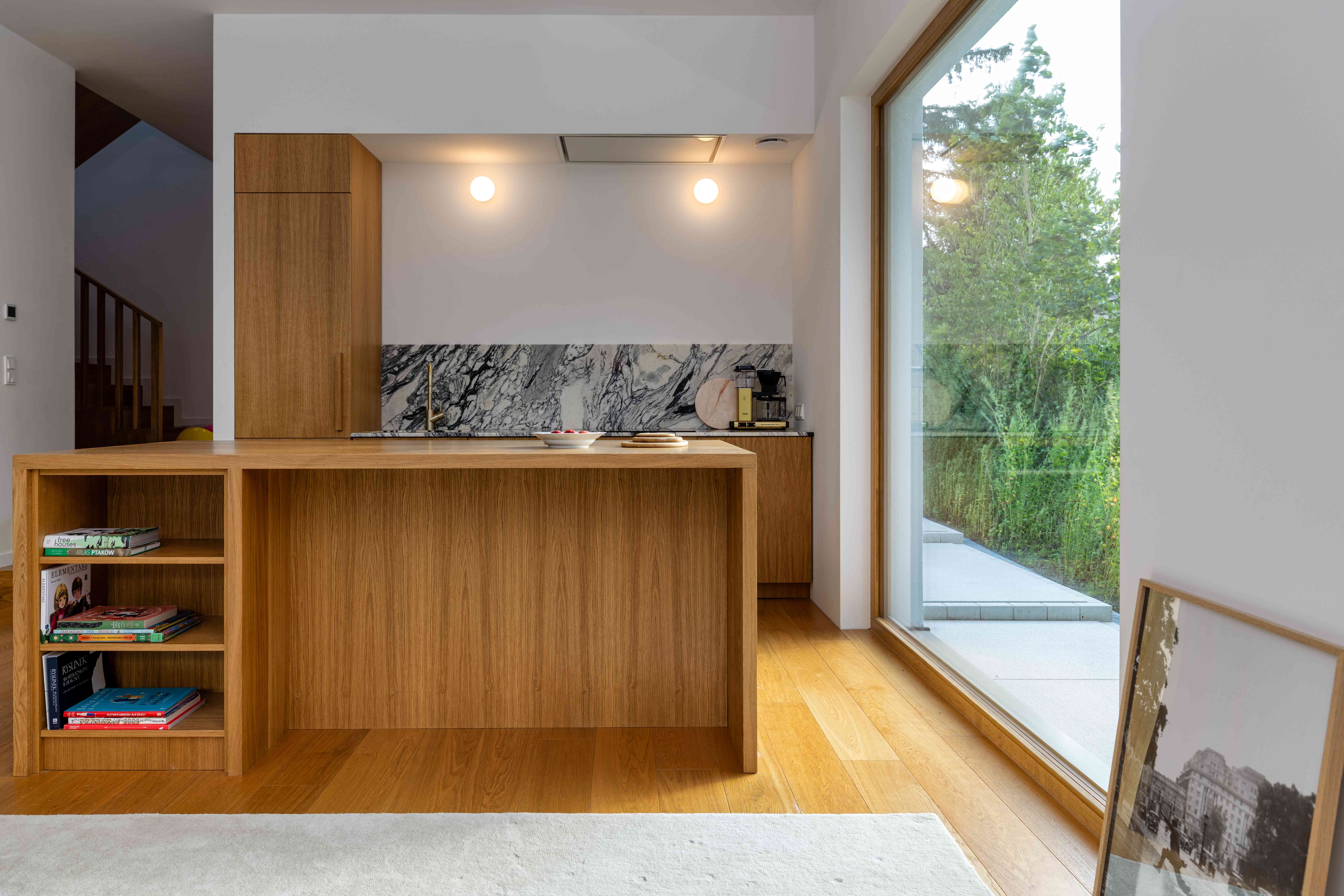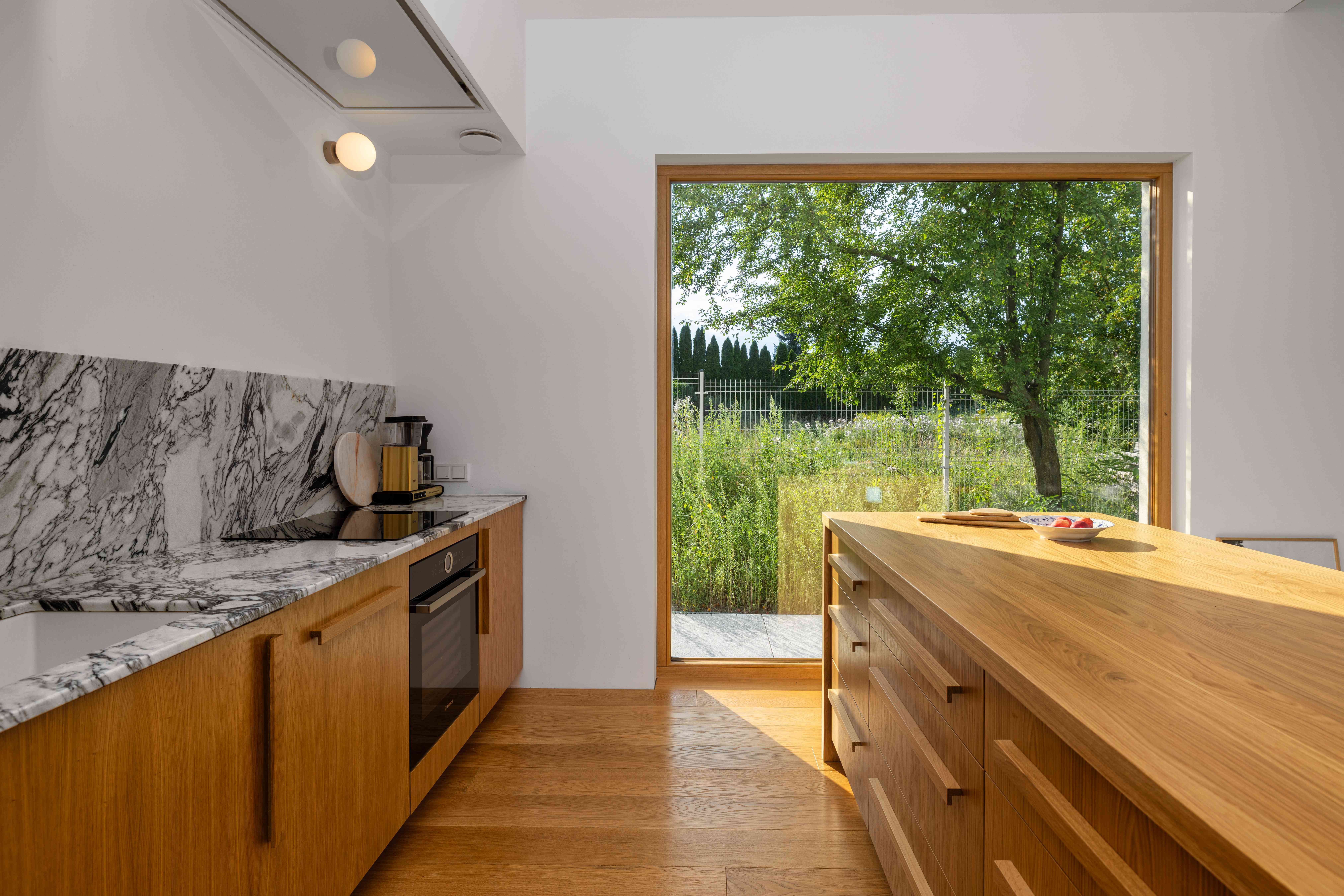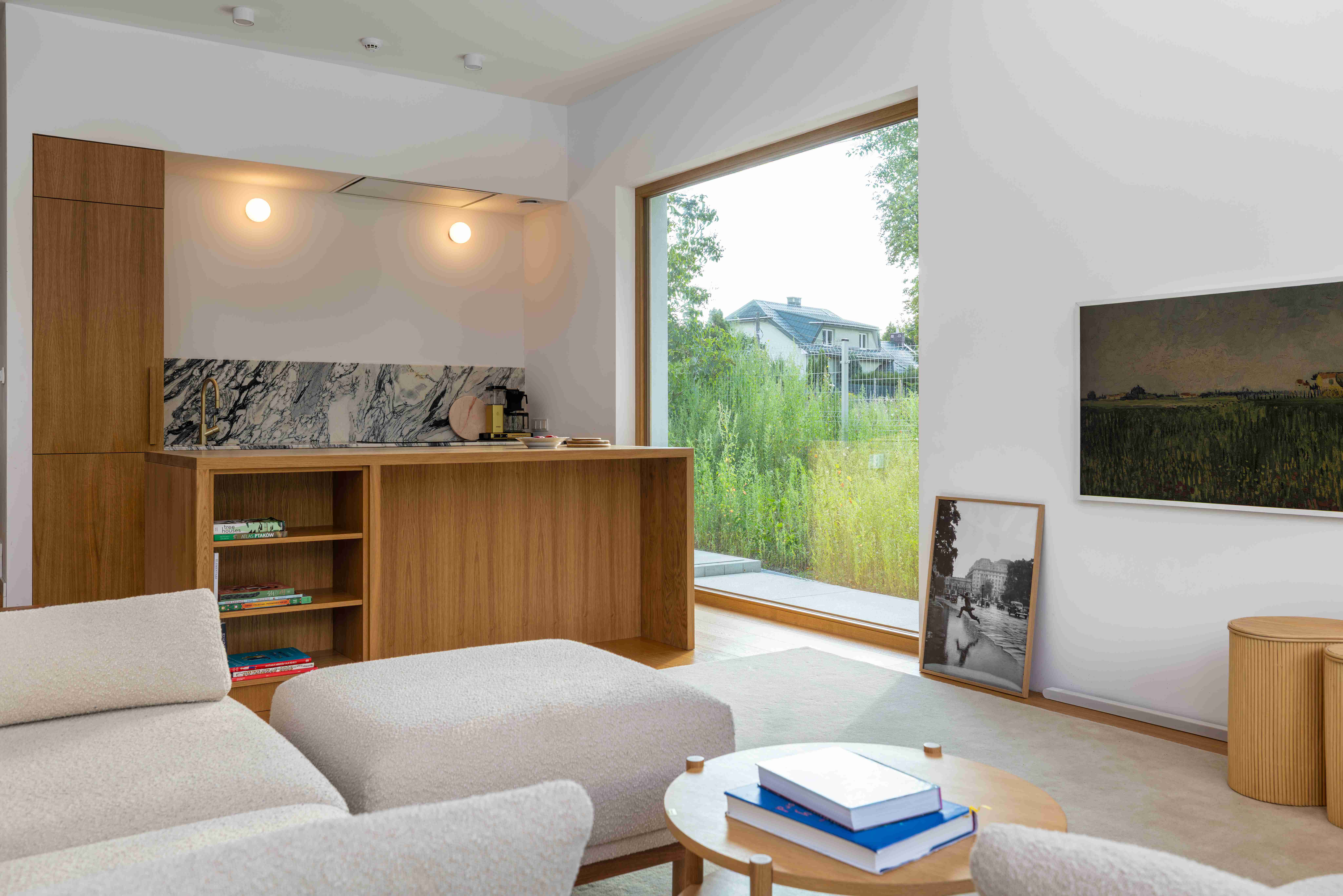 Za wyjątkowy charakter domu odpowiada również stolarka okienna marki Nardos – polskiej firmy, która od lat łączy tradycję rzemiosła z nowoczesną technologią. Ich okna z naturalnego drewna nie tylko podkreślają bliskość z przyrodą, ale też wprowadzają do wnętrza ciepło i autentyczność. Nardos tworzy rozwiązania, które nie dominują nad architekturą, lecz stają się jej integralną częścią – subtelnym łącznikiem między wnętrzem a światem zewnętrznym.