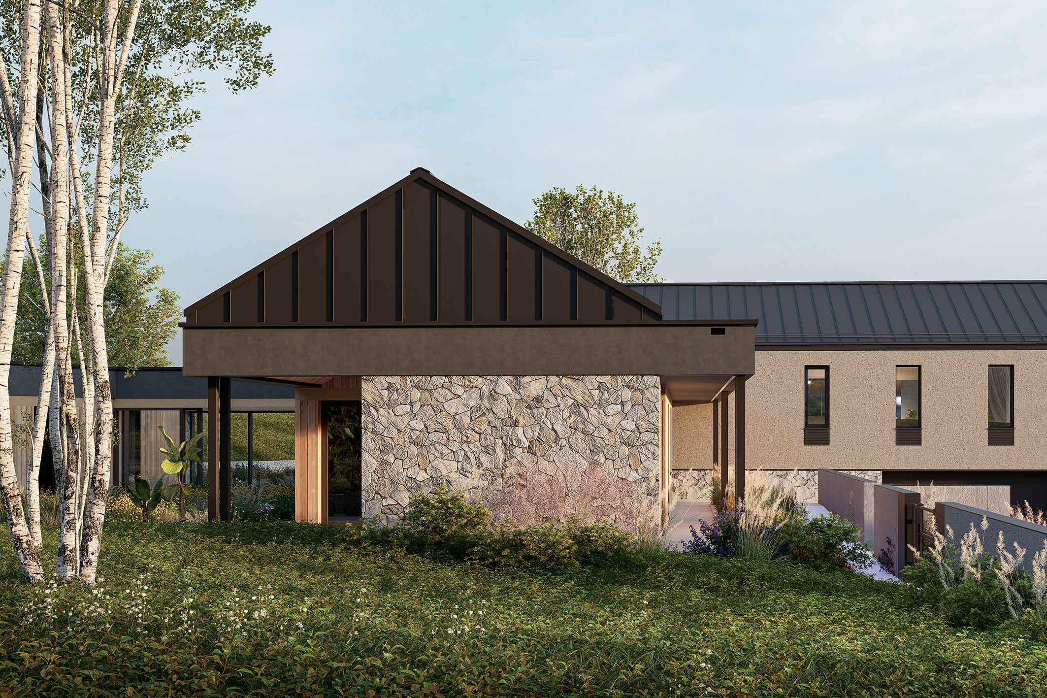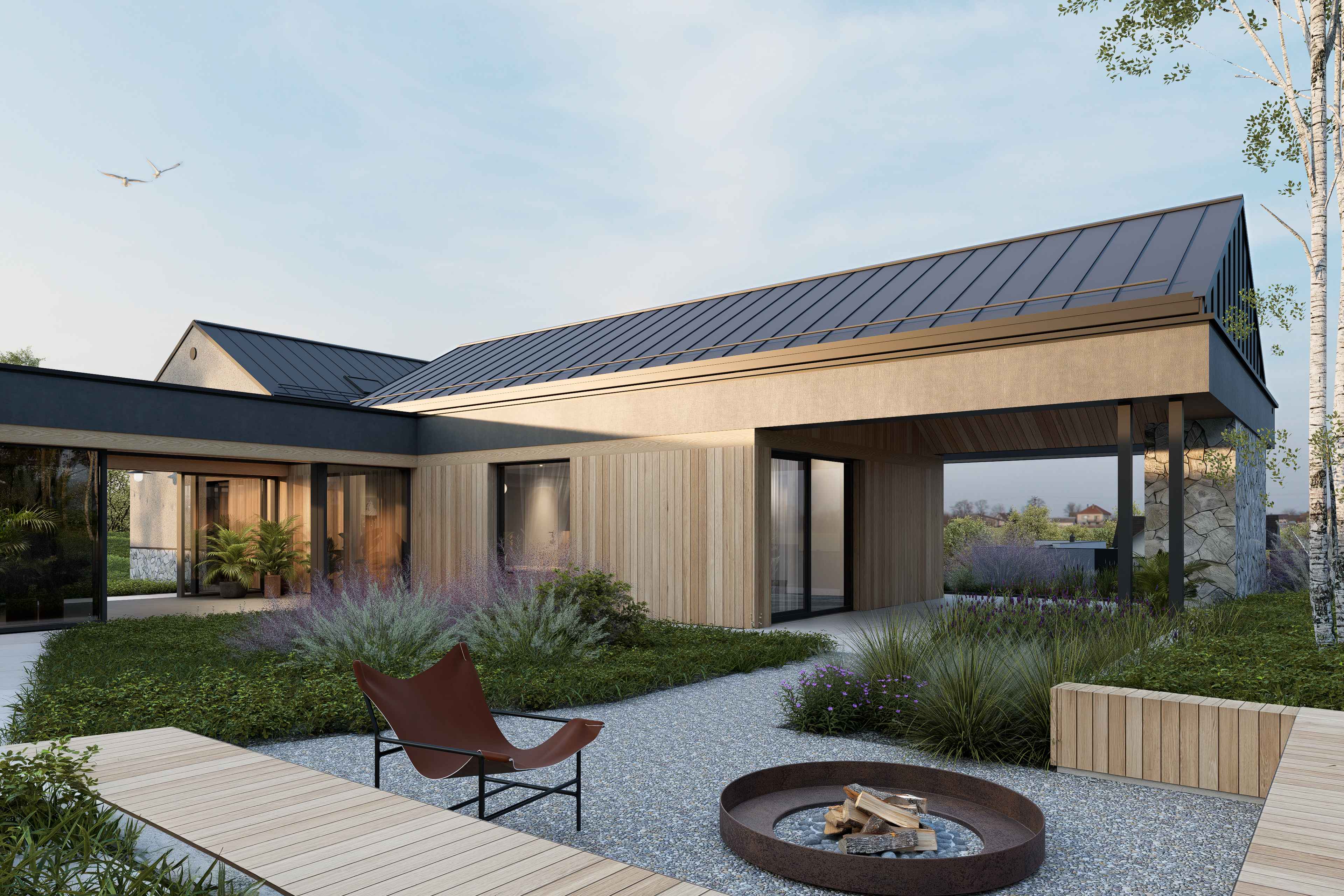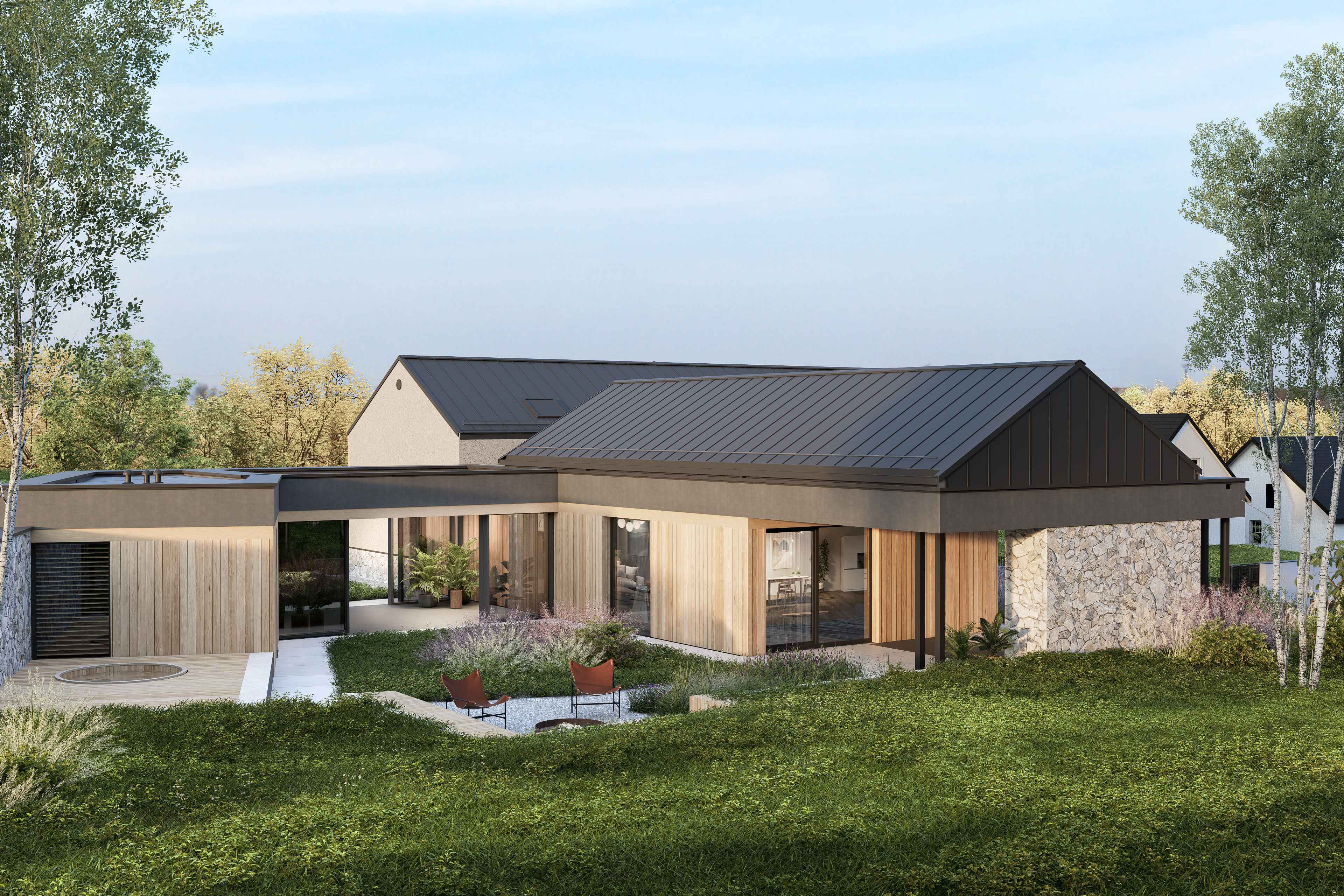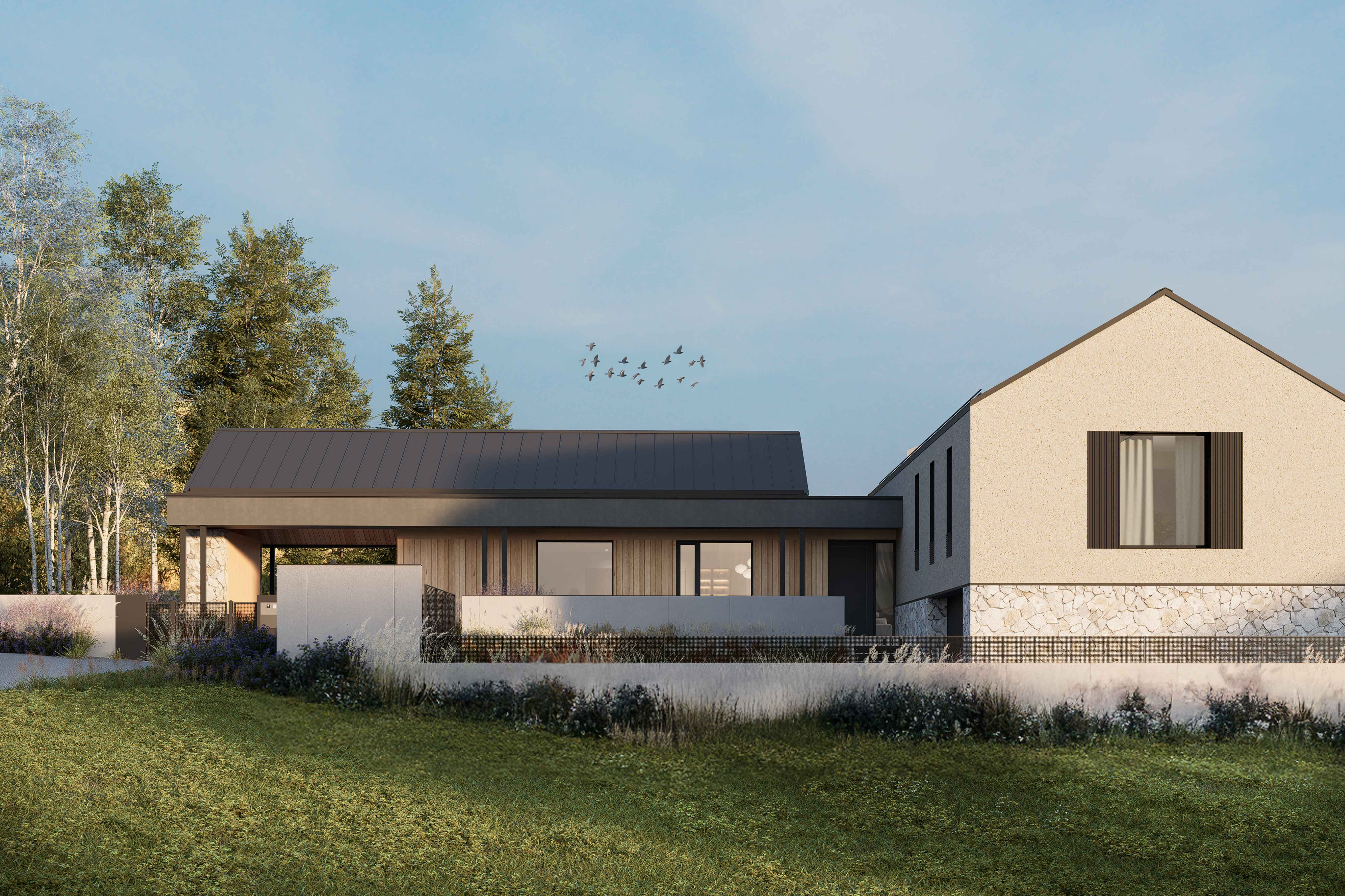 Najniżej, w obniżeniu terenu, ulokowano garaż oraz strefy techniczne – dyskretne, osłonięte i naturalnie odseparowane od części mieszkalnej. Pół piętra wyżej otwiera się część dzienna: salon, jadalnia i kuchnia tworzą serce domu, rozpięte na panoramiczny widok na park krajobrazowy. Nad garażem, o kolejne pół piętra wyżej, zaplanowano część nocną z sypialniami dziecięcymi – spokojniejszą, bardziej intymną, z wyraźnym oddzieleniem od strefy dziennej.