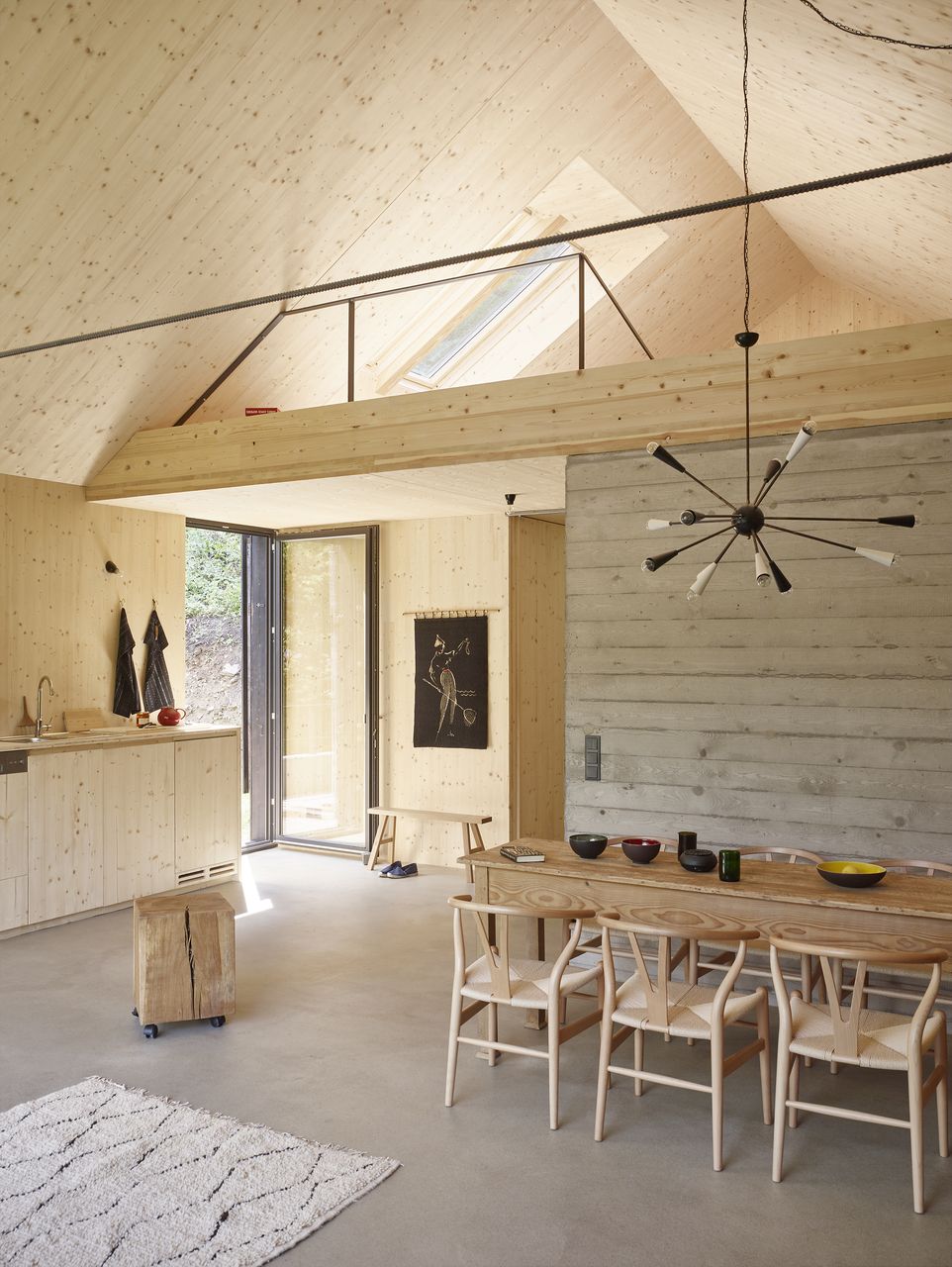 Wnętrza domu utrzymano w jasnym, naturalnym drewnie świerkowym, a podłogi wykończono polerowanym jastrychem. Centralnym punktem jest przestronny salon z drewnianym aneksem kuchennym i dużym stołem jadalnianym. Prawie całą wschodnią fasadę zajmuje panoramiczne okno, z którego rozpościera się widok na taflę jeziora. Biurko ustawione przed nim pozwala na pracę w otoczeniu natury, a drewniane schody prowadzą do galerii o powierzchni 36 m², którą można wykorzystać jako dodatkowy pokój gościnny lub miejsce relaksu.