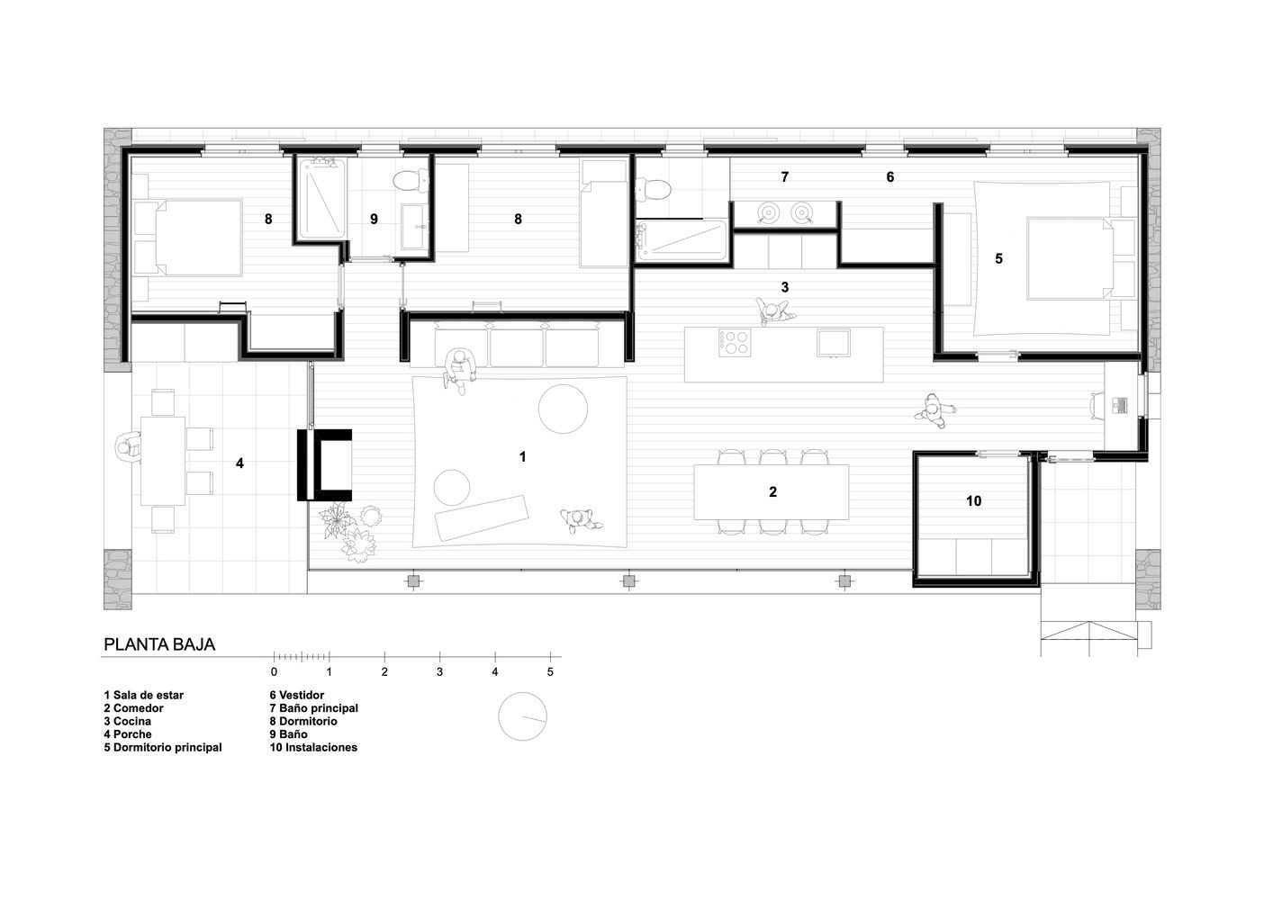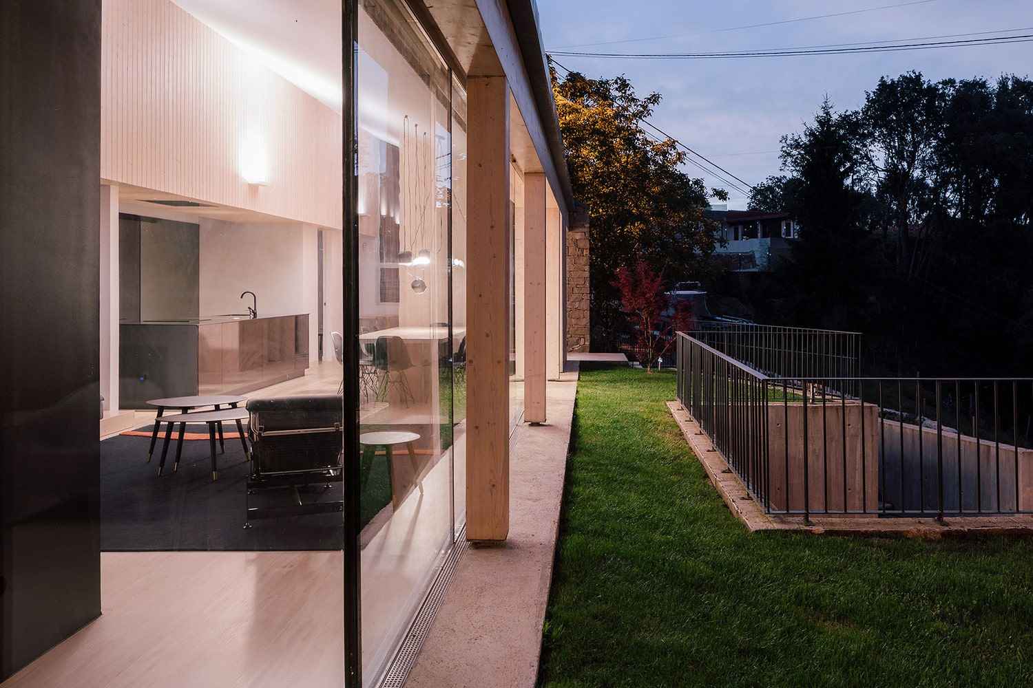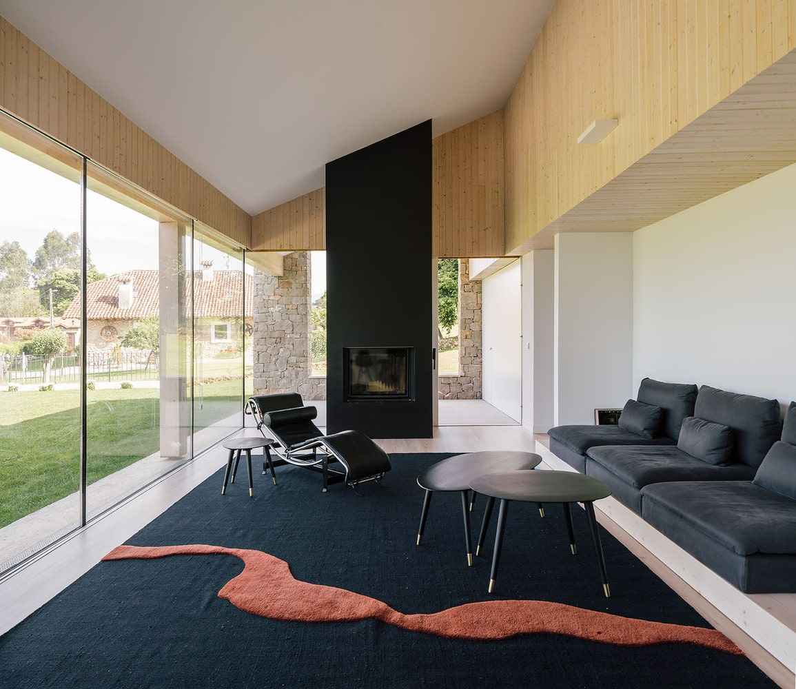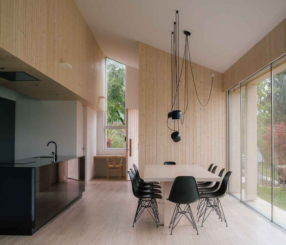 Dom Llana to nowoczesna stodoła o podłużnym układzie, z murowanymi szczytami od północy i południa oraz ścianami z drewna i szkła od wschodu i zachodu. Zachodnia część budynku tworzy strefę wypoczynkową, częściowo zadaszoną i oszkloną, idealną do relaksu. Wnętrze łączy salon, kuchnię i jadalnię z przegubową drewnianą bryłą, w której mieści się pomieszczenie gospodarcze. Przestrzeń wspólna Solana dzięki przeszklonej fasadzie i drewnianym słupom łączy wnętrze z naturą, a kominek i lustra w kuchni wzmacniają efekt kontaktu z otoczeniem.