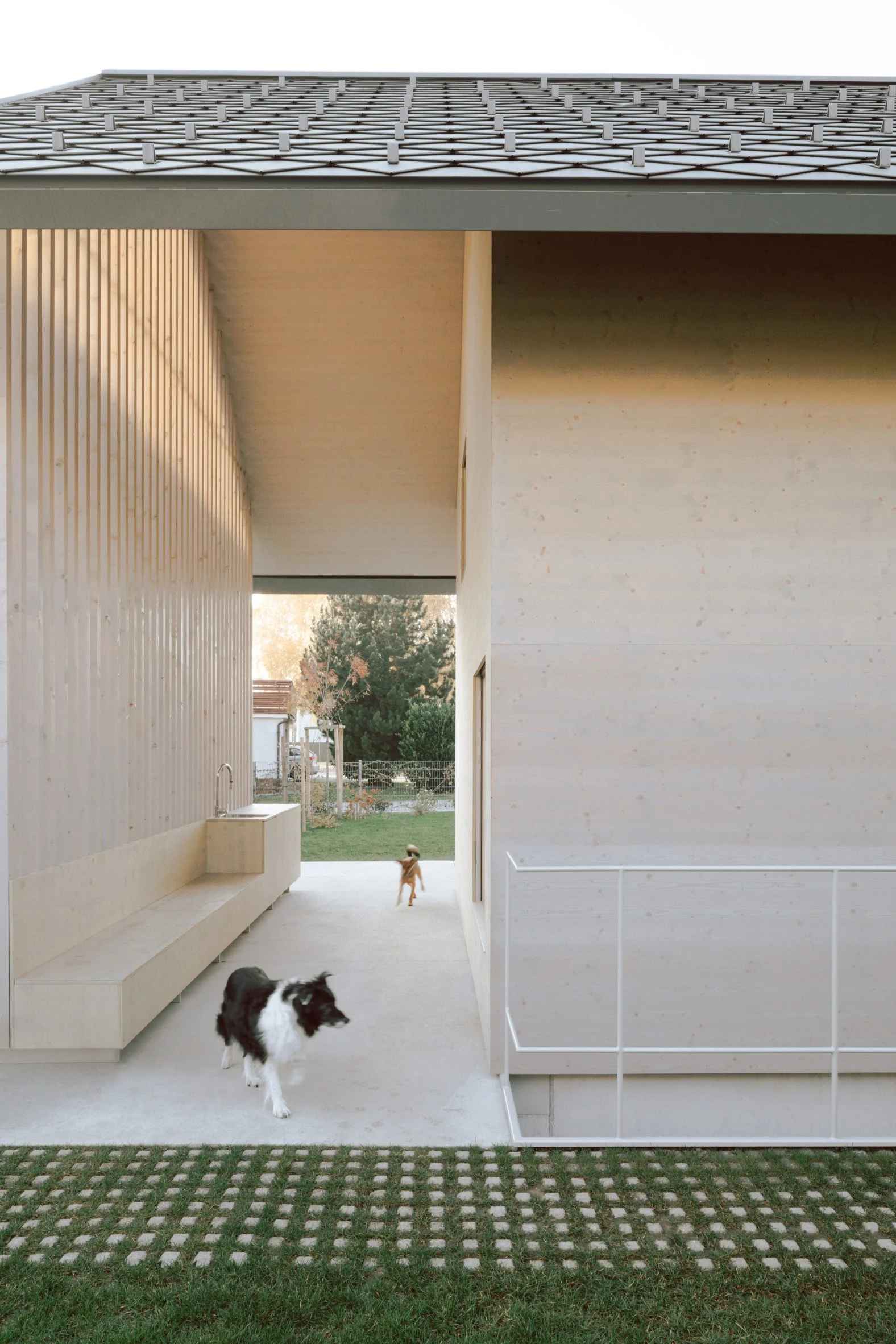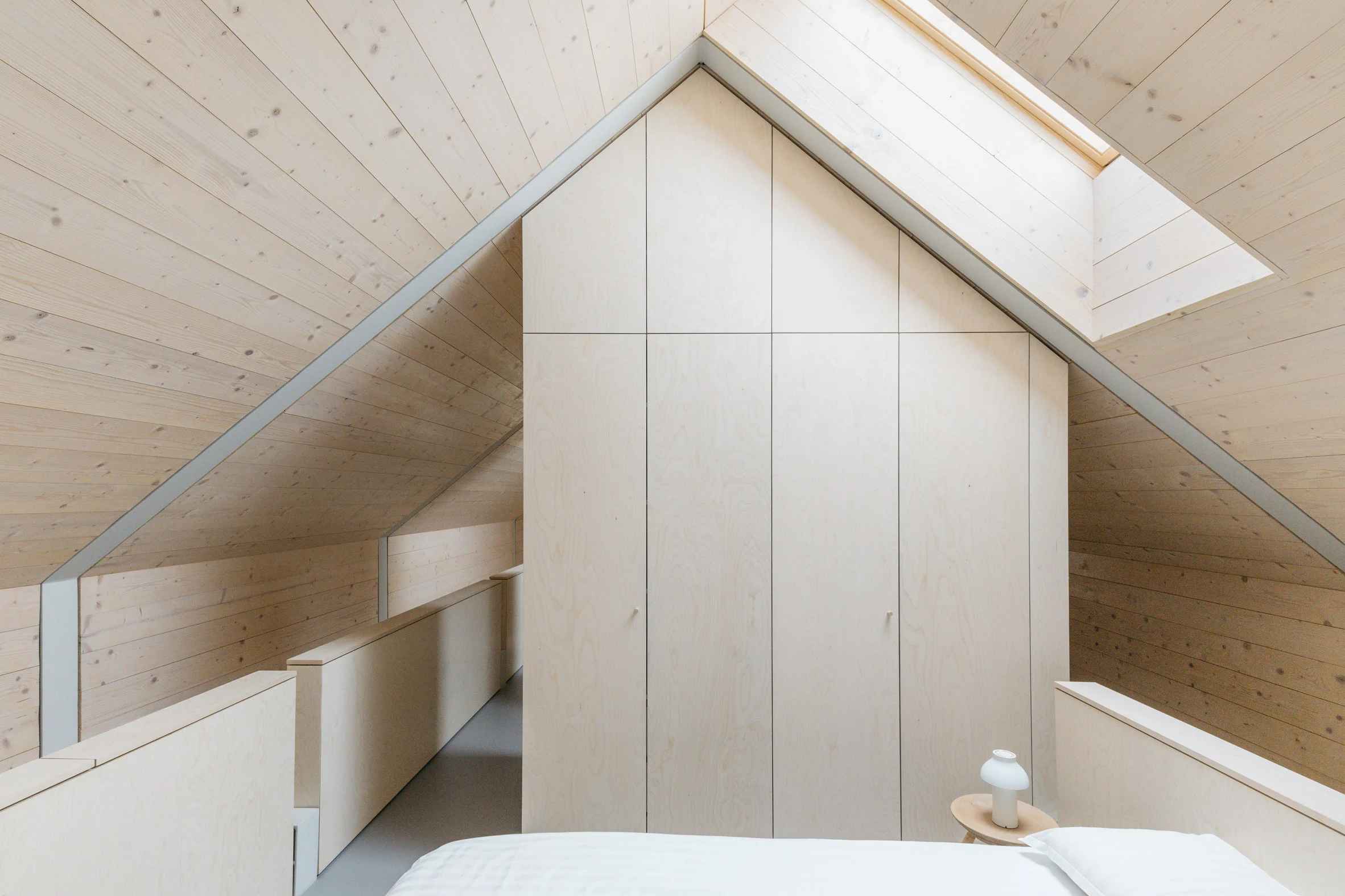 Renowacja objęła zachowanie oryginalnych ceglanych elewacji, wymianę starego dachu na nowy metalowy oraz rozbudowę budynku poprzez nowoczesną, drewnianą dobudówkę. Nowy element konstrukcji płynnie wpisuje się w dwuspadowy profil domu, jednak wewnętrznie został wyłożony jasnym drewnem, co podkreśla jego współczesny charakter. Architekci zachowali duch oryginalnej konstrukcji, oddzielając nowe interwencje materiałowe od istniejącej struktury. Wnętrza zyskały nowe życie – centralnie ulokowana przestrzeń dzienna została otwarta na ogród dzięki dużym przesuwanym szklanym drzwiom, a nad nią znajduje się sypialnia na antresoli. Wszystko wspiera stalowa konstrukcja, oparta na oryginalnych ścianach.