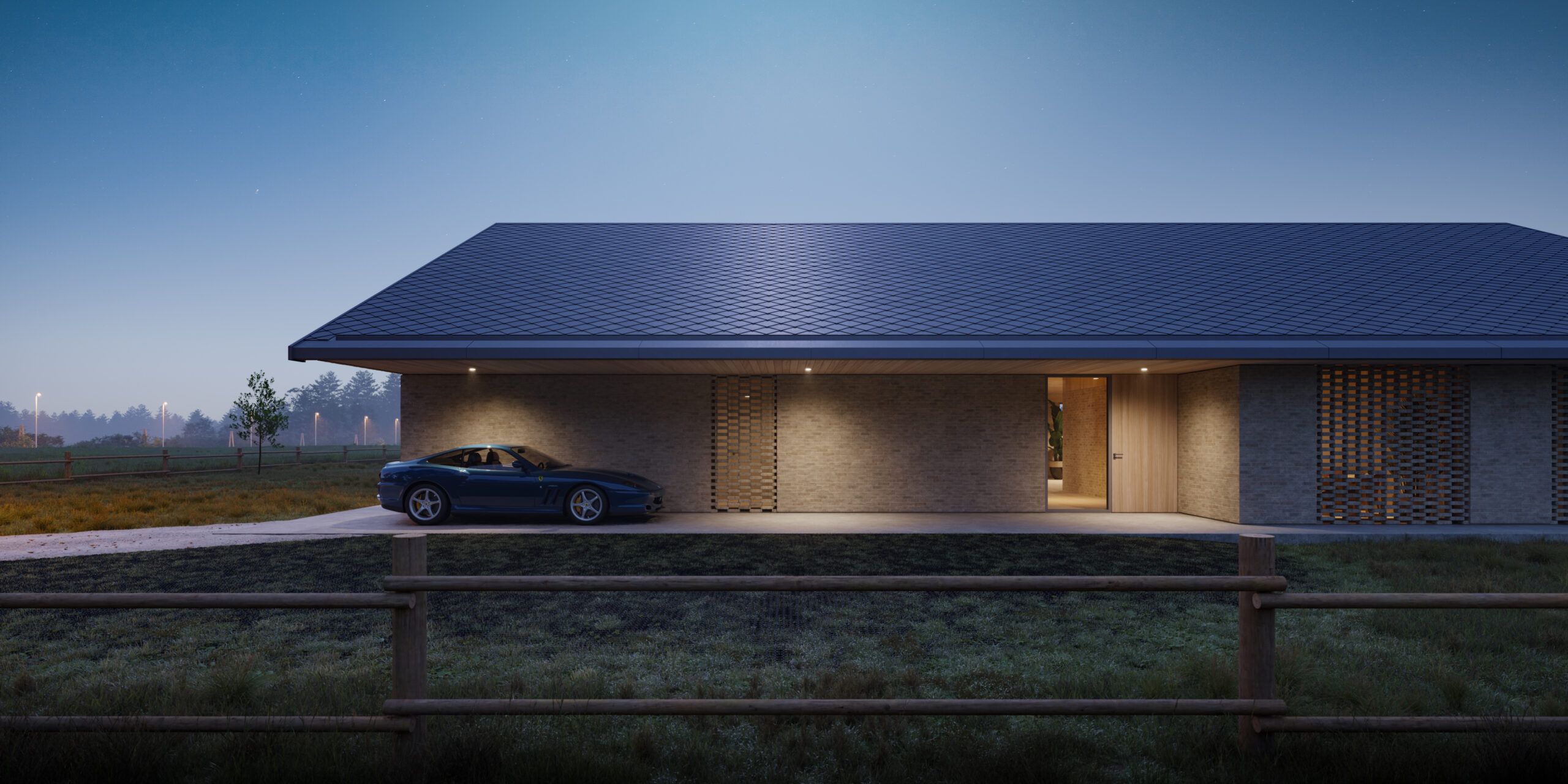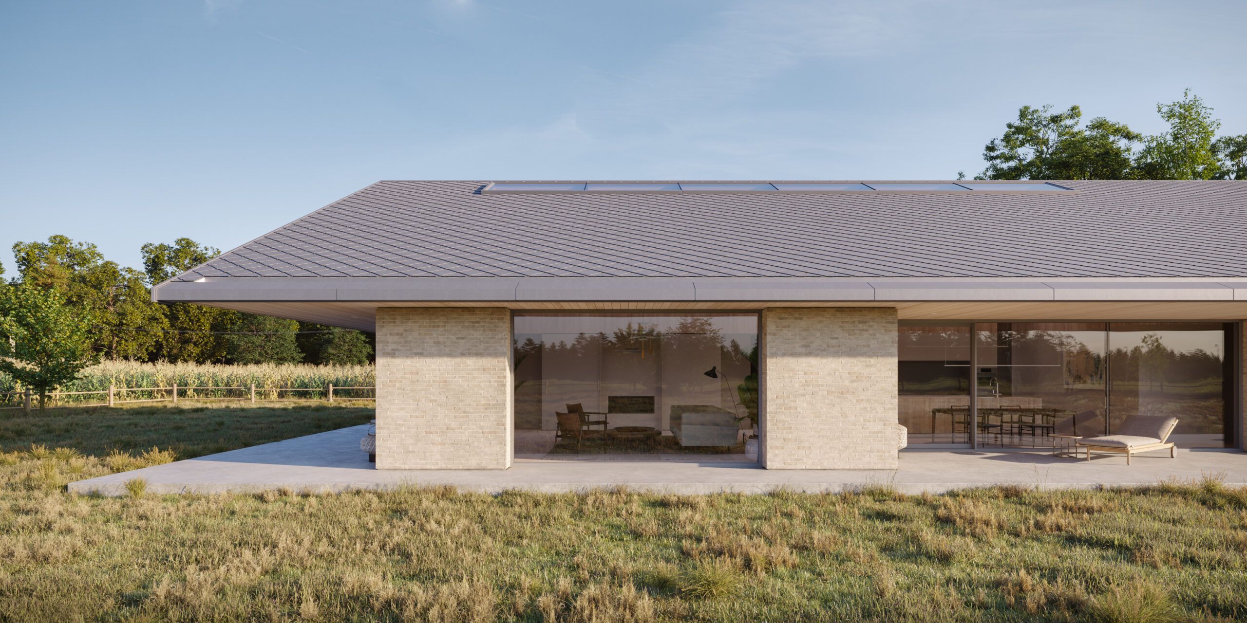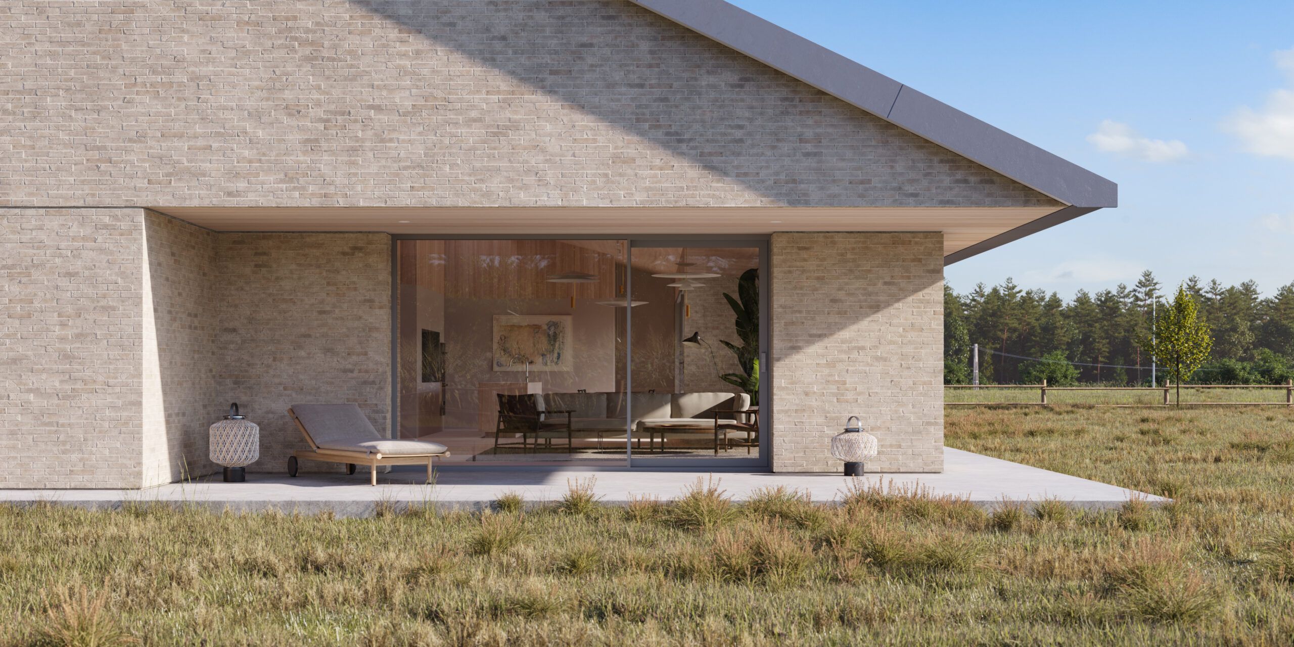 Materiały wykończeniowe i kolorystyka domu harmonizują z otoczeniem, co nadaje mu naturalny i spójny charakter. Elewacja wykonana została z wypalonej piaskowej cegły, a dach pokryto kwadratowymi łuskami z patynowanej blachy tytanowo-cynkowej, co podkreśla elegancki, minimalistyczny wygląd nowoczesnej stodoły. Dom o powierzchni użytkowej 239 m² powstaje w Kujawsko-Pomorskiem i stanowi połączenie funkcjonalności z pełnym wkomponowaniem w naturalny krajobraz.