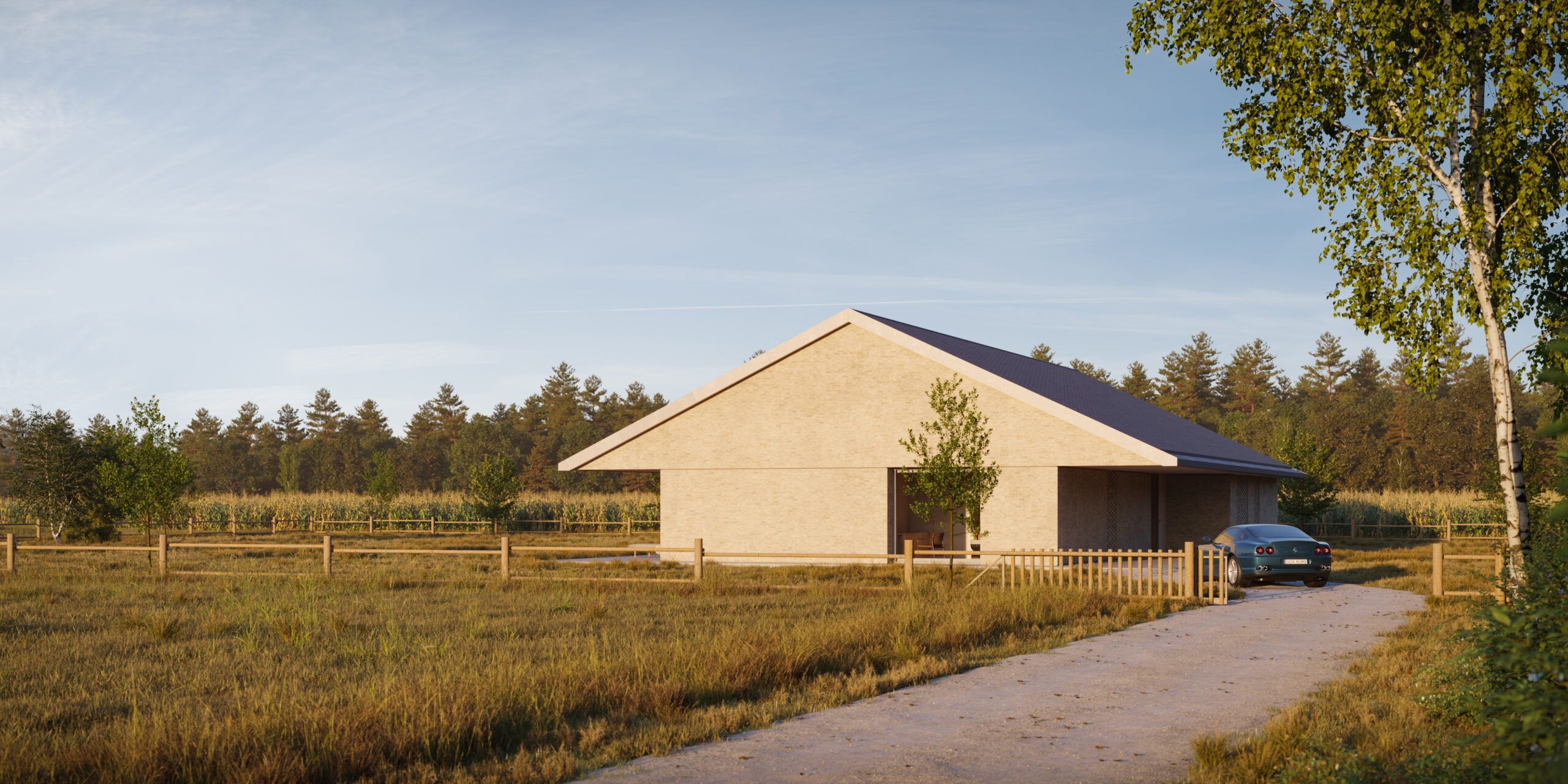 Dom jednorodzinny został zlokalizowany w otoczeniu pól i łąk, z linią horyzontu wykończoną ścianą lasu, co w znaczący sposób wpłynęło na jego formę i układ funkcjonalny. Nowoczesna stodoła wyróżnia się przestronnymi i wysokimi pomieszczeniami, które układają się w logiczne ciągi funkcjonalne, korzystając z pełnego nasłonecznienia oraz codziennej wędrówki słońca. Budynek staje się swoistą sceną dla gry światła i cienia, podkreślając naturalny rytm dnia.