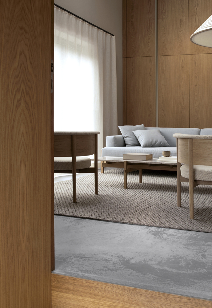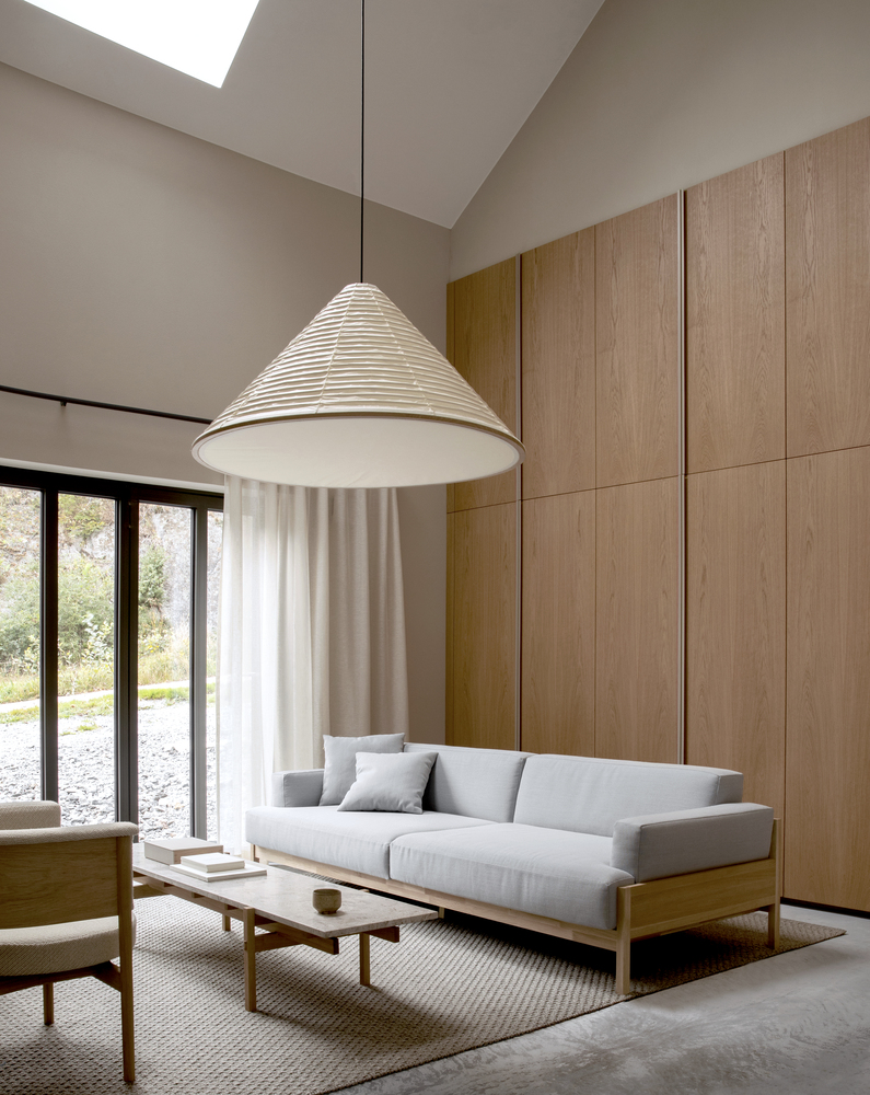 W aranżacji dominuje naturalność – drewno, kamień, stonowana kolorystyka i staranne wykończenie. Wnętrza są ciepłe, spokojne i pozbawione zbędnych ozdobników. Łazienki wykończone w szarym kamieniu – mają surowy, ale elegancki charakter, przypominający przytulne groty.