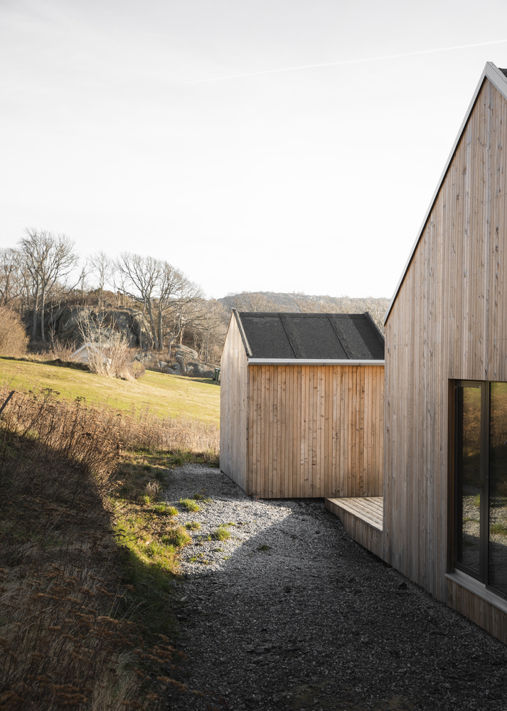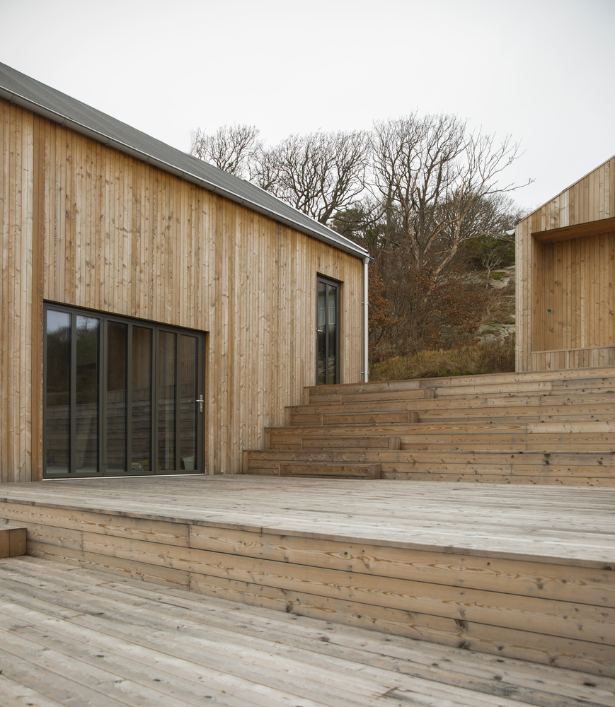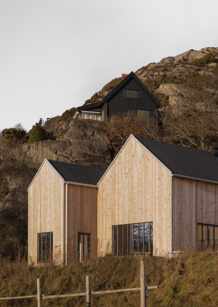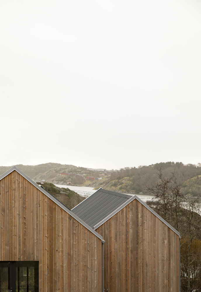 Cztery drewniane segmenty rozmieszczone na pięciu poziomach terenu tworzą spójną, funkcjonalną całość. Ich układ wynika z ukształtowania terenu – dom dosłownie wpisuje się w klif, a wszystkie części łączy rozległy taras, pełniący rolę przestrzeni rekreacyjnej z widokiem na morze i pobliskie wysepki.