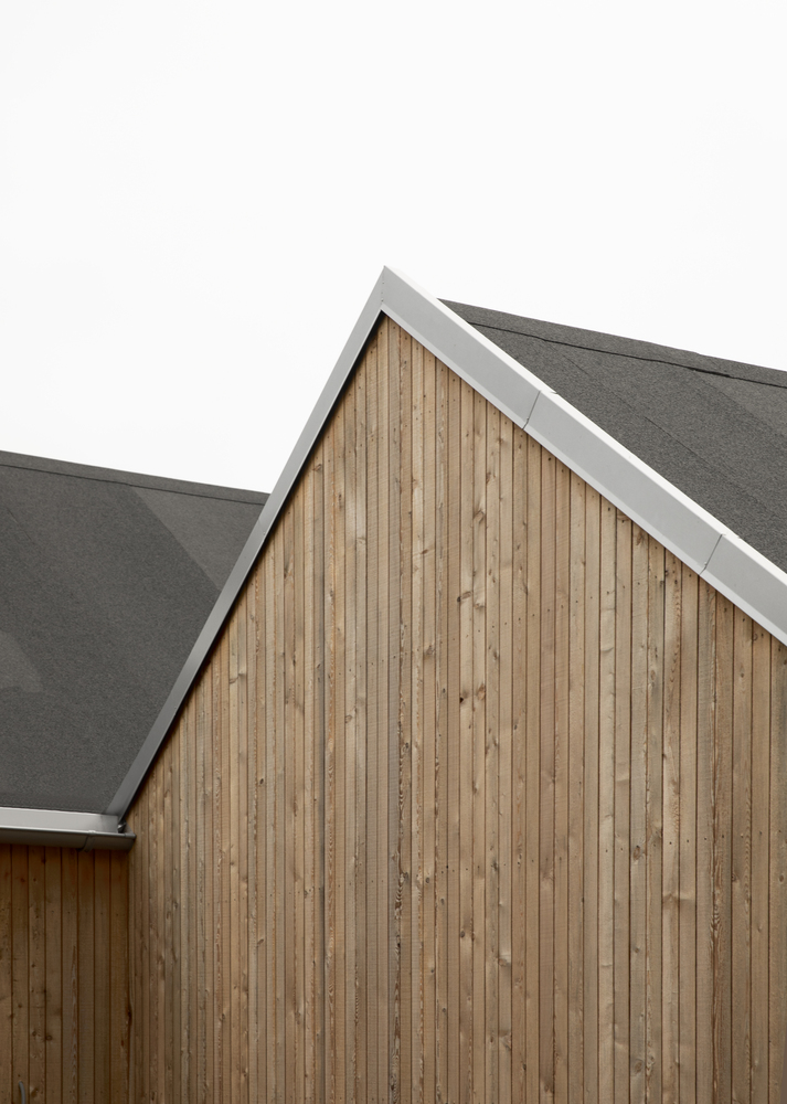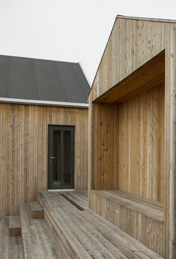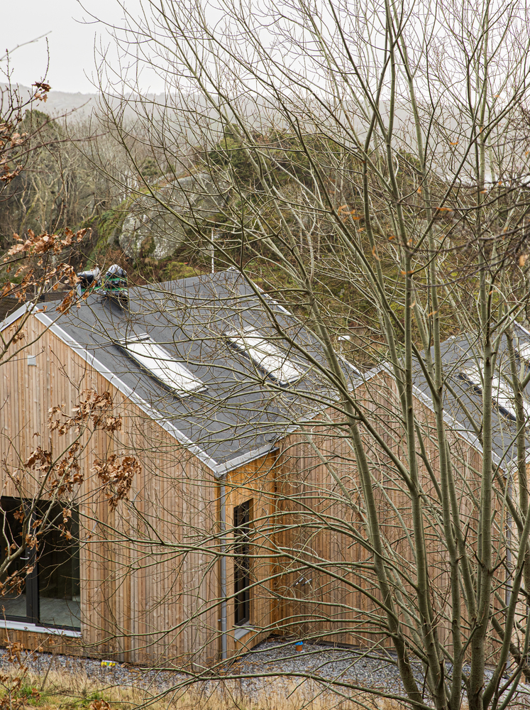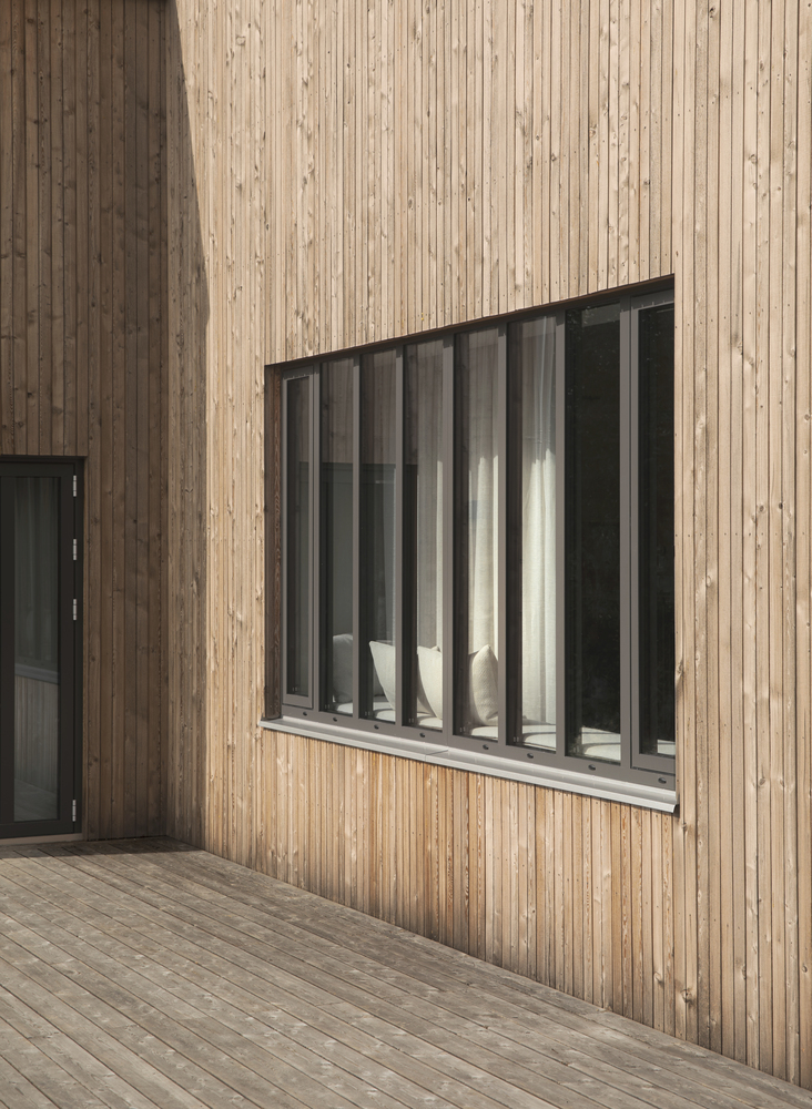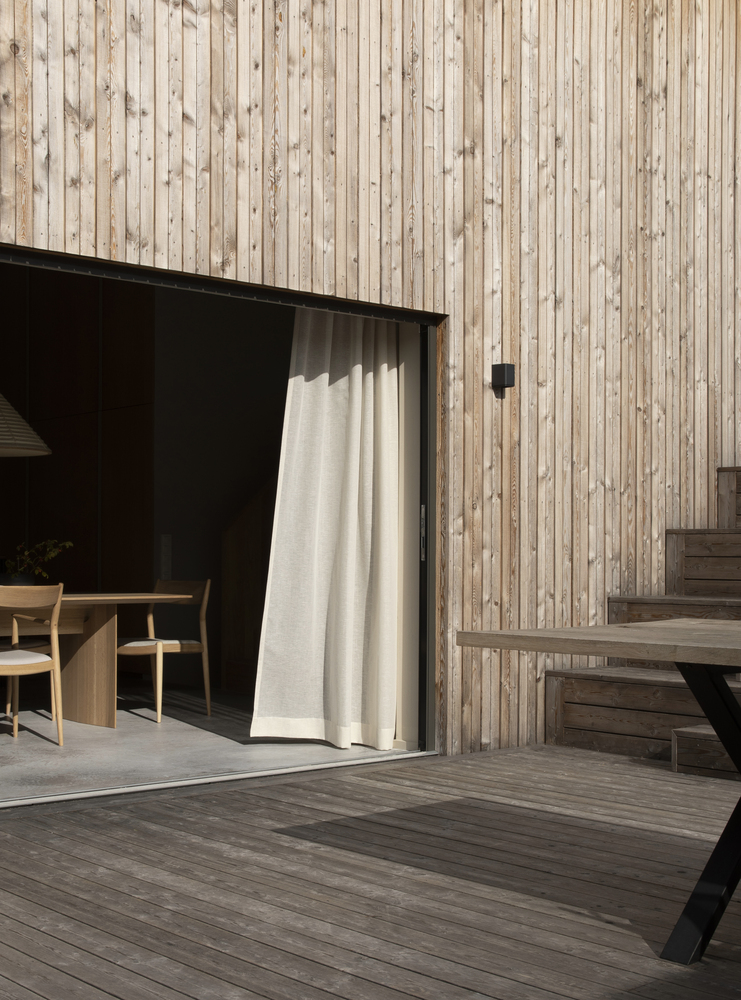 Cztery drewniane segmenty rozmieszczone na pięciu poziomach terenu tworzą spójną, funkcjonalną całość. Ich układ wynika z ukształtowania terenu – dom dosłownie wpisuje się w klif, a wszystkie części łączy rozległy taras, pełniący rolę przestrzeni rekreacyjnej z widokiem na morze i pobliskie wysepki.