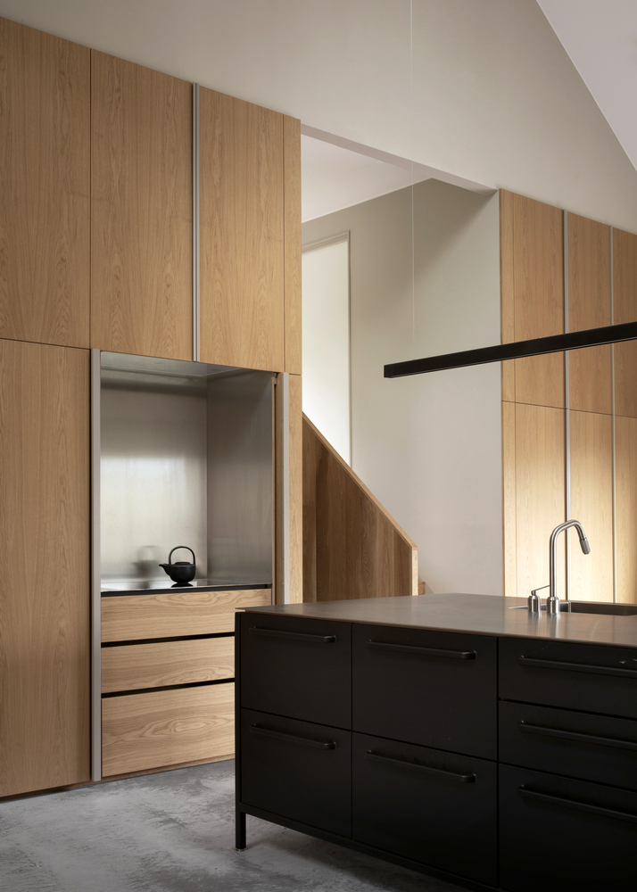 Wnętrza są jasne, przestronne i maksymalnie otwarte na otoczenie. Główną część domu stanowi wysoka przestrzeń dzienna, gdzie kuchnia, salon i jadalnia płynnie się przenikają. Duże przesuwne drzwi pozwalają niemal całkowicie otworzyć dom na zewnątrz, tworząc jedną, wspólną strefę życia.