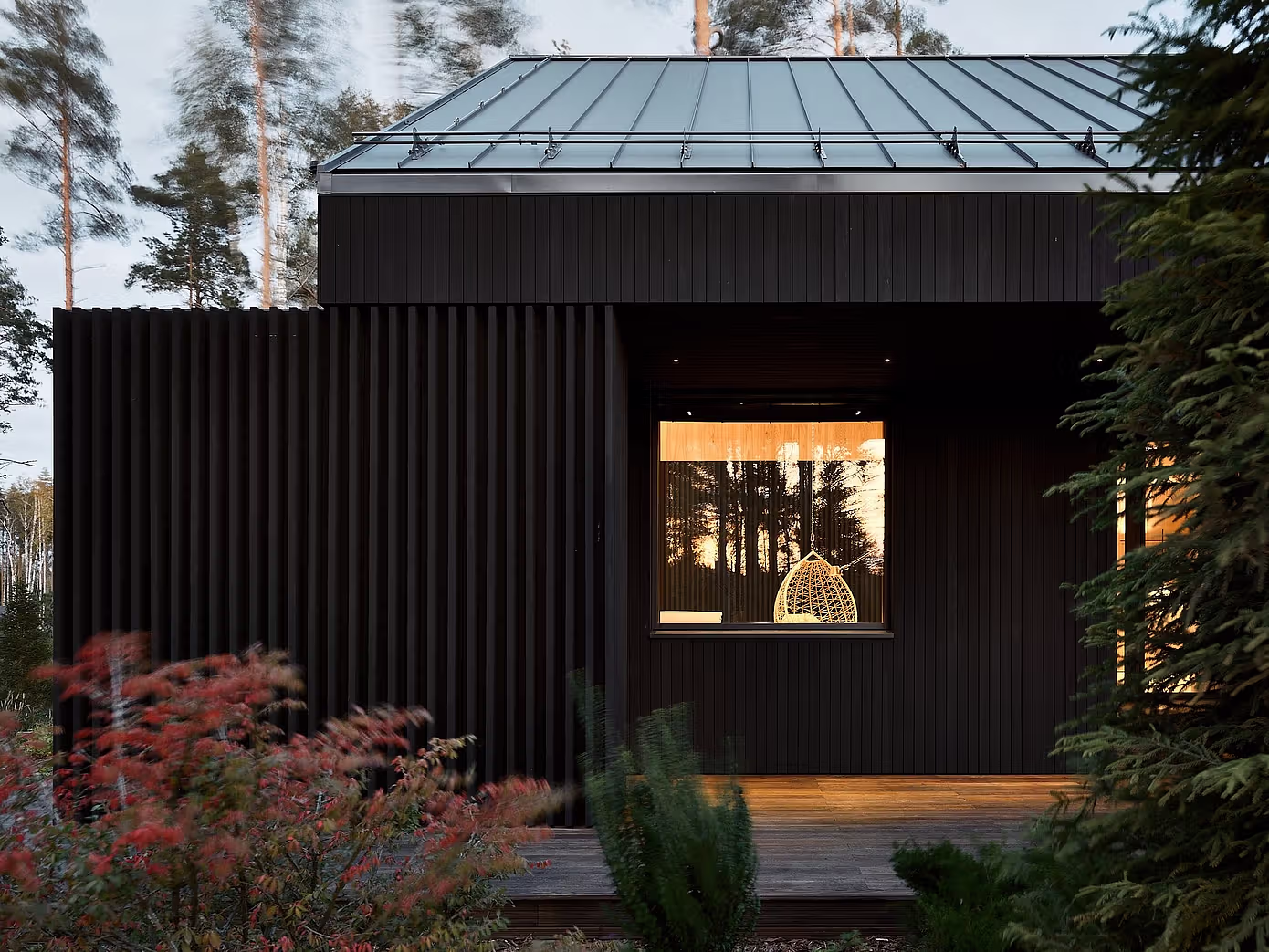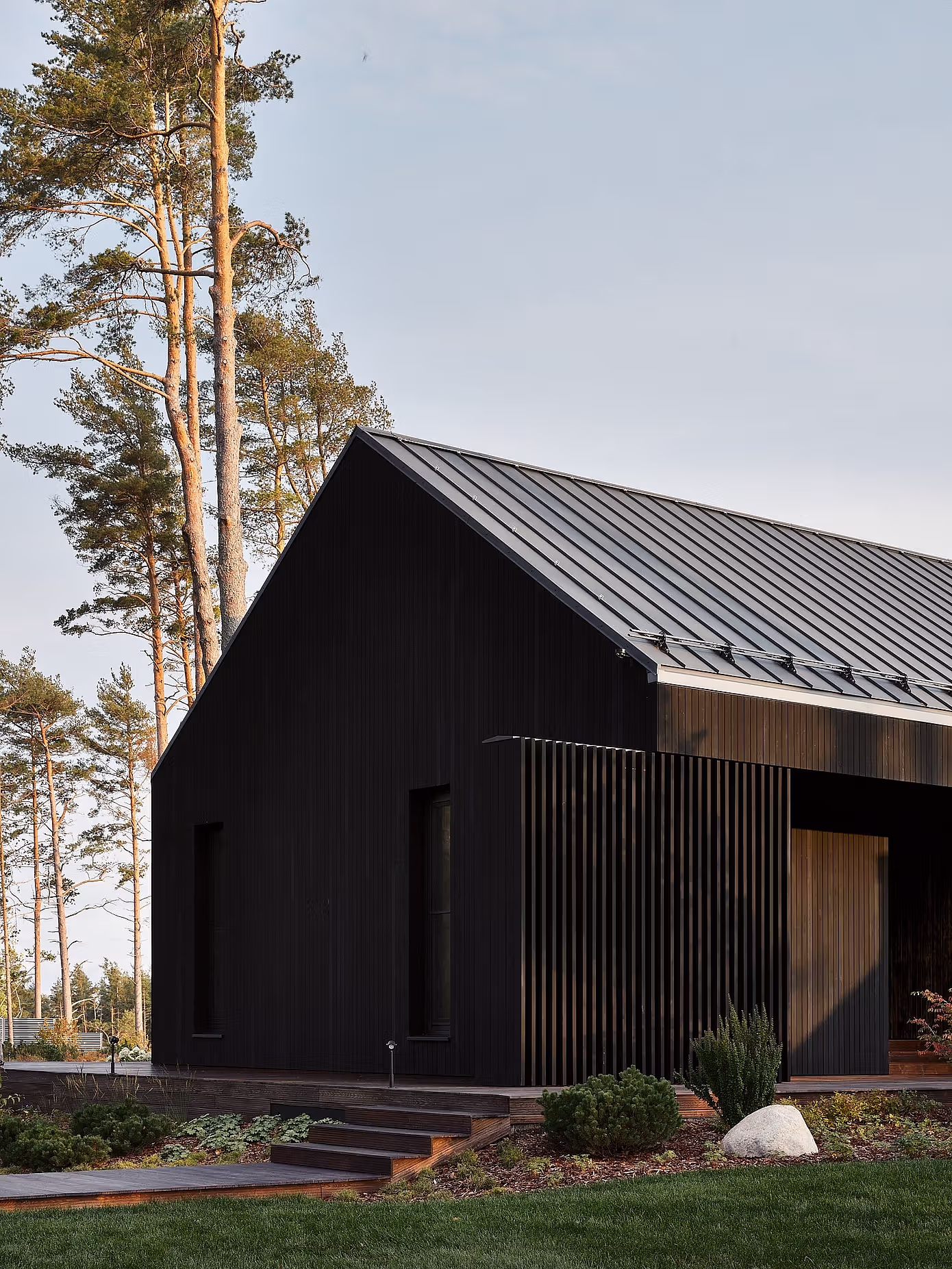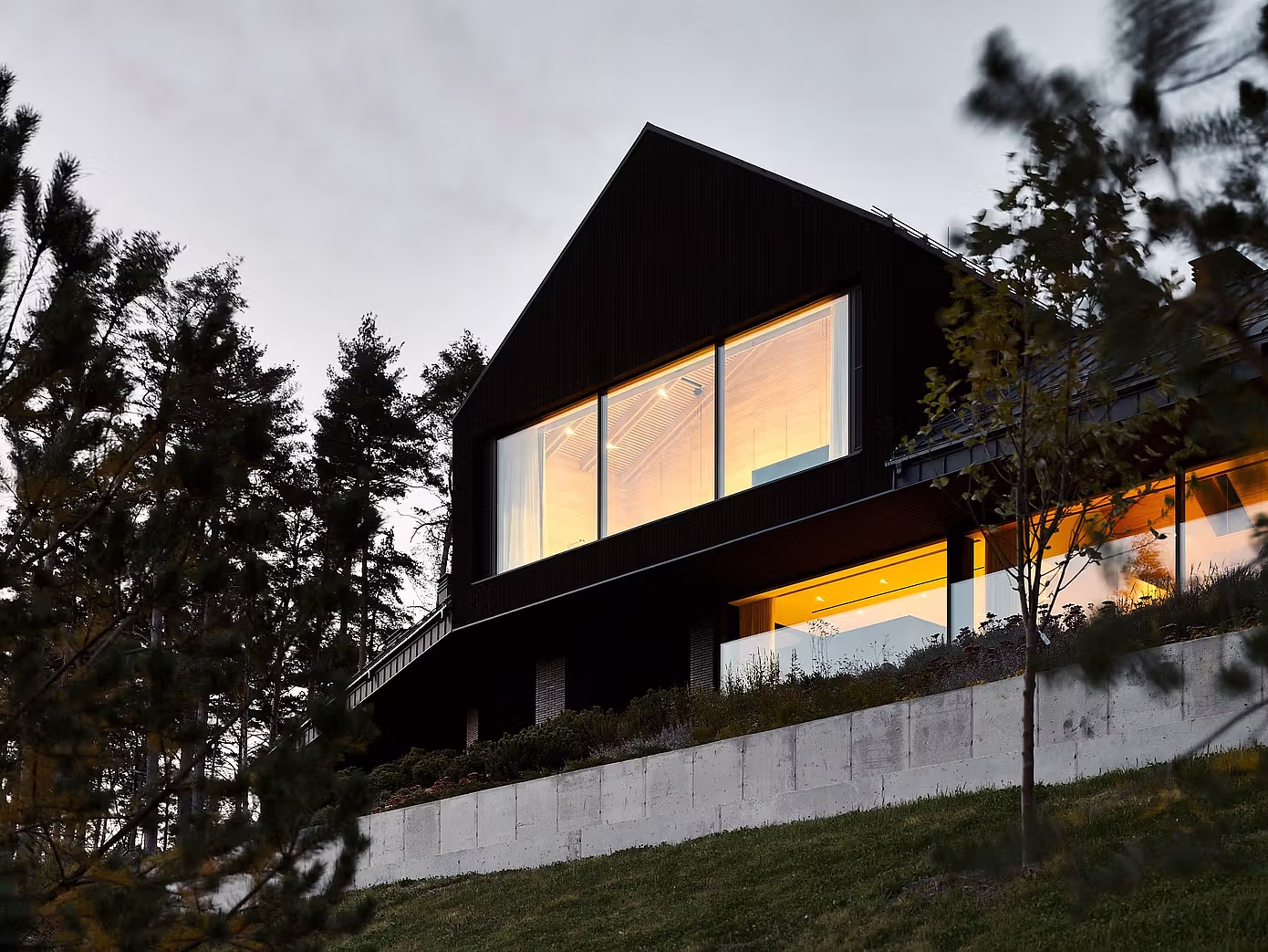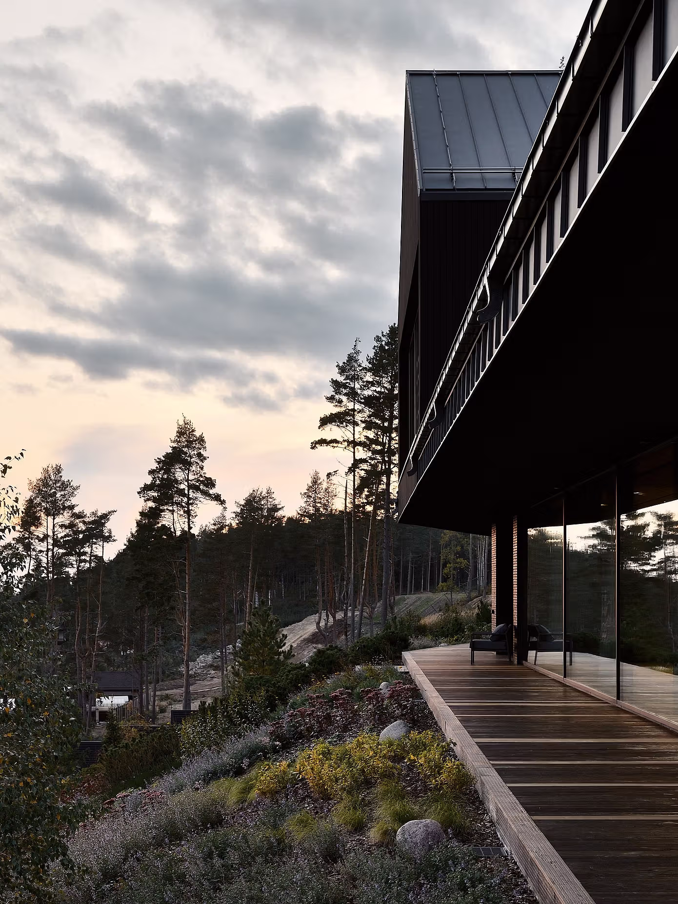Z pozoru skromny i subtelny, dom wtapia się w leśny krajobraz. Zbliżając się do budynku, odkrywamy jednak jego sprytnie zakomponowaną strukturę – dolna kondygnacja została ukryta w zboczu, co pozwala mieszkańcom cieszyć się spektakularnymi widokami na Morze Bałtyckie. Duże okna panoramiczne zalewają wnętrza naturalnym światłem i podkreślają nieustanne połączenie z otaczającym krajobrazem.