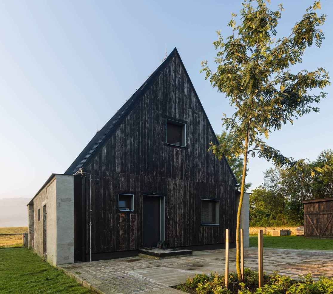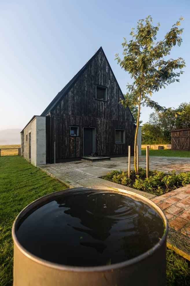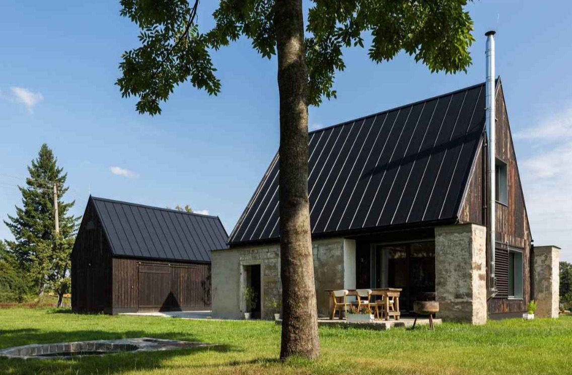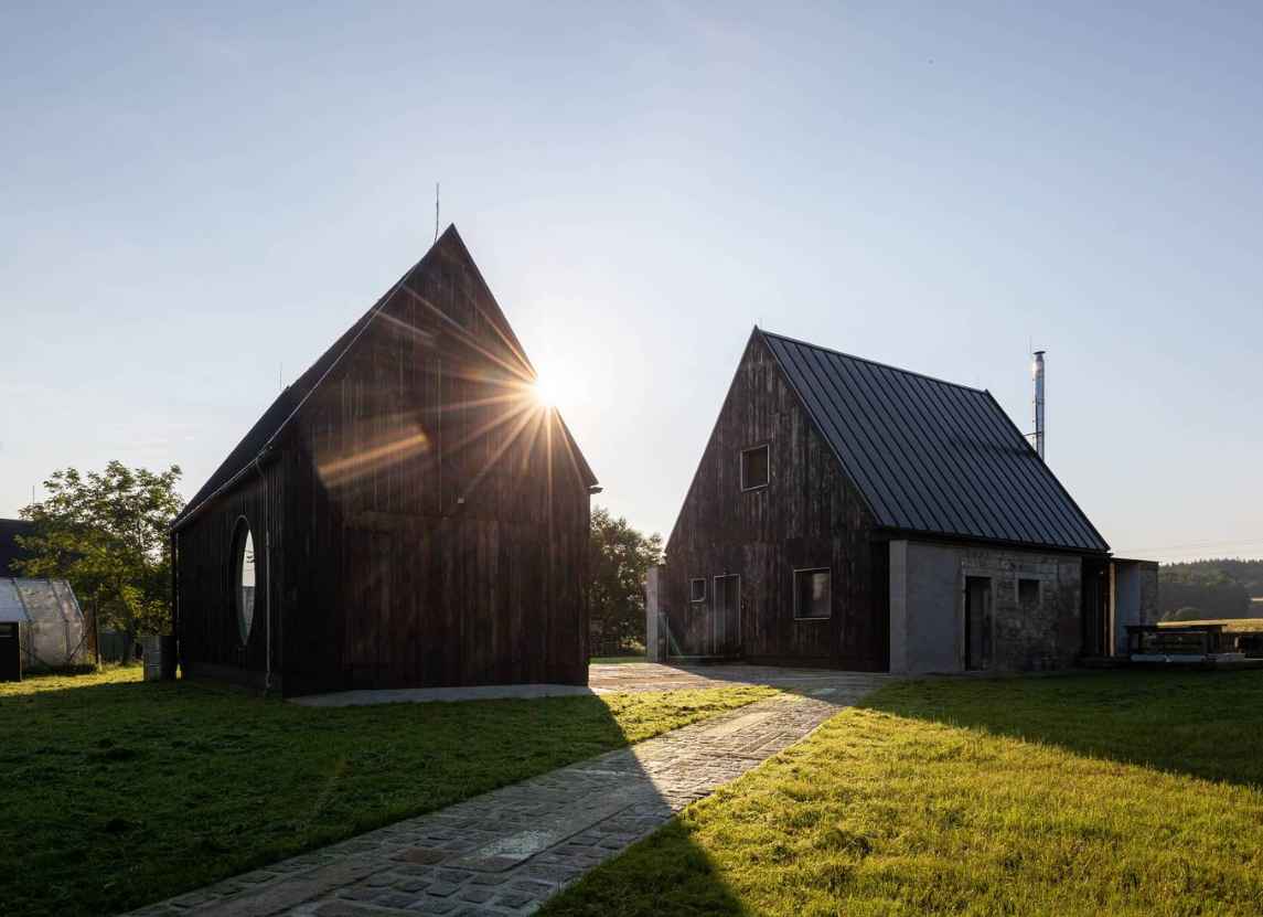 Na terenie posesji w Starej Červená Voda zachowano granitowe ściany dawnej stodoły, podkreślając kunszt dawnych kamieniarzy i szacunek dla lokalnej historii. Choć oryginalny dom mieszkalny okazał się nietrwały, większość rozbiórkowych kamieni odzyskała życie jako materiał ogrodzeniowy. W nowej inwestycji między pozostawionymi murami powstał drewniany dom w konstrukcji KVH, oddzielony od zabytkowych ścian wentylowaną szczeliną. Obok budynku stanął poprzeczny garaż, a pomiędzy bryłami utworzono osłonięte, wielofunkcyjne patio — ulubione miejsce domowników do odpoczynku na świeżym powietrzu, łączące prywatność z widokiem na wiejskie krajobrazy.
