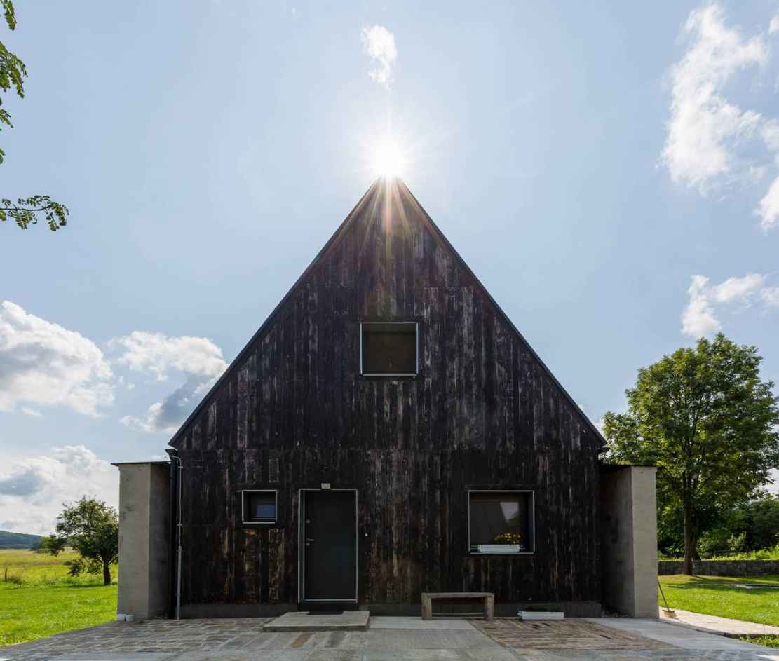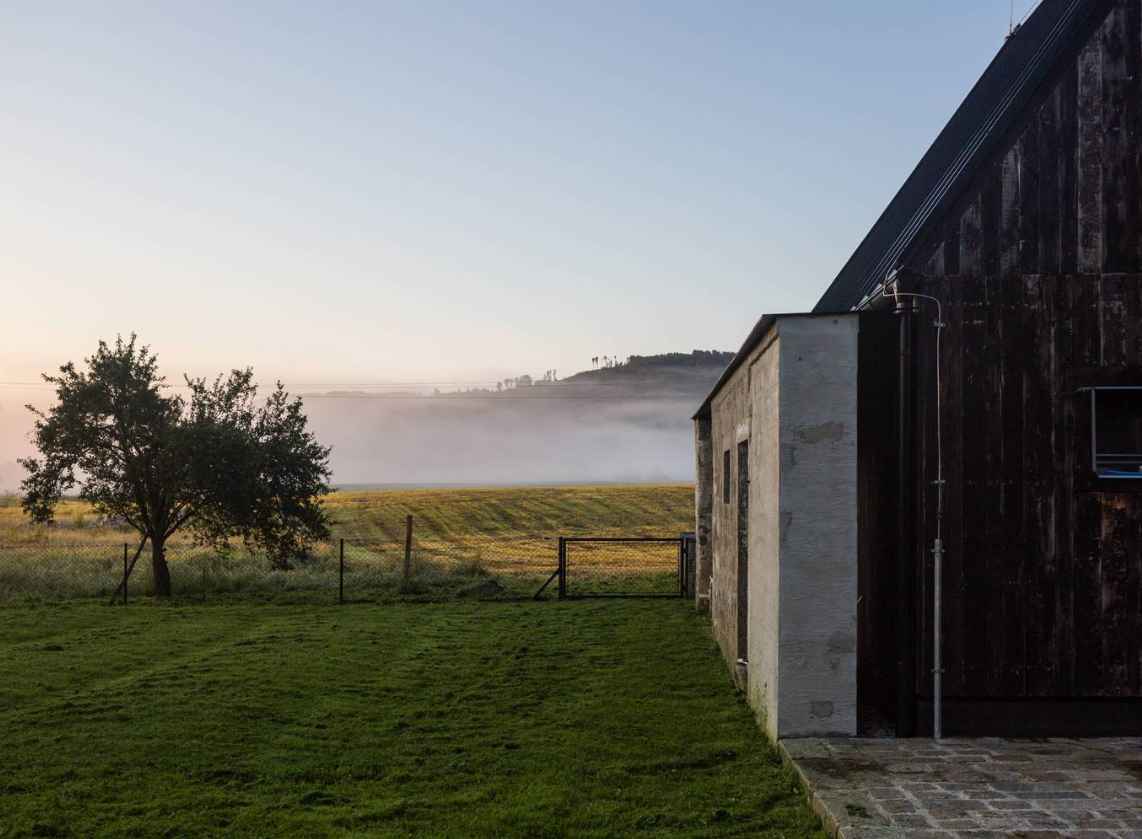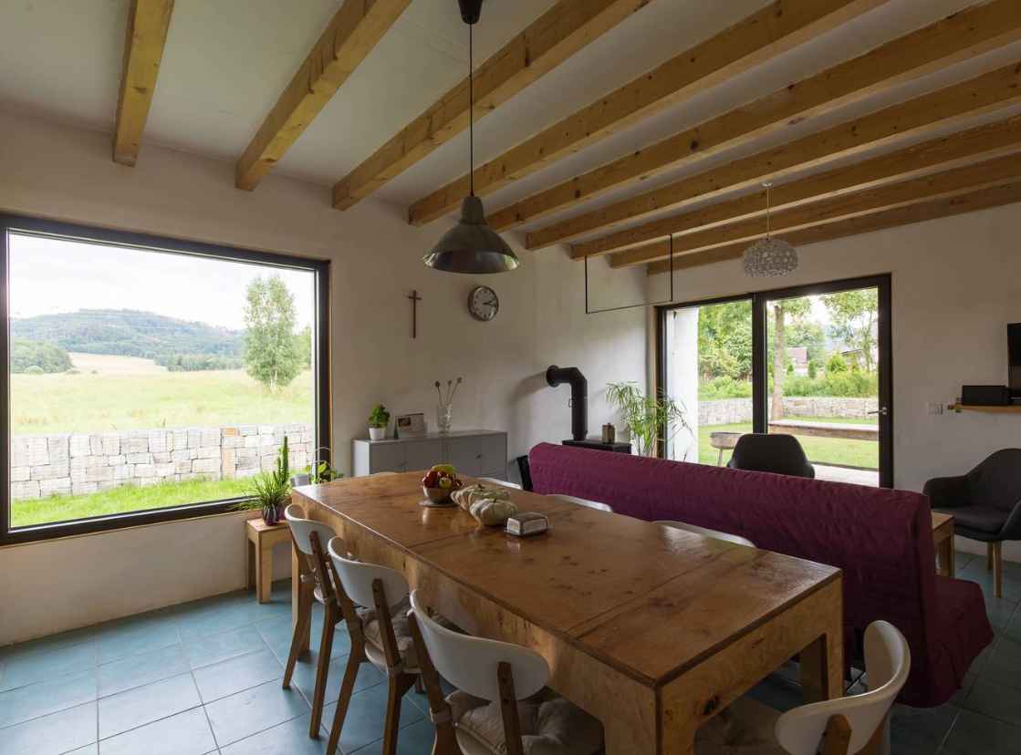 Na terenie posesji w Starej Červená Voda zachowano granitowe ściany dawnej stodoły, podkreślając kunszt dawnych kamieniarzy i szacunek dla lokalnej historii. Choć oryginalny dom mieszkalny okazał się nietrwały, większość rozbiórkowych kamieni odzyskała życie jako materiał ogrodzeniowy. W nowej inwestycji między pozostawionymi murami powstał drewniany dom w konstrukcji KVH, oddzielony od zabytkowych ścian wentylowaną szczeliną. Obok budynku stanął poprzeczny garaż, a pomiędzy bryłami utworzono osłonięte, wielofunkcyjne patio — ulubione miejsce domowników do odpoczynku na świeżym powietrzu, łączące prywatność z widokiem na wiejskie krajobrazy.