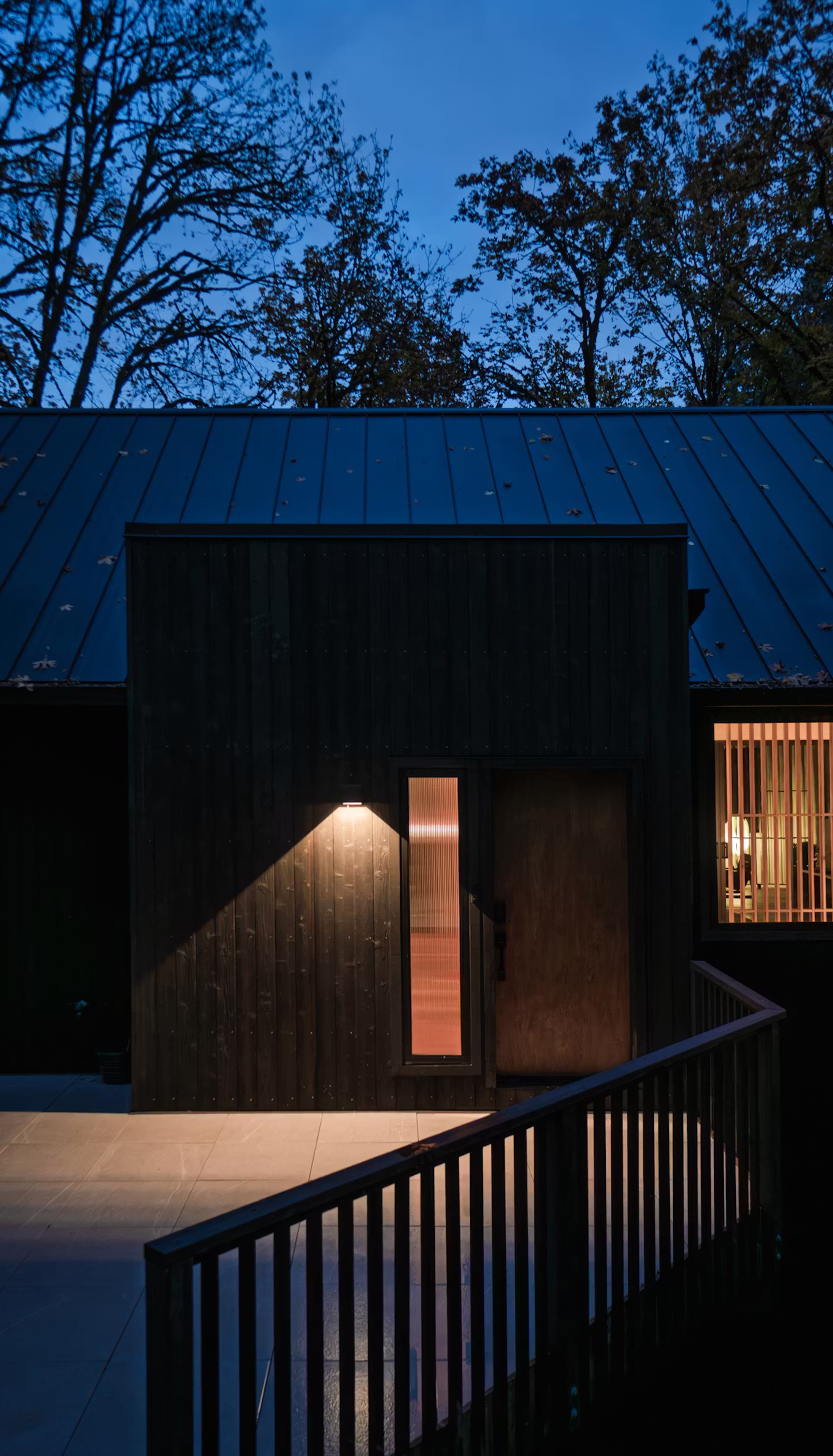 Na niższym poziomie znajdują się dwie sypialnie oraz gabinet, z których wszystkie mają bezpośredni dostęp do drugiego, zadaszonego tarasu. Duże przeszklenia i przesuwne drzwi pozwalają w pełni otworzyć wnętrza na zieleń i światło, sprawiając, że dom funkcjonuje jak naturalne przedłużenie lasu. Rozwiązania te wzmacniają poczucie życia wśród drzew, bez rezygnacji z komfortu.
