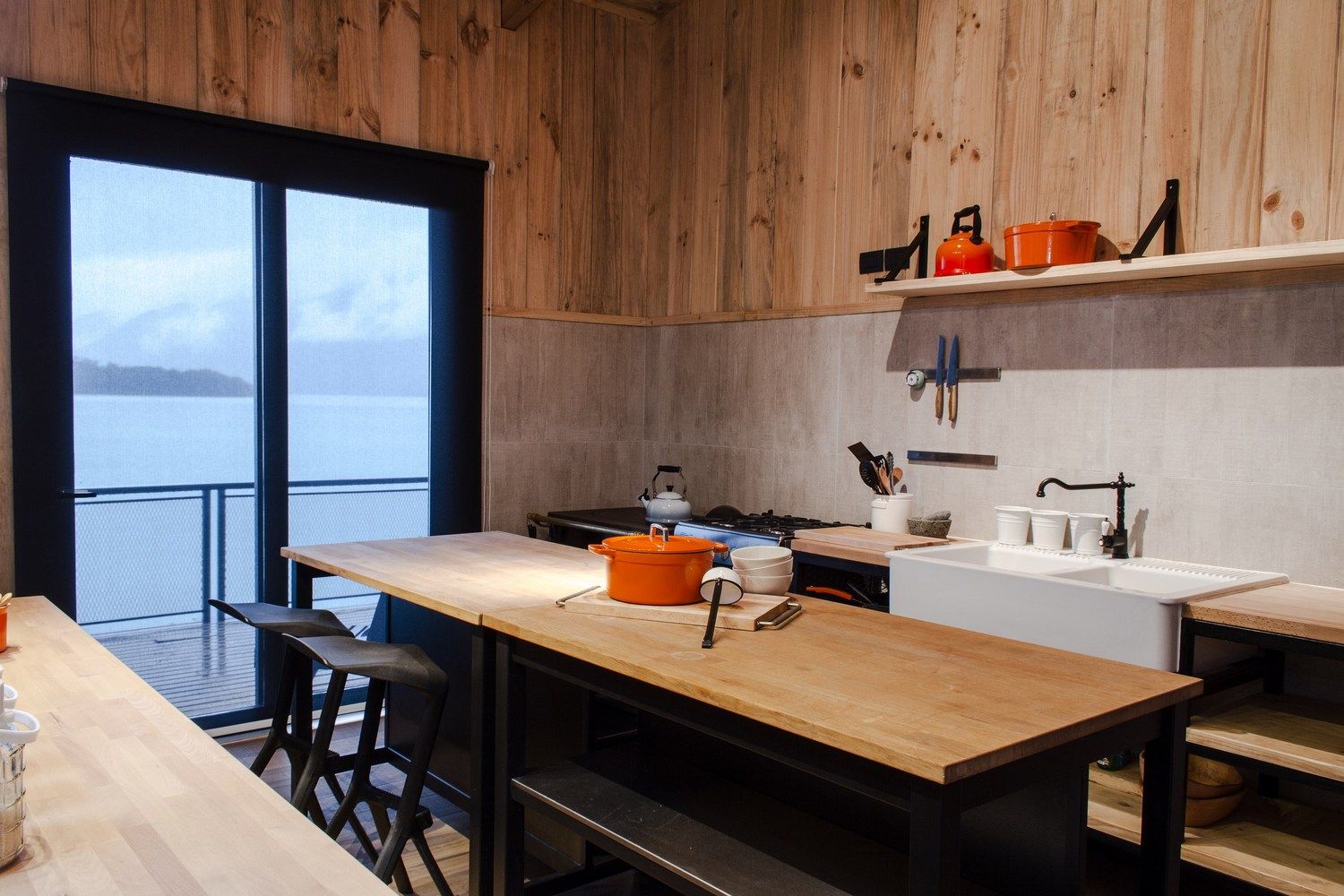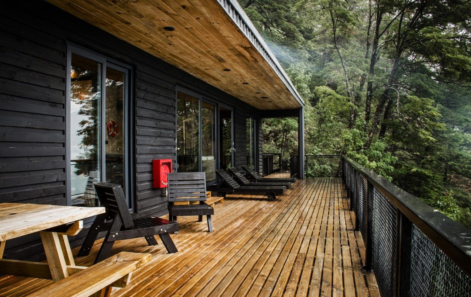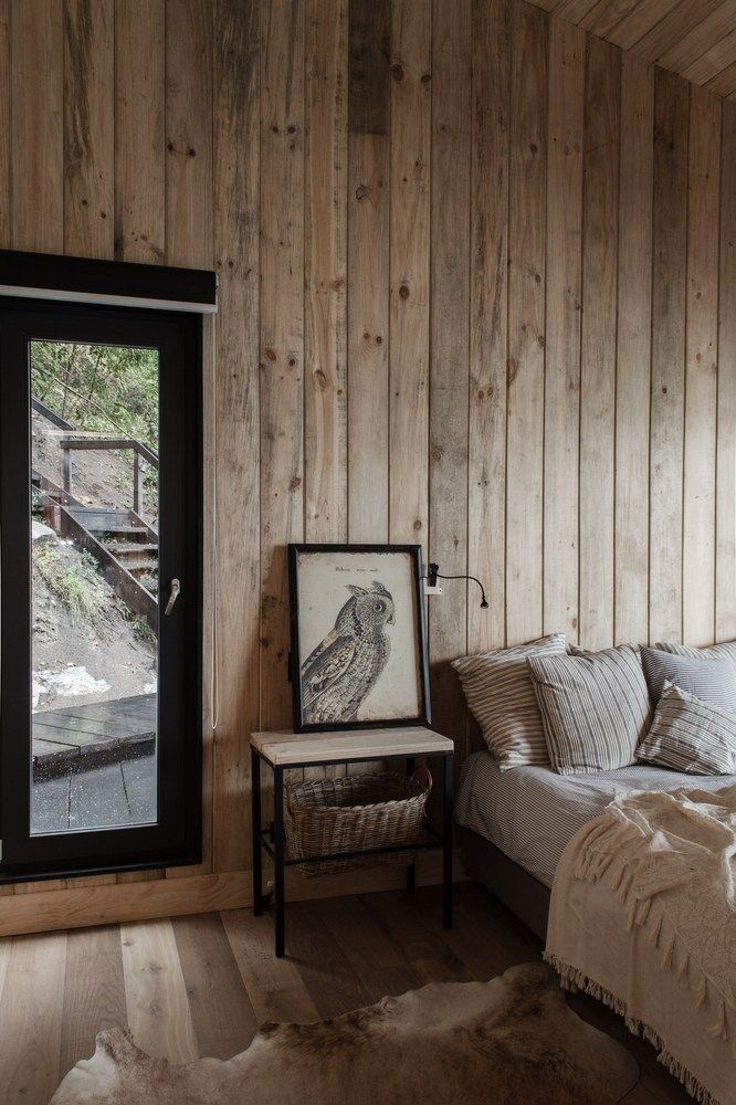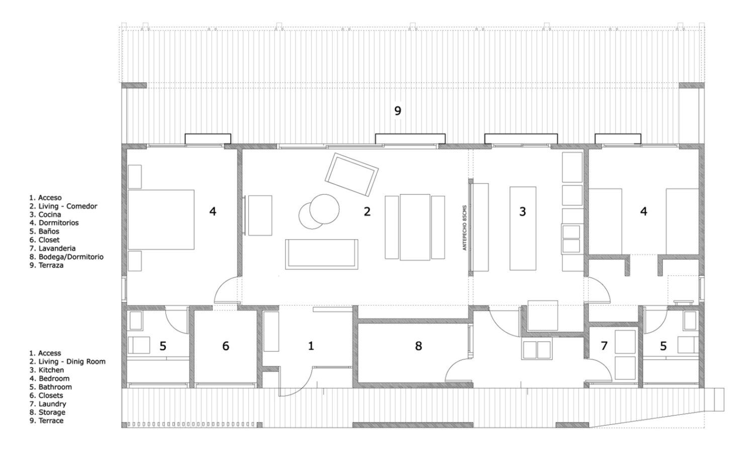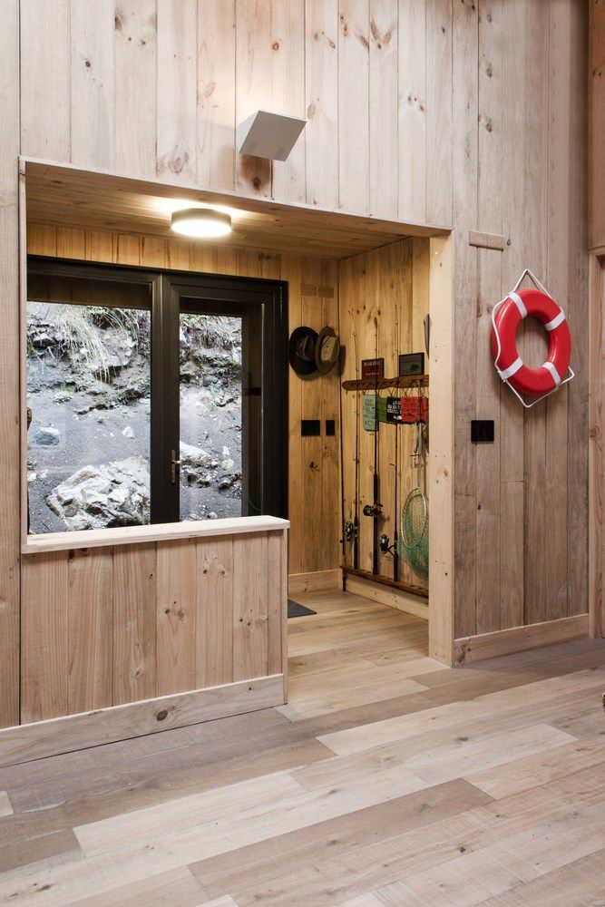 W ten sposób na metalowej konstrukcji zamocowany został dom z impregnowanego drewna sosnowego z dużymi tarasami, z których można podziwiać piękne widoki na jezioro. Pomieszczenia zorganizowano wokół przestrzeni wspólnej, na którą składa się otwarty salon, kuchnia i jadalnia. Na dwóch końcach domu powstały jeszcze dodatkowe przestrzenie dzienne. Aby zminimalizować koszty, wszystkie meble wykonano z nadwyżki materiałów budowlanych (metalowe elementy oraz drewno). Ściany od wewnątrz obito naturalnym drewnem, które tworzy ciepły klimat, typowy dla południowego Chile.
