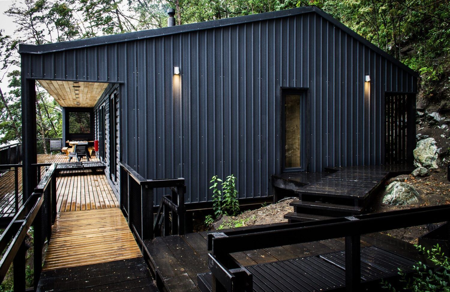 Elewacja miała być wykonana z tego samego materiału co pokrycie dachu i musiał to być materiał wodoodporny. Jednocześnie miał on też harmonizować z otoczeniem i przypominać stary, tradycyjny gont. Architekci zdecydowali się więc na chilijską blachę Cintac – materiał lekki, który ułatwiał transport, a jednocześnie spełniał wszystkie wymogi projektu. Był też prosty w montażu i nie będzie wymagał regularnej konserwacji w przyszłości.