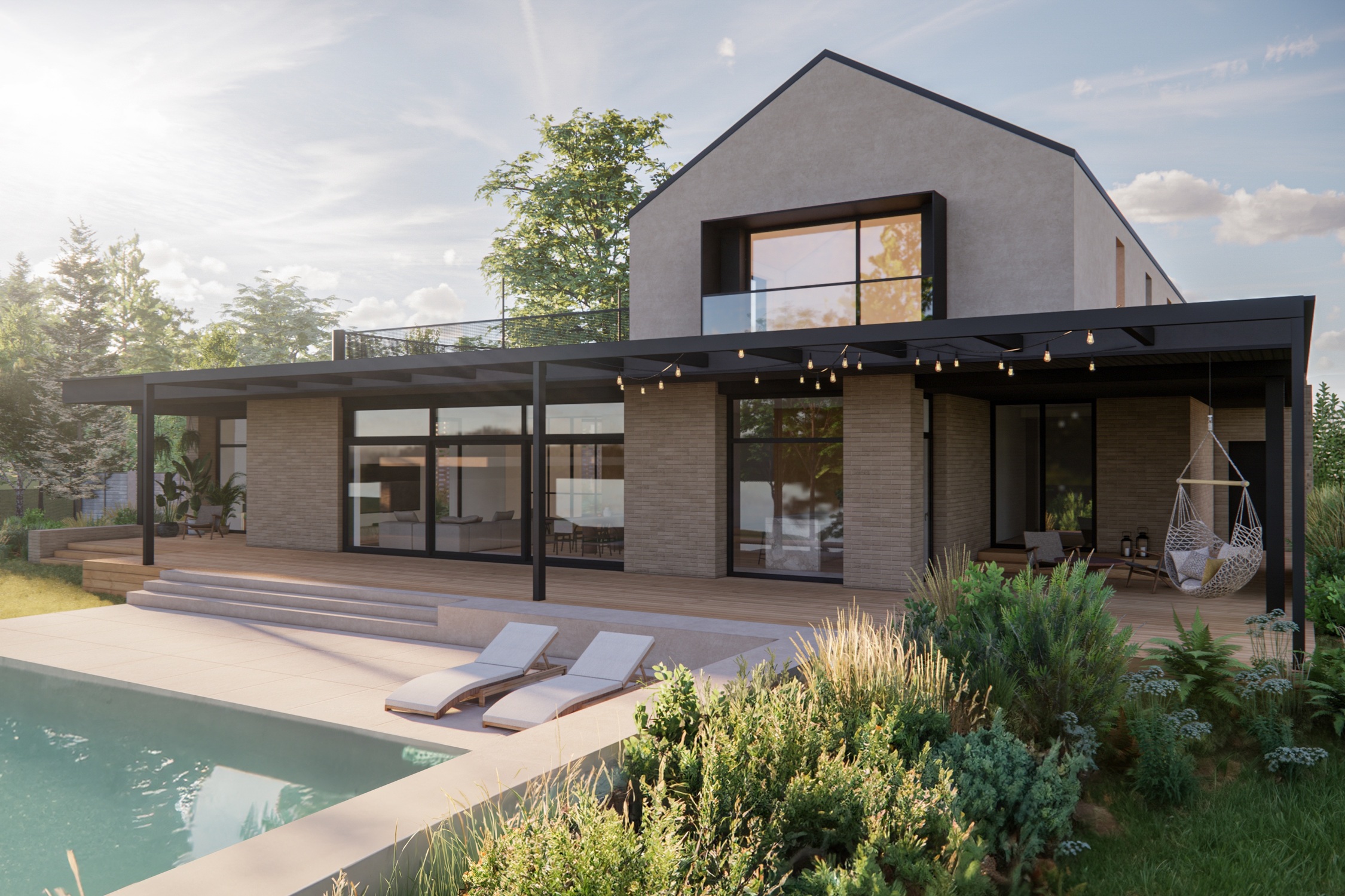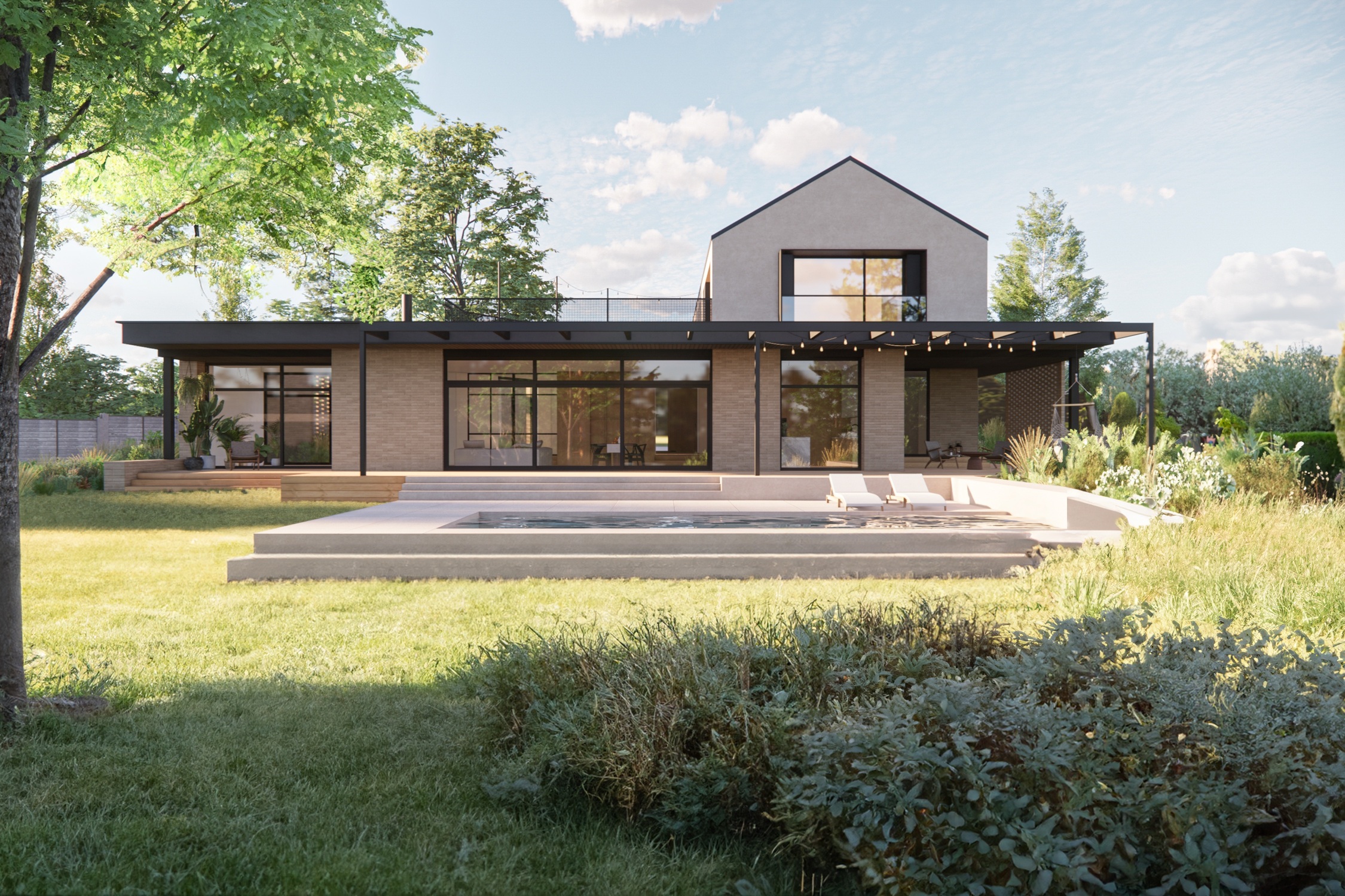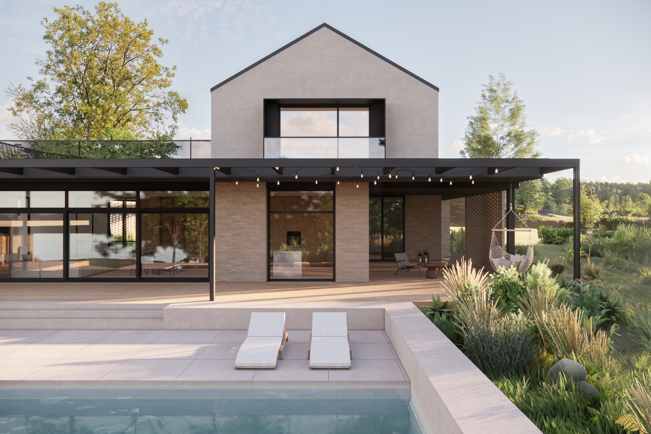 Dom łączy fakturowe materiały strukturalnego tynku dekoracyjnego oraz cegły, oba w kolorach ziemi, z elementami czarnego metalu i mikrocementu. Charakterystyczny motyw 'przewiązania' wysokich ścian ceglanych czarnymi nadprożami podkreśla rolę parteru w kompozycji bryły, zwiększając wizualnie i tak wysokie przeszklenia. Budynek z jednej strony zapewnia prywatność i prezentuje się gościom z formalnej, eleganckiej strony, z drugiej natomiast pielęgnuje otwartość wobec zewnętrza i zachęca użytkowników do interakcji przy tarasach o różnorodnym kontakcie z naturalnym otoczeniem.