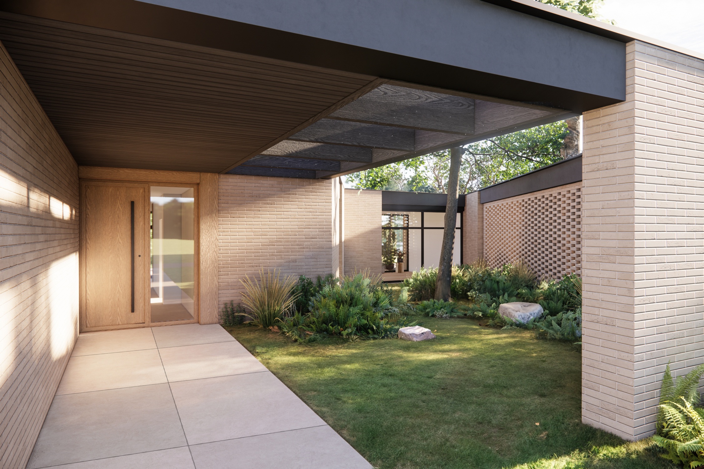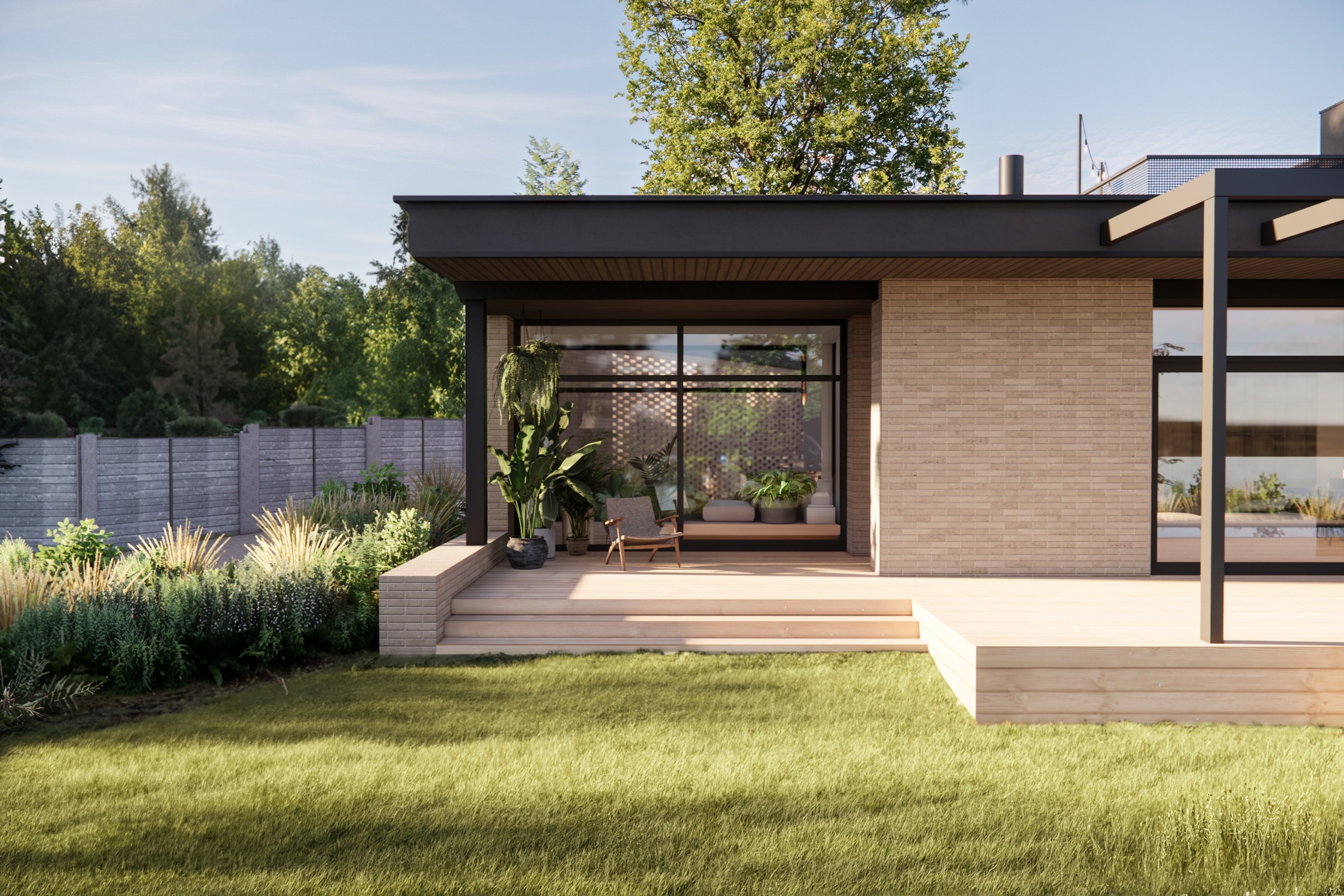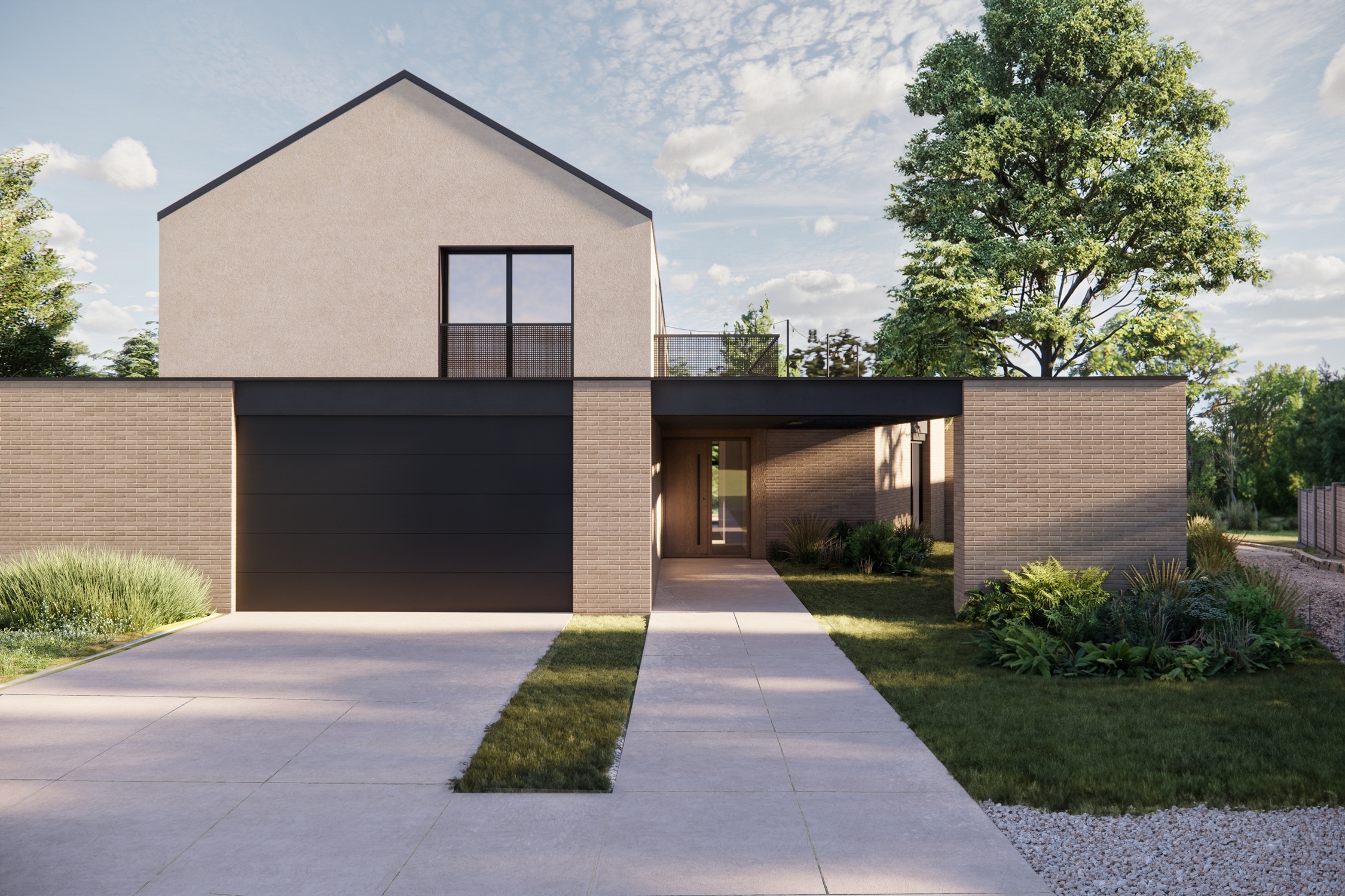 Dom łączy fakturowe materiały strukturalnego tynku dekoracyjnego oraz cegły, oba w kolorach ziemi, z elementami czarnego metalu i mikrocementu. Charakterystyczny motyw 'przewiązania' wysokich ścian ceglanych czarnymi nadprożami podkreśla rolę parteru w kompozycji bryły, zwiększając wizualnie i tak wysokie przeszklenia. Budynek z jednej strony zapewnia prywatność i prezentuje się gościom z formalnej, eleganckiej strony, z drugiej natomiast pielęgnuje otwartość wobec zewnętrza i zachęca użytkowników do interakcji przy tarasach o różnorodnym kontakcie z naturalnym otoczeniem.