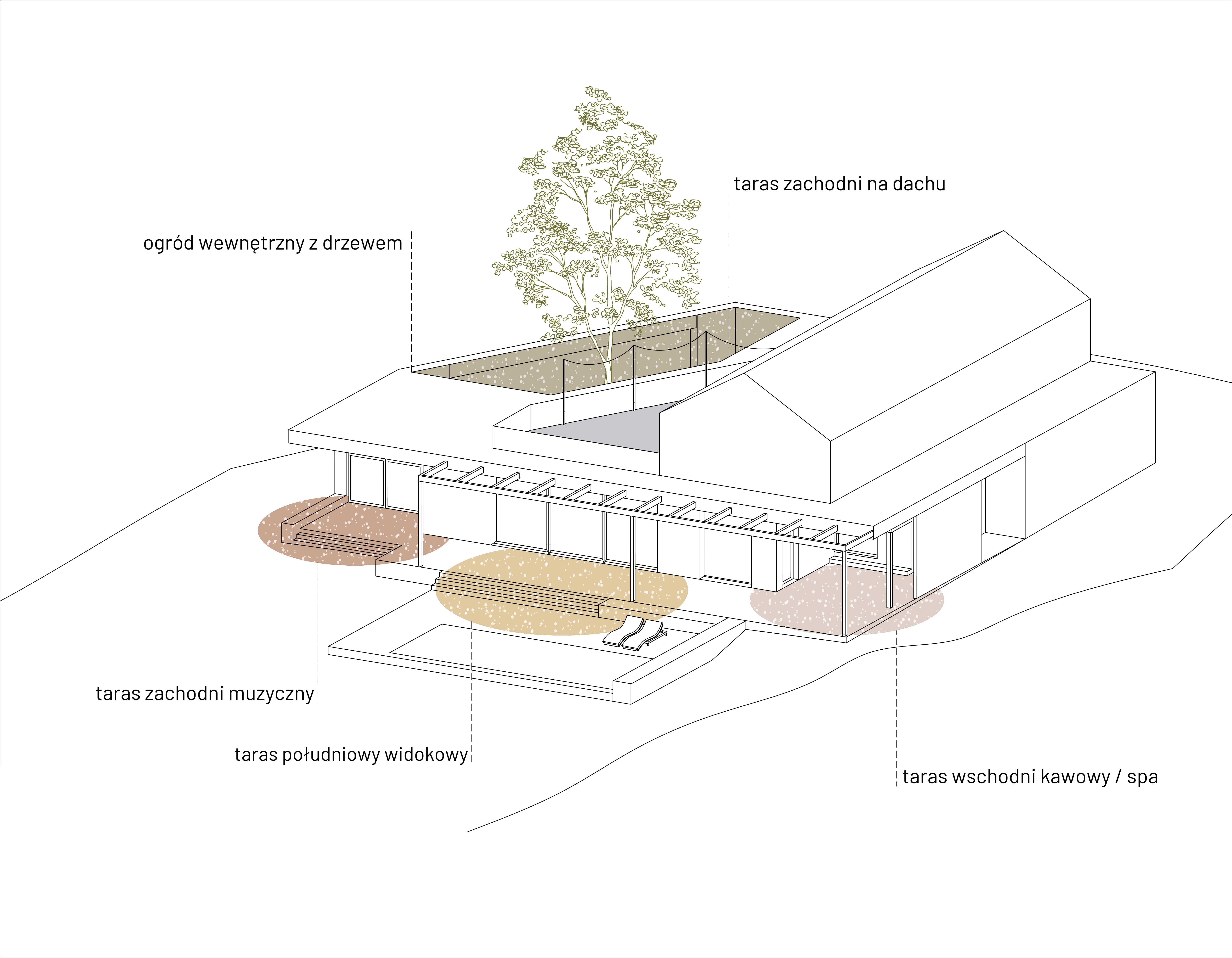 Miejska działka, na której zaprojektowano dom to wyjątkowe zestawienie oszałamiających zalet i znaczących wad. Z jednej strony, przestrzeń z widokiem na jezioro o południowej ekspozycji – z drugiej, druga ze służebnością przejazdu przechodząca przez dość wąską działkę i bezkompromisowa linia zabudowy. Bryła domu powstała niejako w odpowiedzi – wykorzystuje przestrzeń zabudowy w 100%, dopasowując się programem funkcjonalnym do potencjałów i zagrożeń każdej ze stron działki. Kształt bryły podkreśla główne założenie domu – zapewnienie prywatności od strony służebności i strefy wjazdowej, przy jednoczesnym pełnym otwarciu widokowym na stronę jeziora. Duże okna chronione są przed słońcem rozrzeźbionym zadaszeniem, które naturalnie przekształca się w tarasy przy siłowni i pokoju muzycznym. Dzięki atrium, wszystkie pomieszczenia w bogatej funkcjonalnie strefie dziennej pozostają doświetlone dwustronnie. Przestrzeń nocną zlokalizowano na piętrze. Z sypialni zapewniono dostęp do tarasu na dachu, który umożliwia widok na jezioro z większej wysokości, oraz możliwość odpoczynku w cieniu korony drzewa.