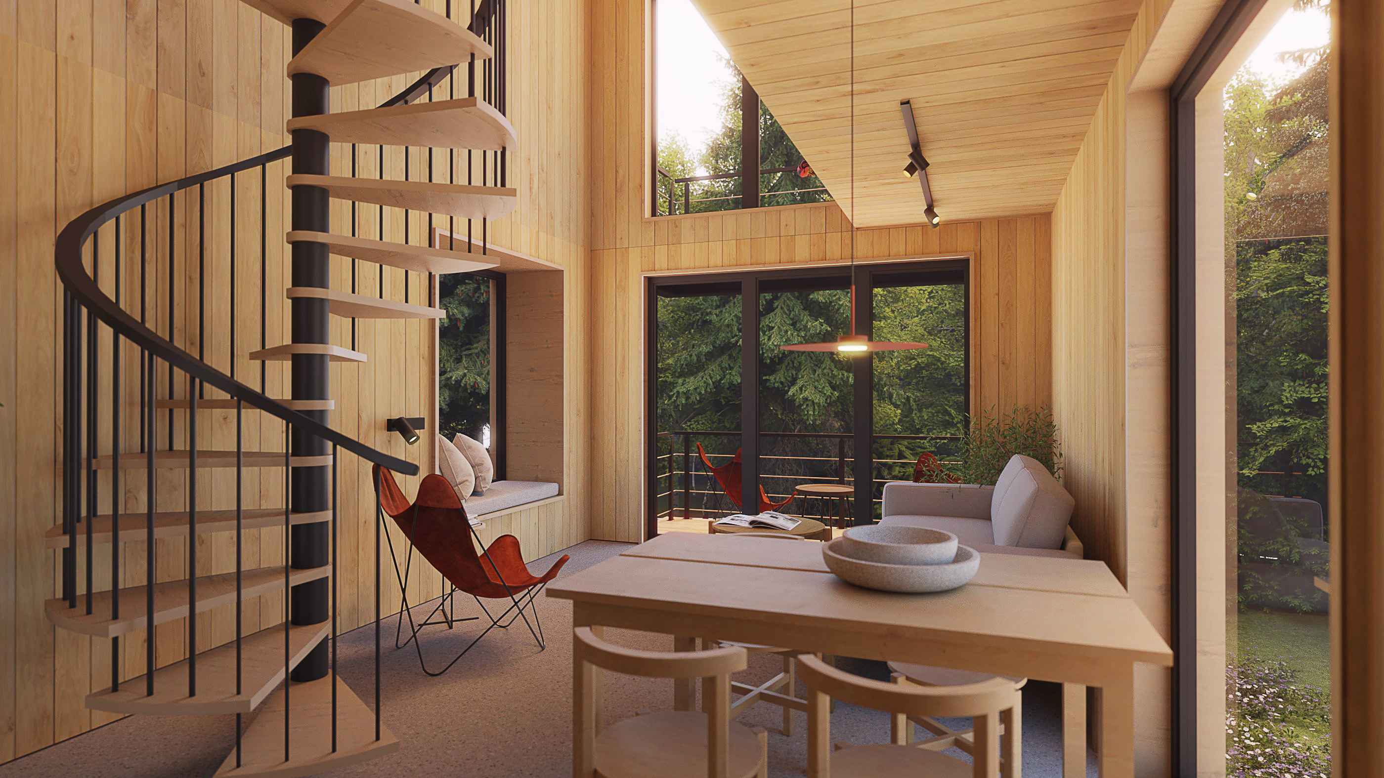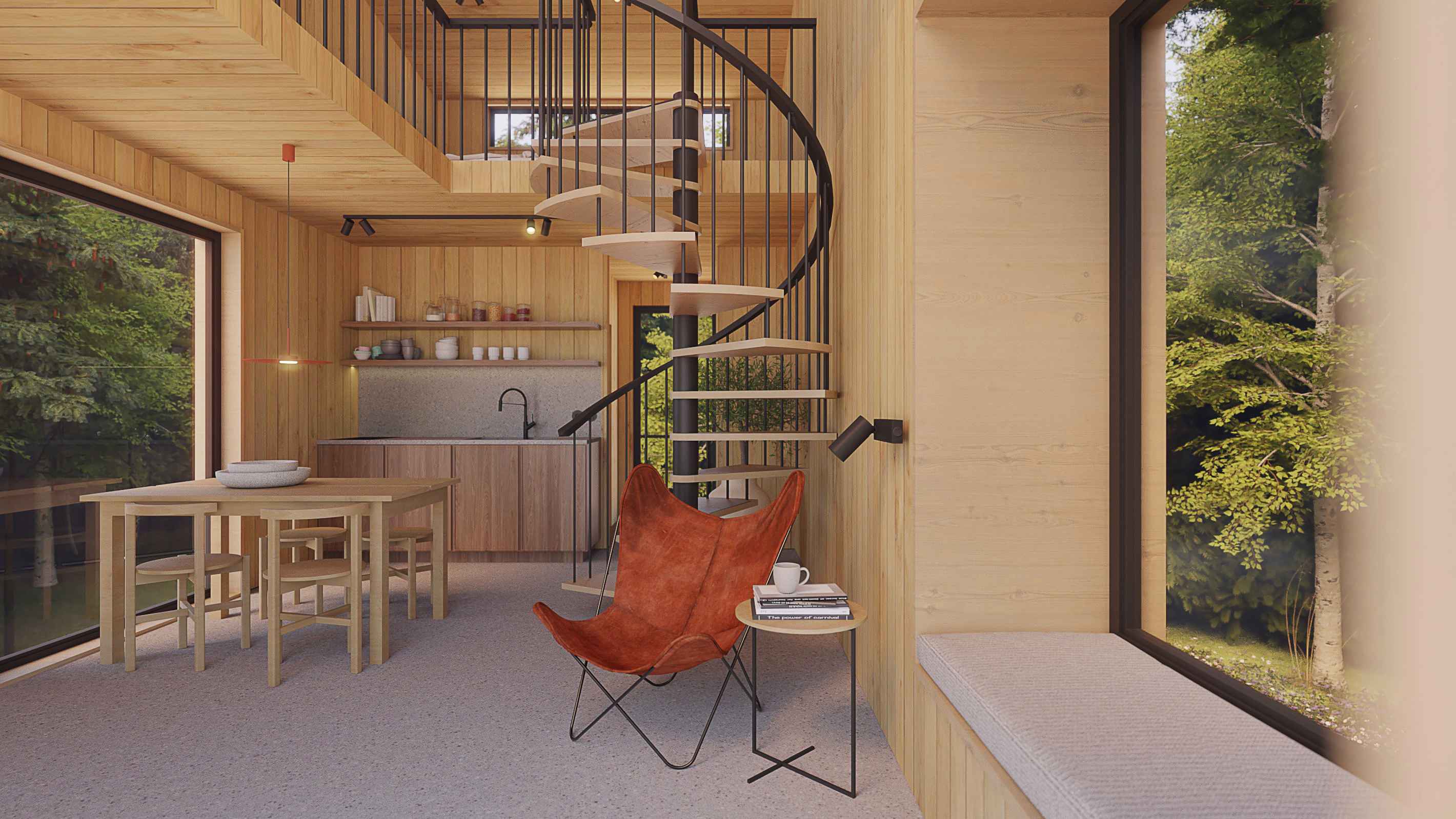 Serce domu stanowi wysoka, dwukondygnacyjna przestrzeń dzienna z dużymi przeszkleniami, które kadrują widoki niczym żywe obrazy. Spiralne schody prowadzą na antresolę — idealne miejsce do pracy, medytacji, czytania lub porannej jogi.