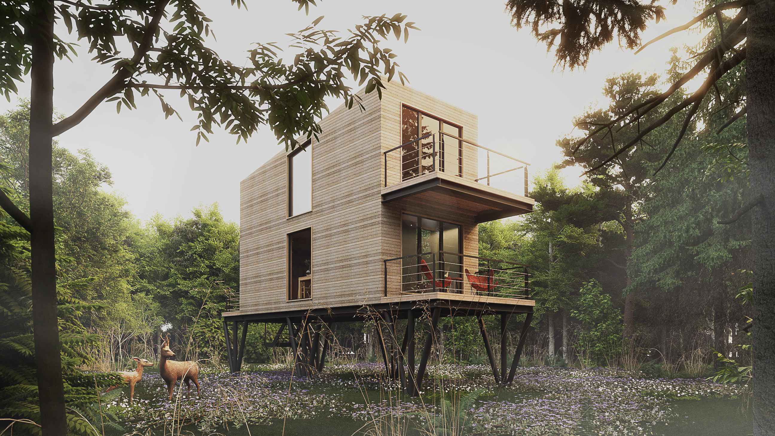 Bryła budynku została zaprojektowana tak, aby jak najmniej ingerować w teren. Dom nie stoi bezpośrednio na ziemi — opiera się na smukłych podporach, dzięki czemu zdaje się unosić nad runem leśnym. Taki zabieg pozwolił zachować naturalny układ zieleni i minimalizuje wpływ konstrukcji na środowisko.