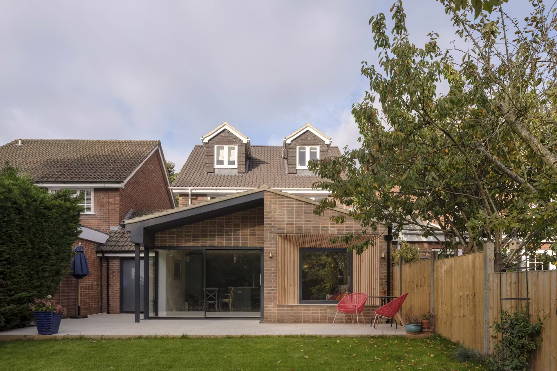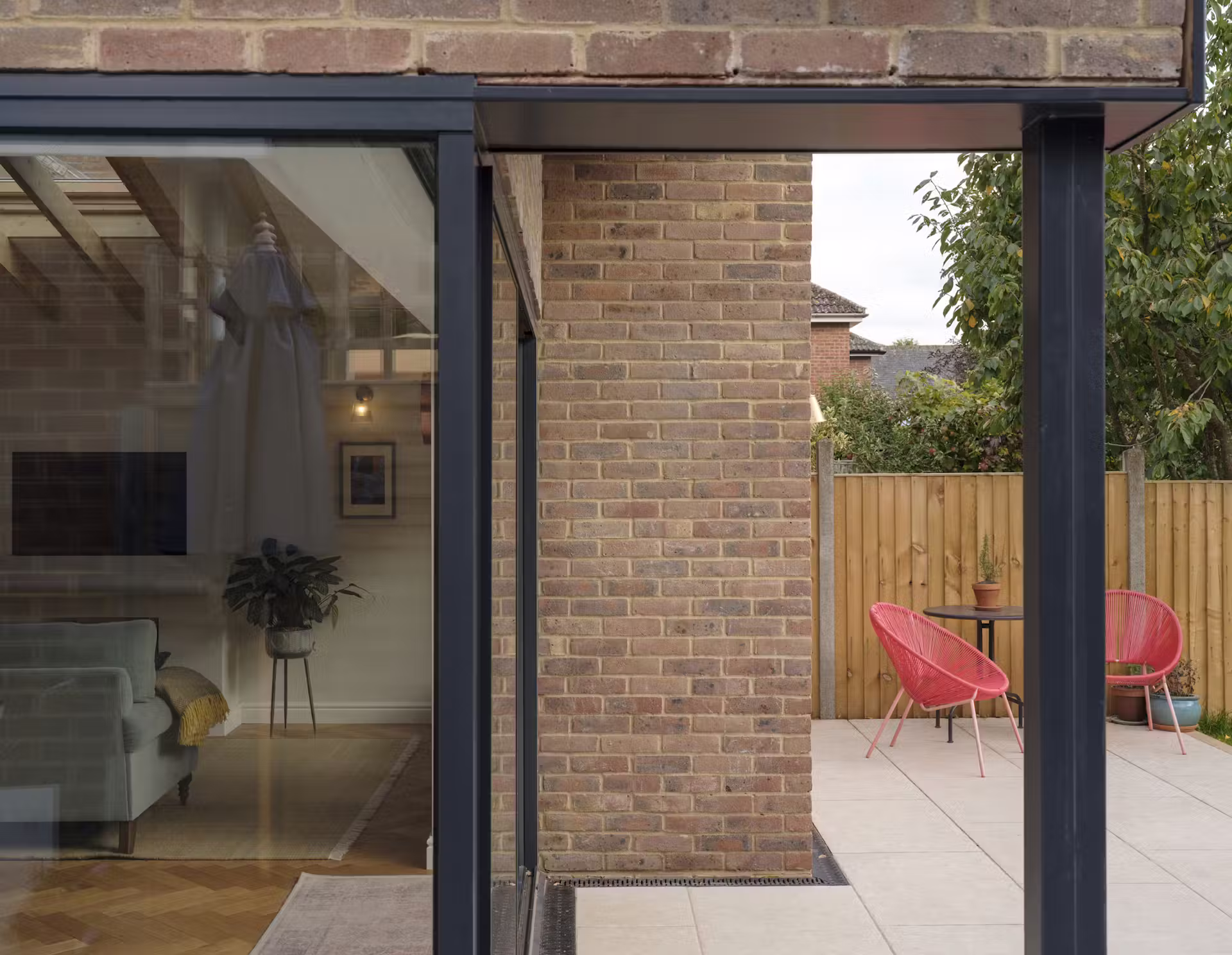 Kluczową decyzją było przesunięcie tylnej ściany budynku i skupienie głównych przestrzeni dziennych przy ogrodzie. Nowa część domu otwiera się szerokimi, przesuwnymi przeszkleniami na zieleń i widok rzeki Ver. Centralnym elementem stało się wykuszowe okno z siedziskiem, które po otwarciu tworzy ciągłą ławę łączącą wnętrze z tarasem.