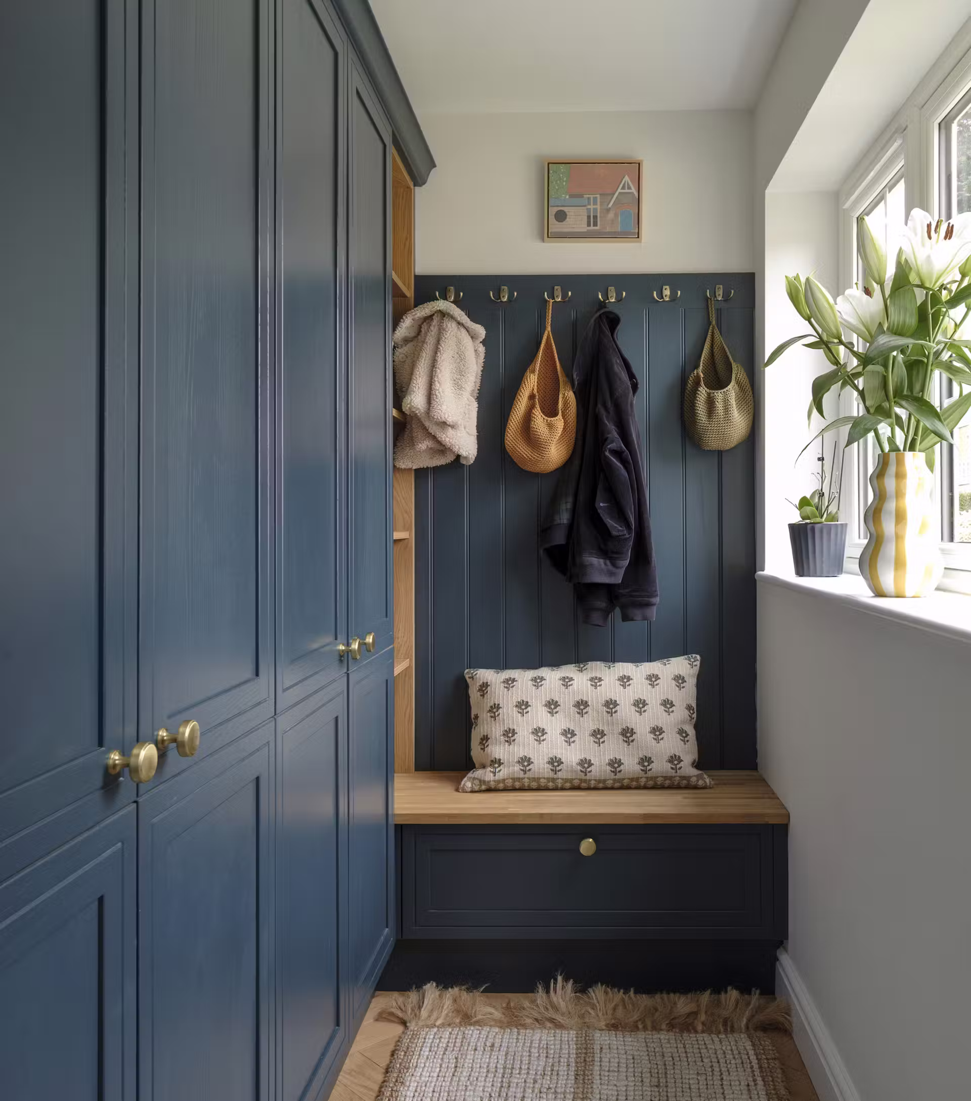 Kolorowe zabudowy stolarskie oraz przemyślane przechowywanie pozwoliły uporządkować codzienne życie pięcioosobowej rodziny. Wnętrza stały się bardziej funkcjonalne, a przestrzeń wolna od nadmiaru przedmiotów – spokojniejsza.