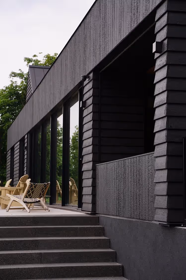 Elewacje domu wykończono techniką Shou Sugi Ban, która nadaje drewnu głęboką, niemal czarną barwę i zwiększa jego trwałość. Zwęglone deski tworzą spokojne, jednolite tło dla krajobrazu – zimą kontrastują z bielą śniegu, latem stapiają się z zielenią drzew. Materiał ten porządkuje wizualnie złożoną kompozycję brył, pozwalając światłu, wodzie i porom roku pozostać na pierwszym planie.