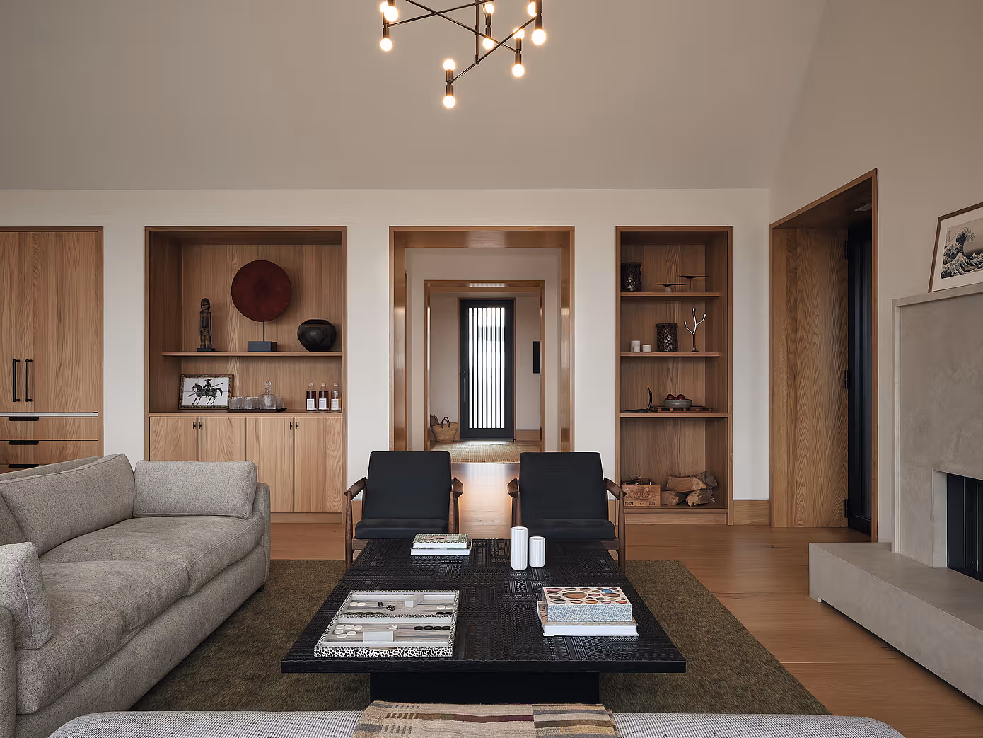Główna przestrzeń dzienna została zaprojektowana jako jedno, ciągłe wnętrze, w którym kuchnia, jadalnia i salon układają się wzdłuż 15-metrowego przeszklenia skierowanego na rzekę. Podłoga z szerokich, dębowych desek prowadzi ruch przez cały dom, a długie osie widokowe wzmacniają poczucie otwartości. Kuchnia, wyposażona w blaty z kwarcytu Taj Mahal, została zaplanowana tak, by zachować reprezentacyjny charakter, podczas gdy zaplecze funkcjonalne i spiżarnia pozostają niemal niewidoczne.