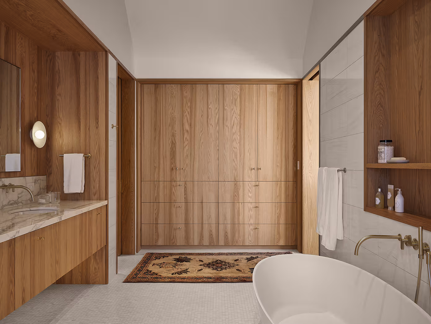 Część prywatna domu została celowo wyciszona i oddzielona od bardziej towarzyskich przestrzeni. Sekwencja przejść prowadzi przez niewielką niszę do pisania, po czym otwiera się na sypialnię z jednym, starannie wykadrowanym widokiem na rzekę. Łazienka główna rozjaśnia się dzięki naturalnemu światłu, a zastosowanie marmuru, kamienia Bianco Dolomite i mozaikowych posadzek buduje atmosferę spokojnego luksusu, pozbawionego ostentacji.