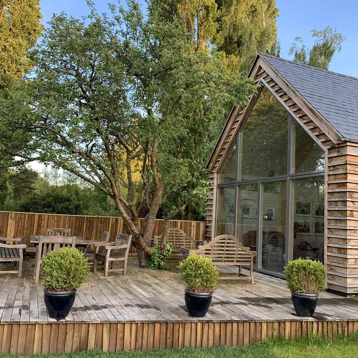 Projekt krajobrazu odegrał kluczową rolę w kształtowaniu charakteru domu. Wszystkie istniejące drzewa zostały zachowane, a stara jabłoń stała się centralnym punktem kompozycji ogrodu, wyeksponowanym poprzez przeszklony szczyt budynku. Podniesiony taras wyraźnie definiuje granicę pomiędzy przestrzenią wewnętrzną a zewnętrzną, jednocześnie wzmacniając wizualne połączenie z rzeką. Zastosowano również rozwiązania poprawiające retencję wody oraz pojemność terenów zalewowych, co było istotnym aspektem w kontekście lokalnych uwarunkowań hydrologicznych.