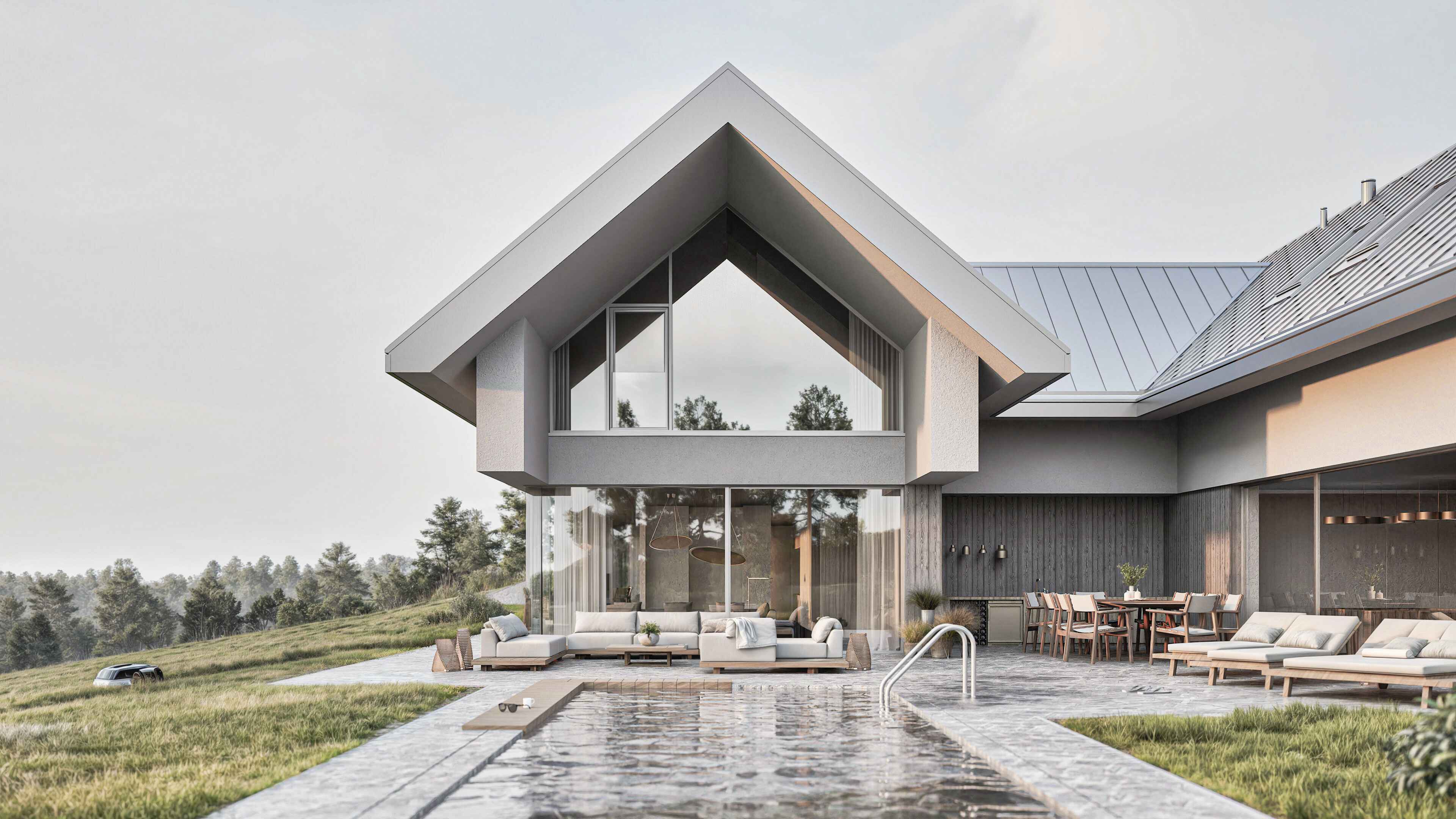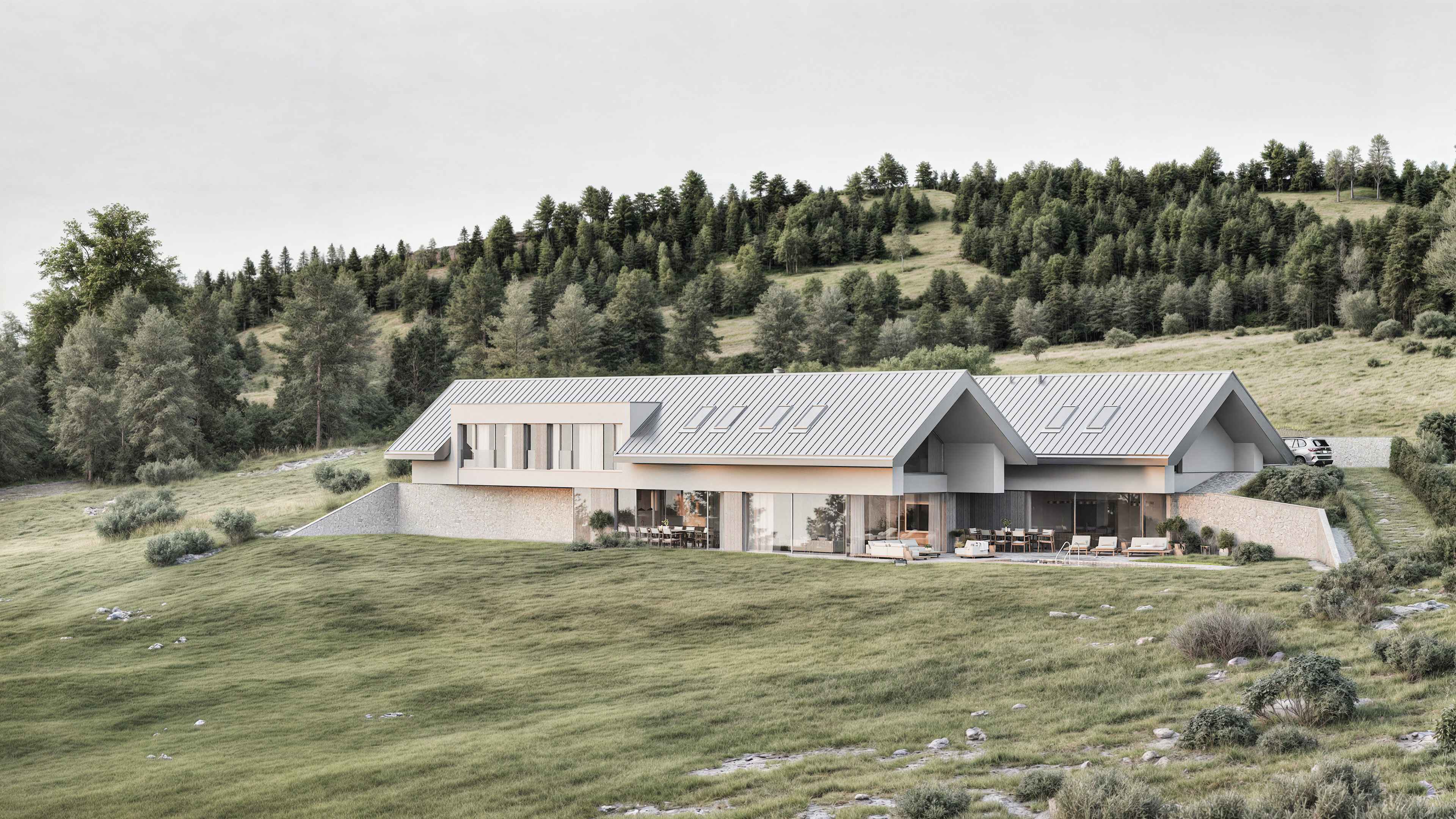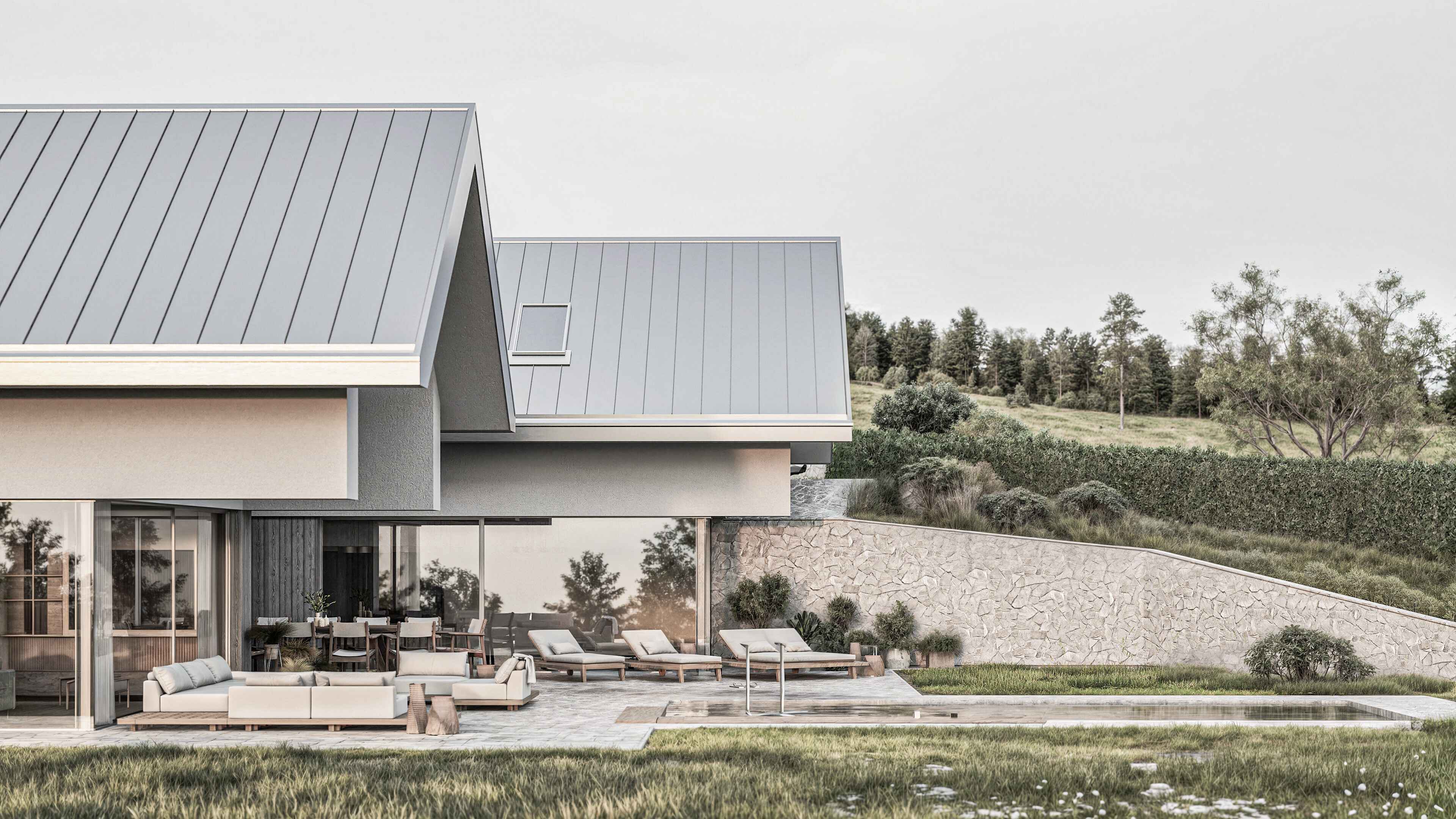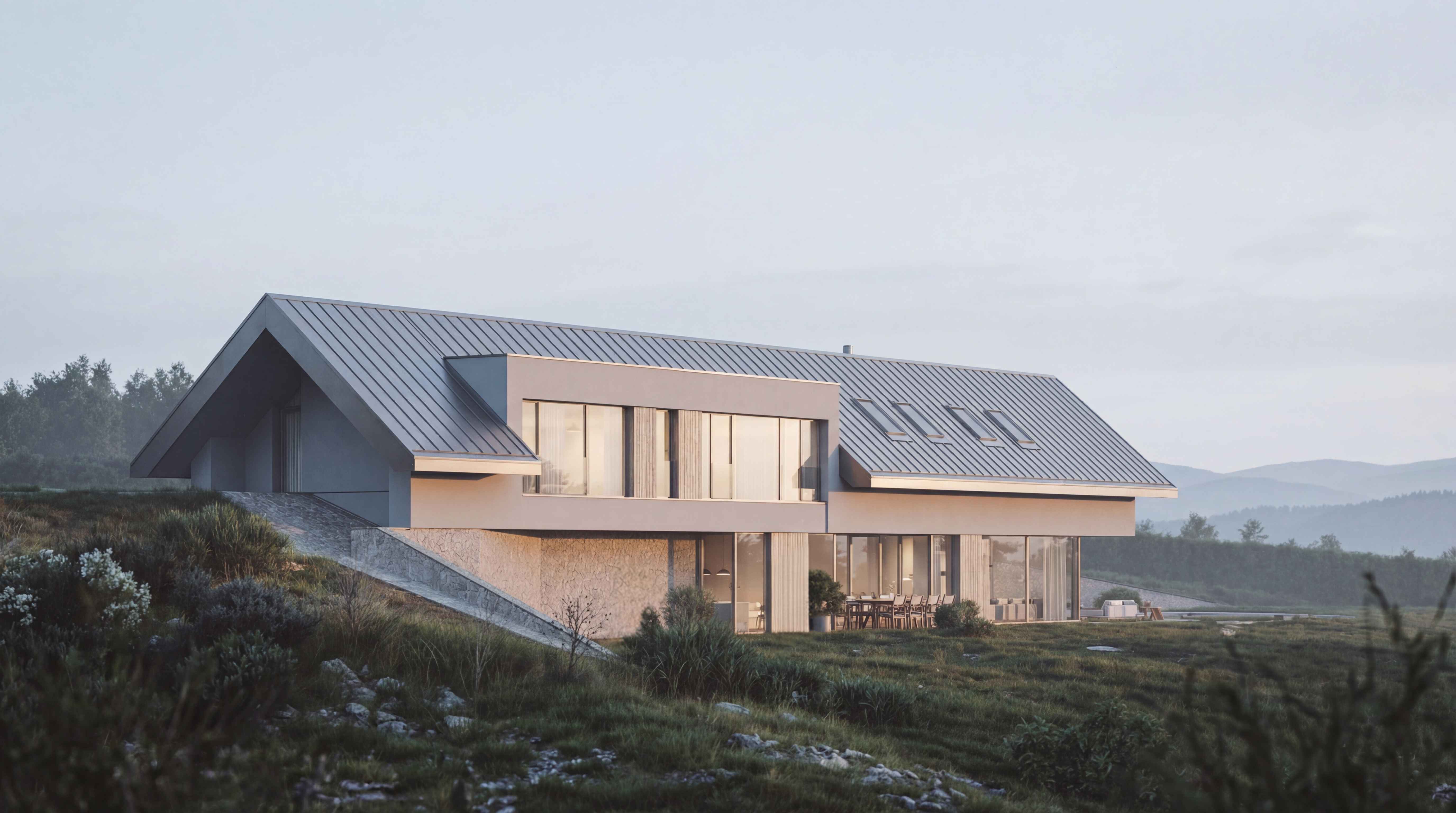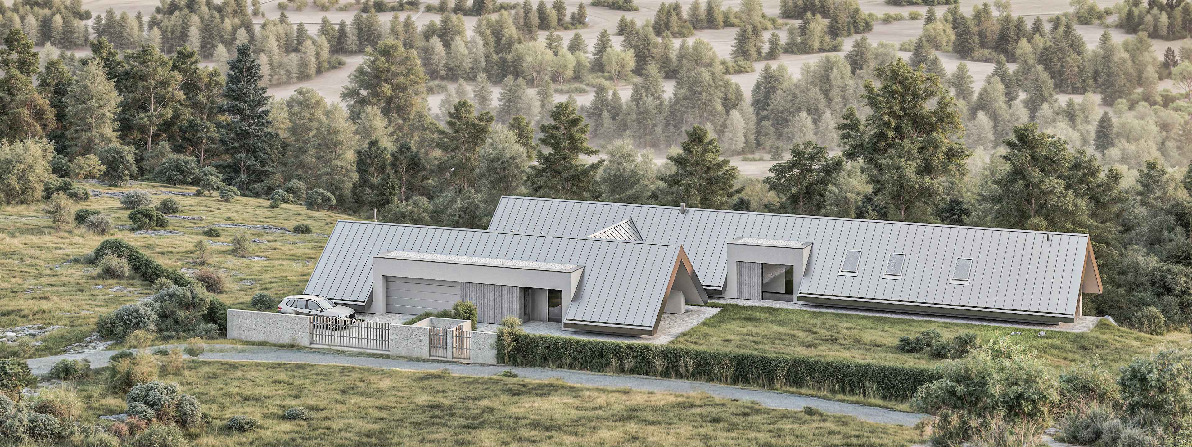 W projekcie zastosowano całą gamę materiałów wykończeniowych o różnych fakturach i odmiennym charakterze, takich jak: blacha dachowa układana na rąbek stojący, tynk silikonowy, deska elewacyjna, kamień. Każdy z nich jednak w zbliżonym, szarym kolorze. Dzięki temu budynek stanowi jednolitą, monumentalną i spójną w wyrazie całość. Bryła doskonale komponuje się z otoczeniem i dosłownie wyrasta z niego.