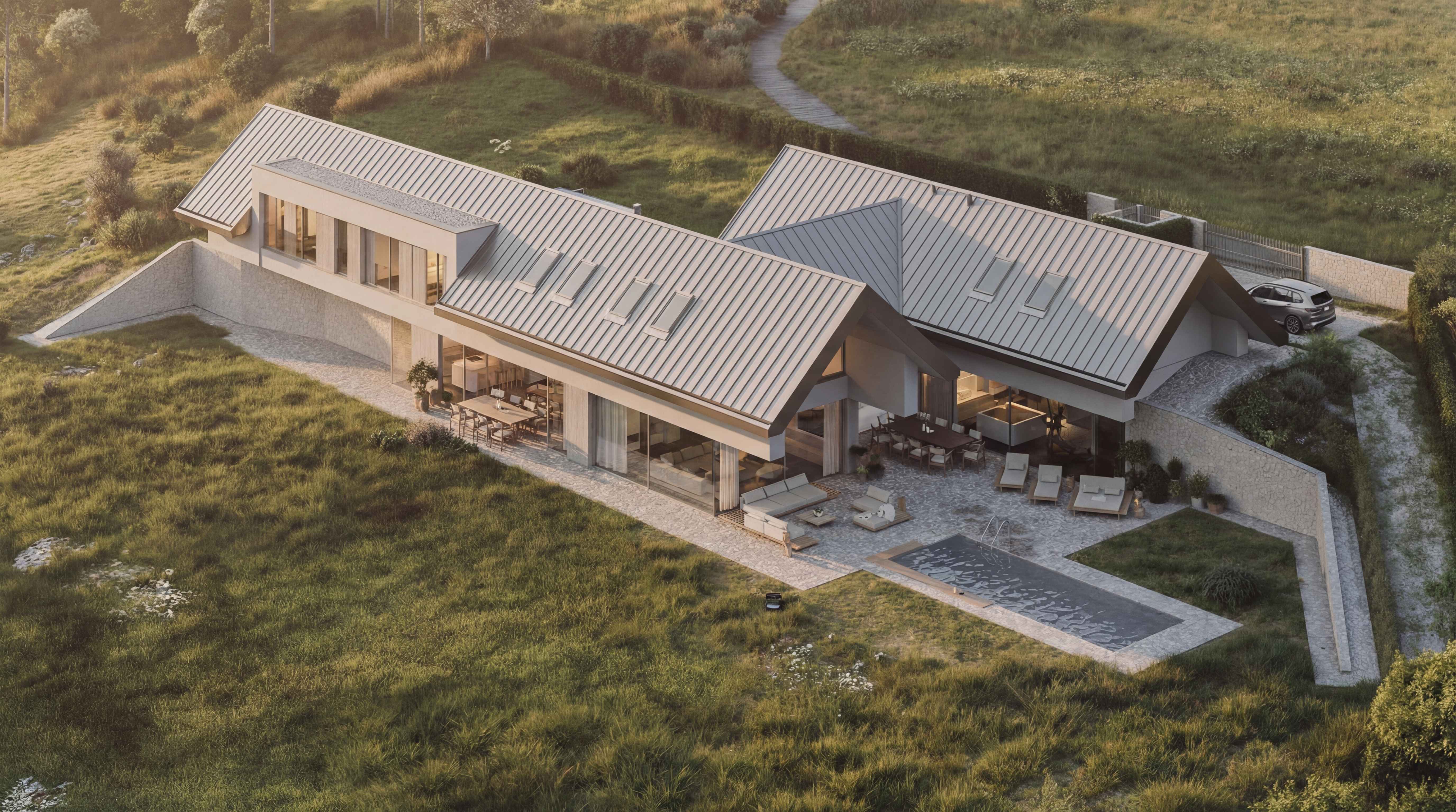 Dom o Dwóch Twarzach to nowoczesna interpretacja stodoły, w której prosta forma w naturalny sposób porządkuje relację budynku z krajobrazem. Projekt pokazuje, że prostota nie musi oznaczać jednowymiarowości, a minimalizm może iść w parze z komfortem, intymnością oraz wysoką jakością przestrzeni. Dom świadomie zamyka się na zewnątrz, chroniąc prywatność, by od strony krajobrazu otworzyć się w pełni na światło, widoki i codzienne życie mieszkańców. To architektura zakorzeniona w miejscu, odpowiadająca na ukształtowanie terenu i lokalny kontekst, a jednocześnie uniwersalna w swoim przekazie – spokojna, ponadczasowa i daleka od dosłowności.