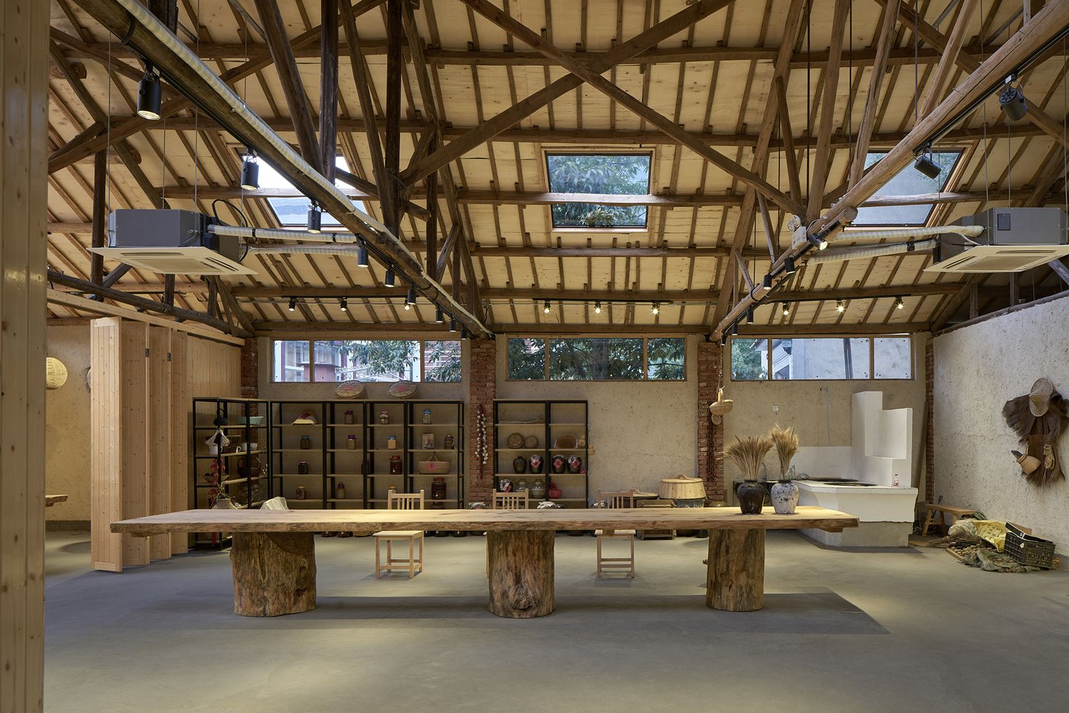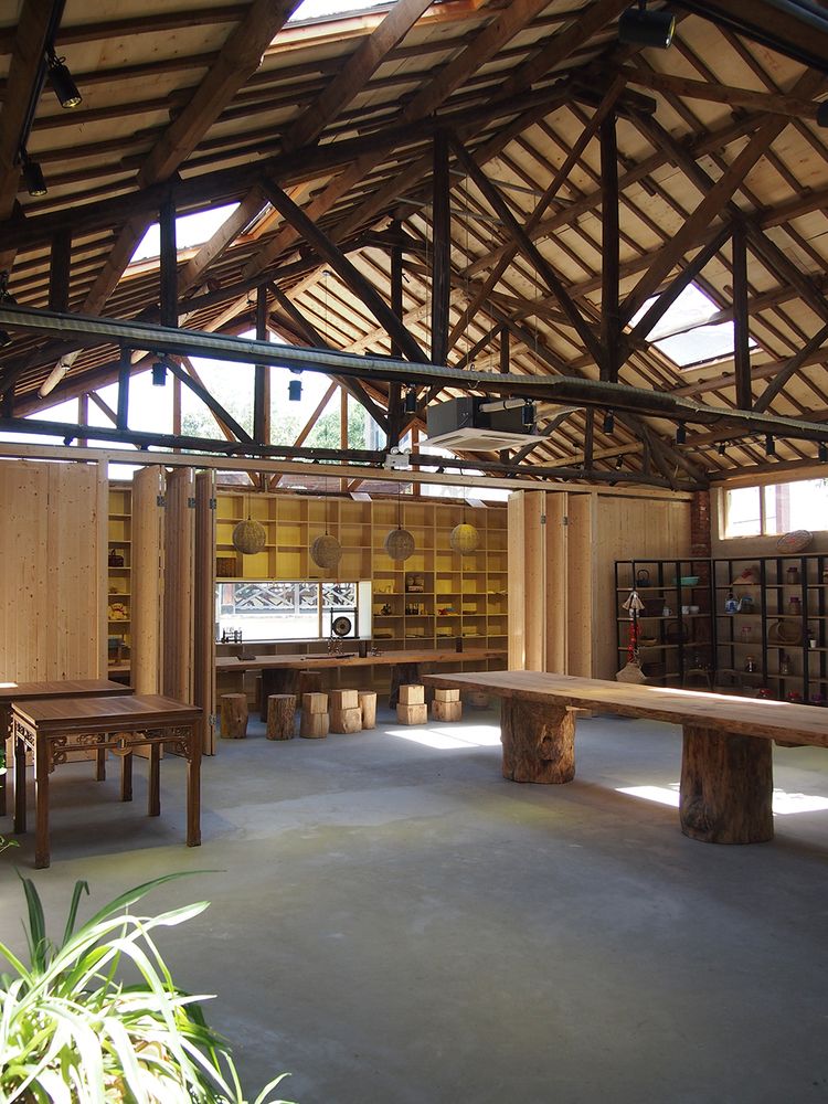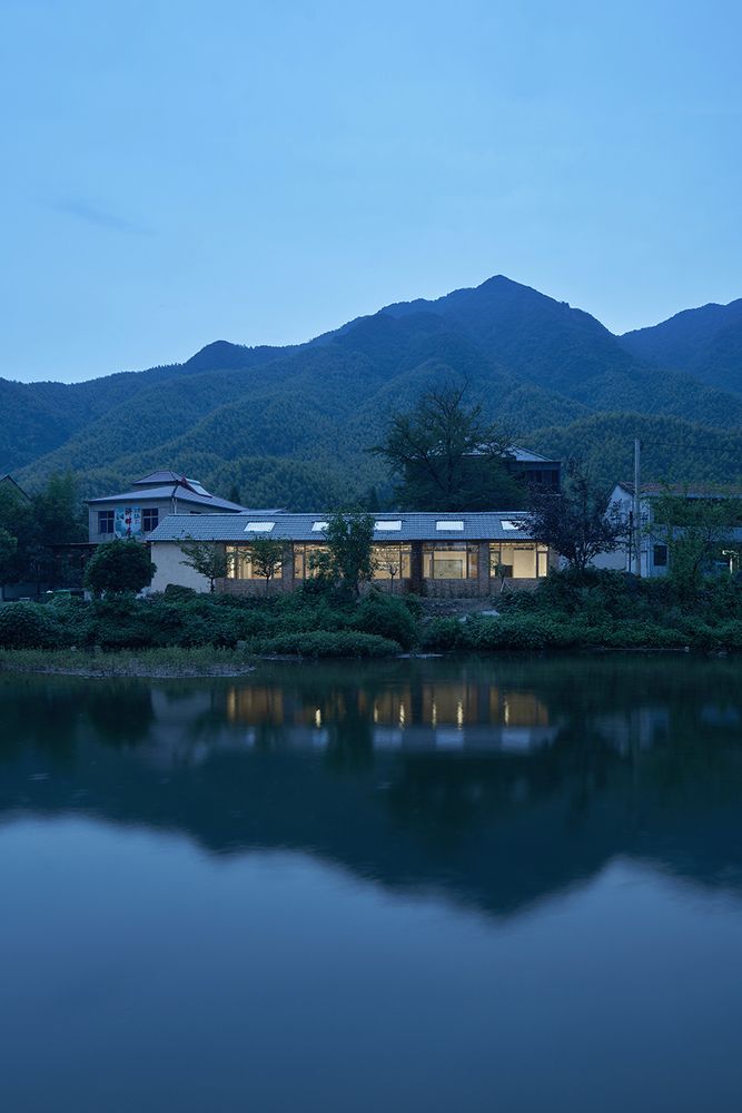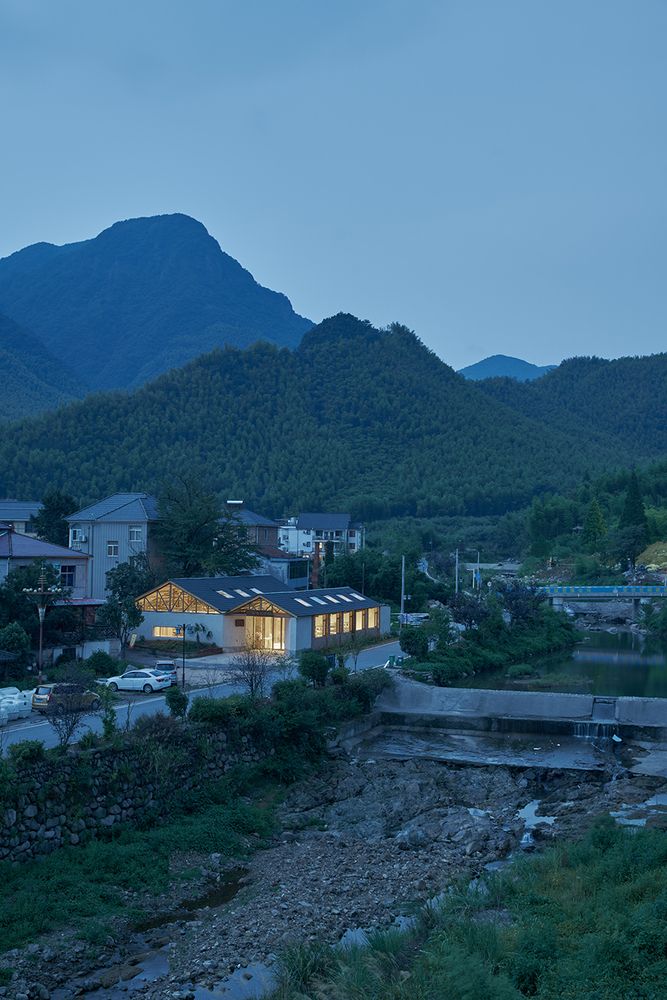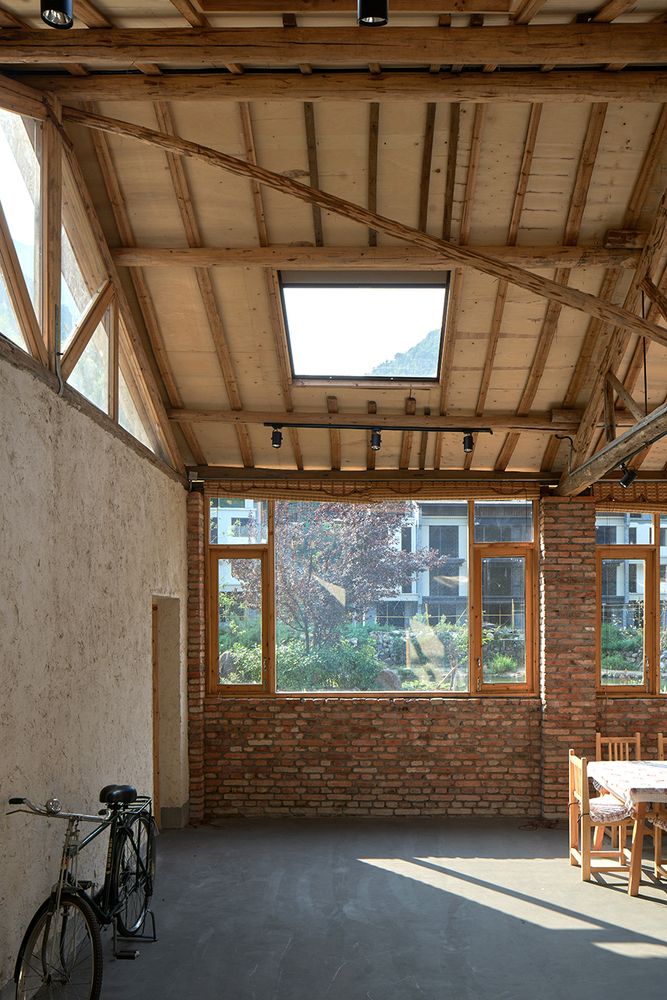 Projekt został opracowany przez The Design Institute of Landscape and Architecture China Academy of Art we współpracy z lokalnymi rzemieślnikami, którzy wykorzystali tradycyjne techniki i miejscowe materiały, takie jak czerwona cegła z rozebranych domów, żółte błoto oraz naturalne drewno. Wnętrze budynku charakteryzuje się prostotą i surowością – ściany mają tę samą fakturę co elewacja, podłogi wykonano z polerowanego betonu, a odsłonięta drewniana konstrukcja dachu podkreśla rzemieślniczy charakter przestrzeni. Okna dachowe rozmieszczone pomiędzy filarami wprowadzają naturalne światło i kadrują widoki na górskie szczyty, tworząc spójną relację między architekturą a otoczeniem. Całość realizacji stanowi przykład zrównoważonej architektury, w której tradycja, krajobraz i współczesny styl życia przenikają się w sposób naturalny i autentyczny.