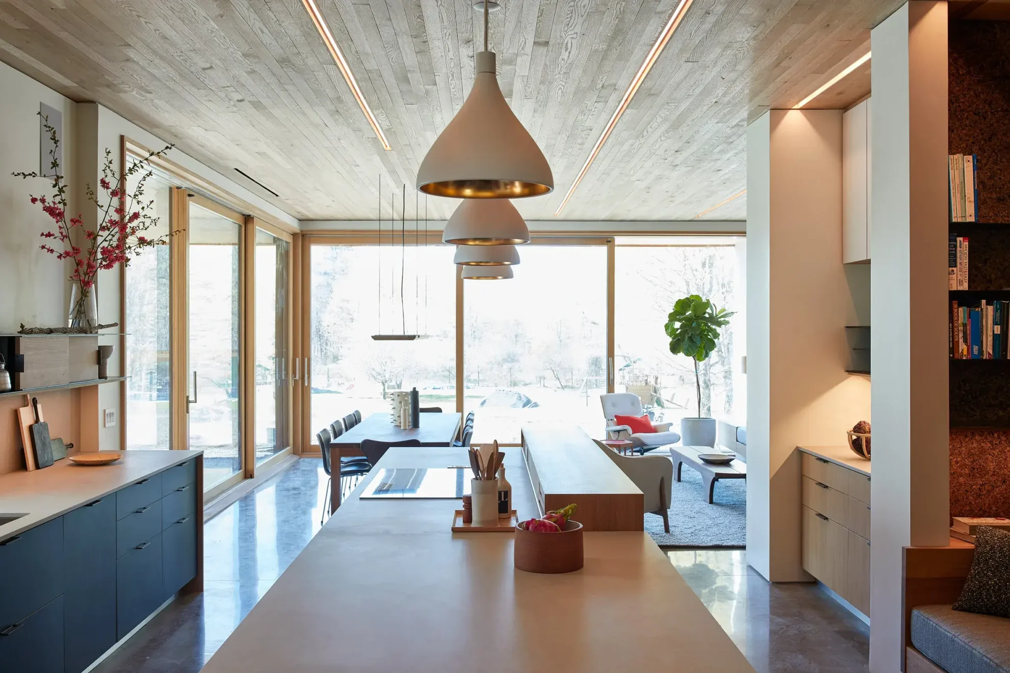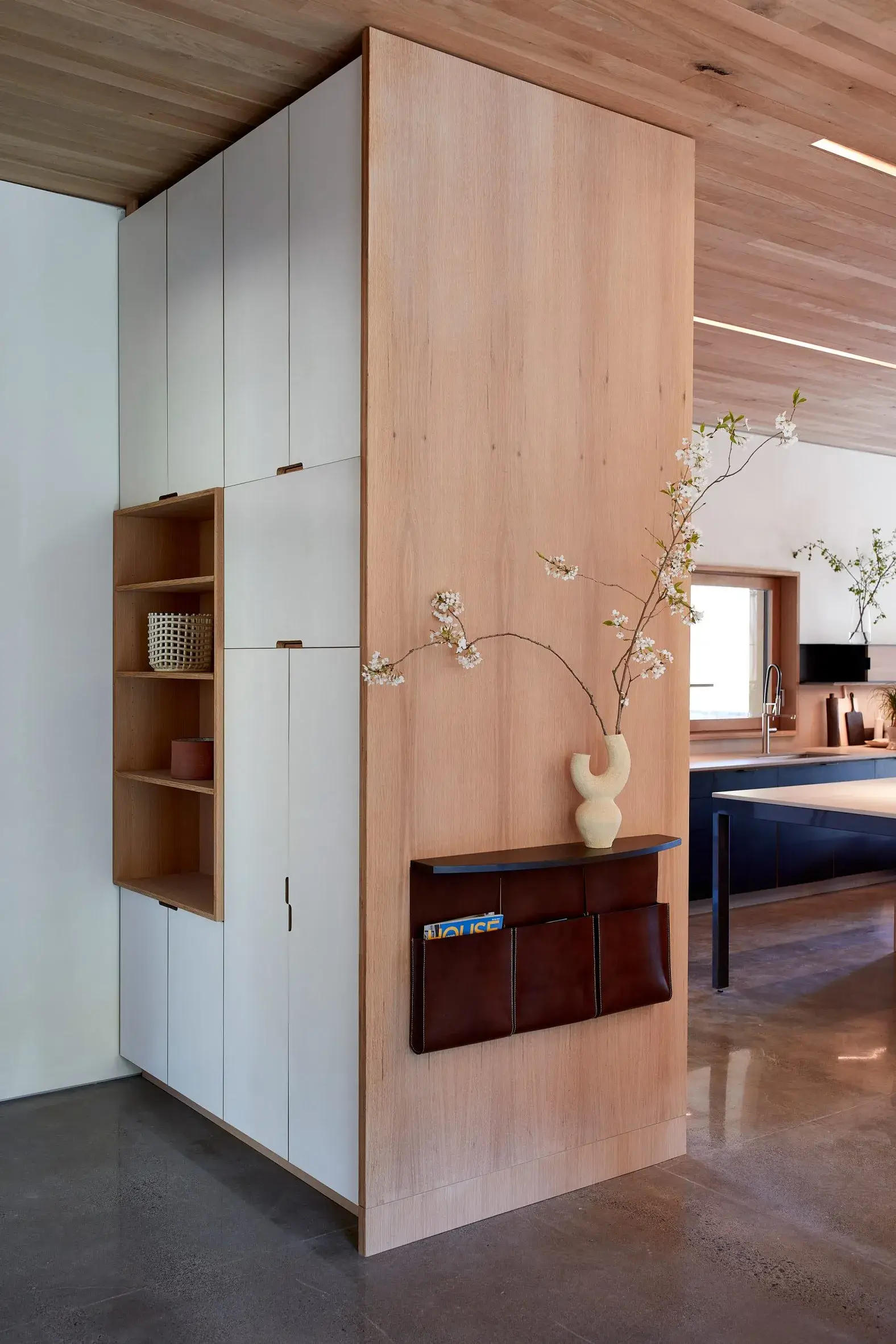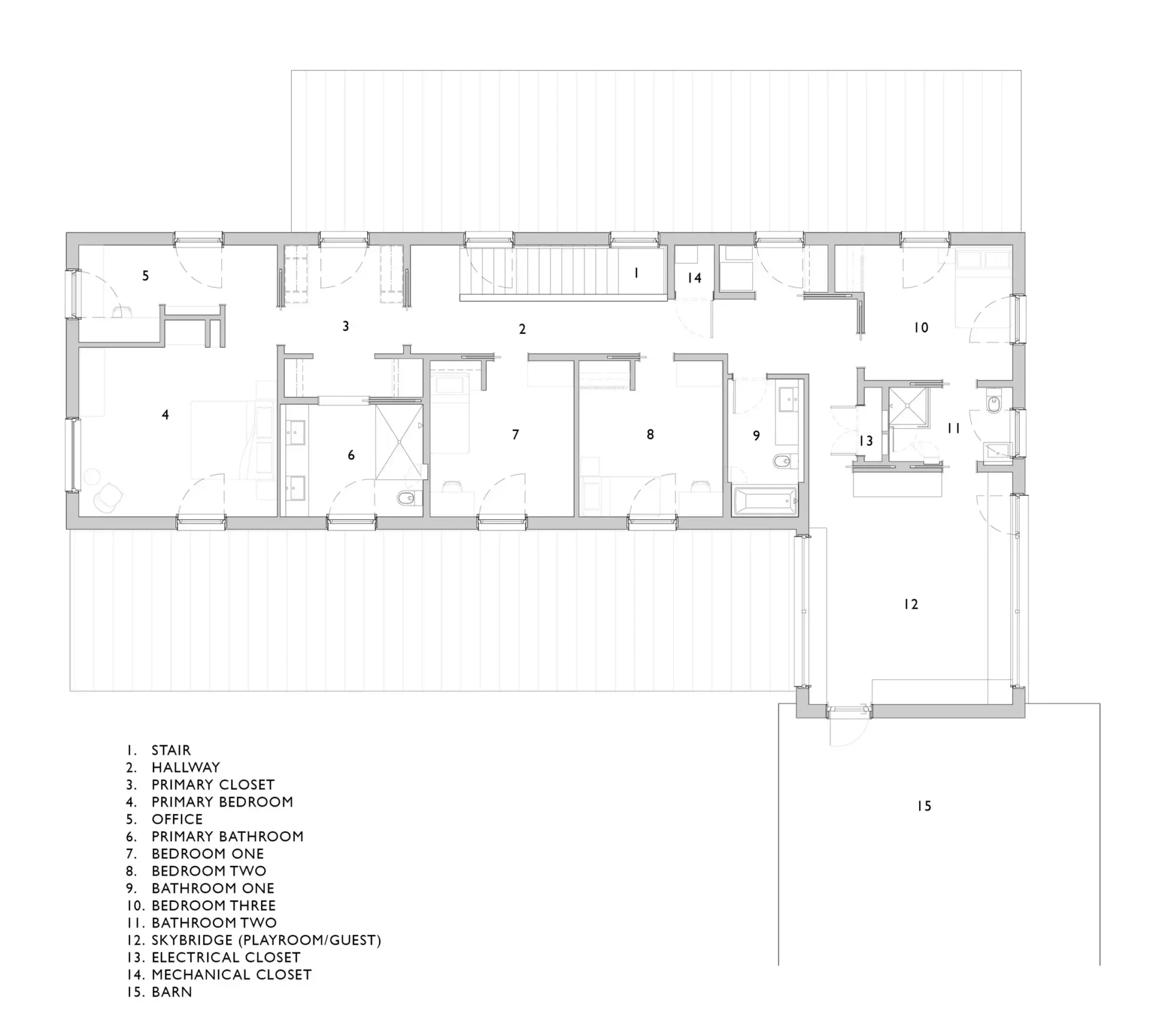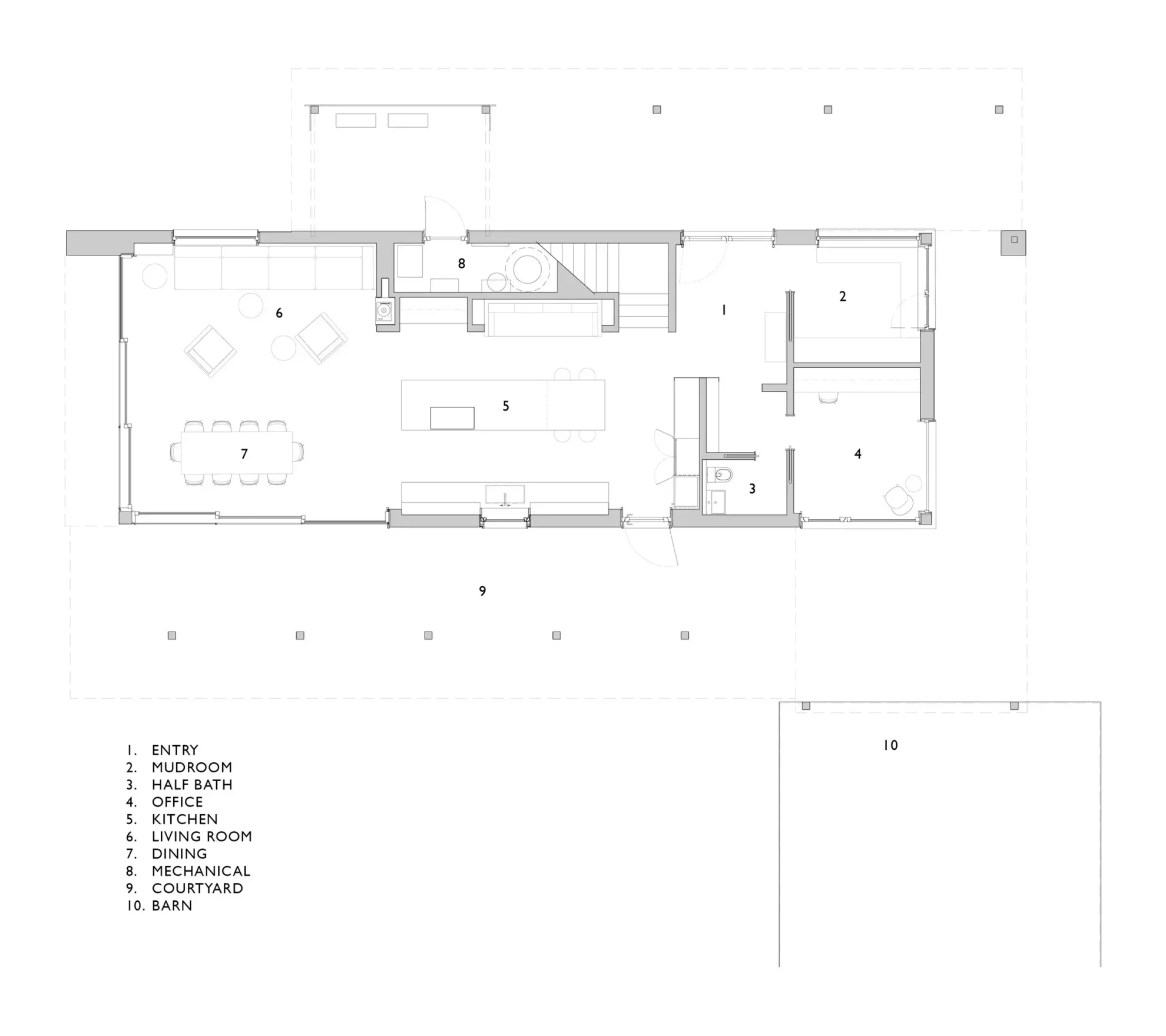 Dwupiętrowy dom ma powierzchnię 315 metrów kwadratowych i ma cztery sypialnie. Głębokie nawisy na każdym z długich boków prostokątnej bryły zapewniają bufor pomiędzy przestrzenią wewnętrzną i zewnętrzną. Architekci dodali domowe biuro na parterze, podczas gdy pozostała część tego poziomu poświęcili otwartej kuchni, salonowi i jadalni. Przestrzeń ta ma wbudowane szafki, które maksymalizują miejsce do przechowywania. Otwierają się także na częściowo zamknięty dziedziniec pomiędzy domem a pobliską stodołą. Na piętrze znajdują się trzy sypialnie dla dzieci, a także główny apartament, w którym znajduje się jeszcze jedno małe biuro.