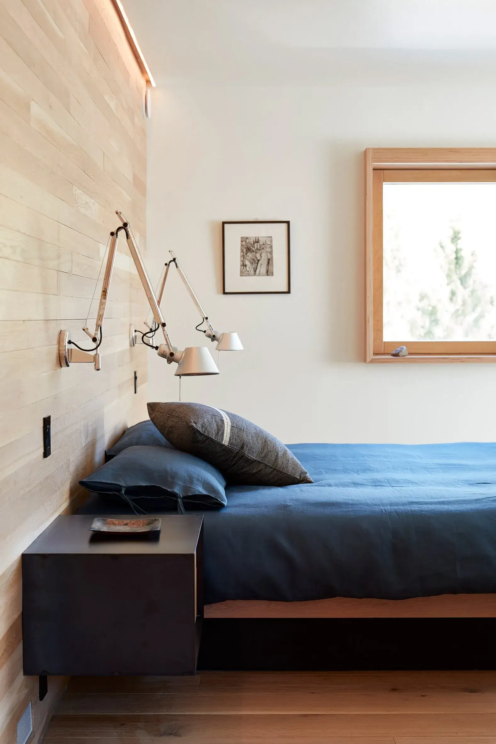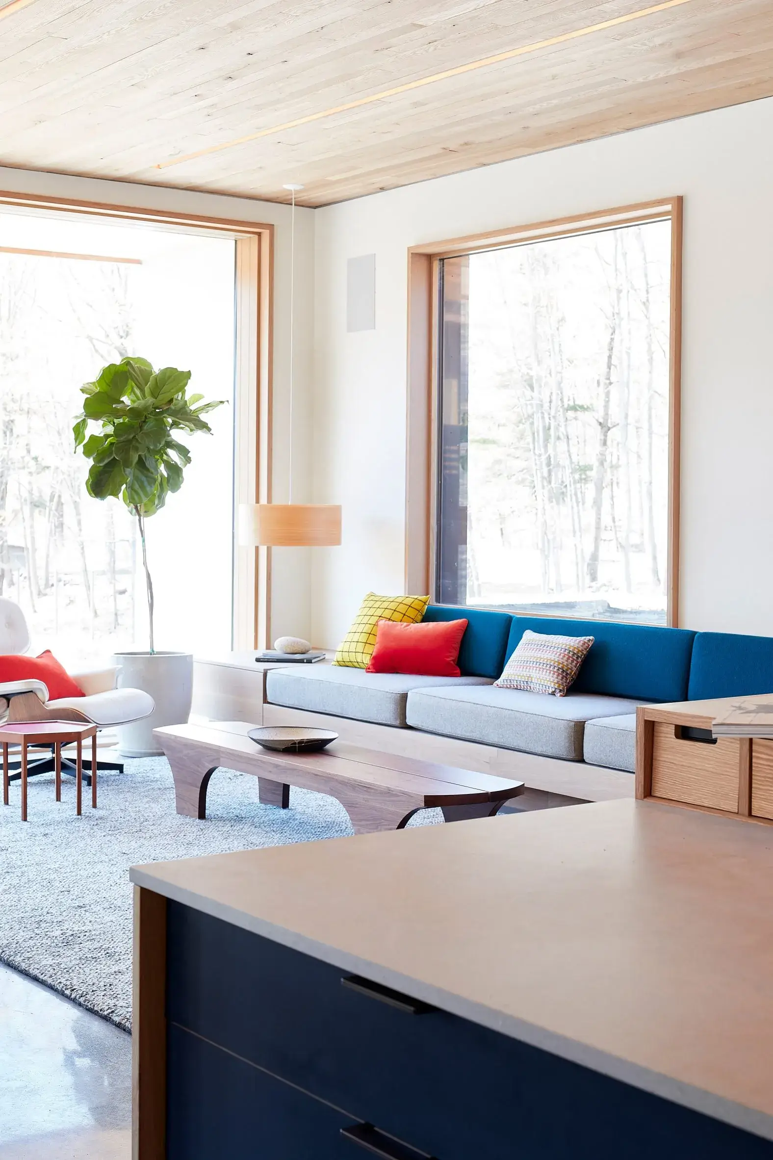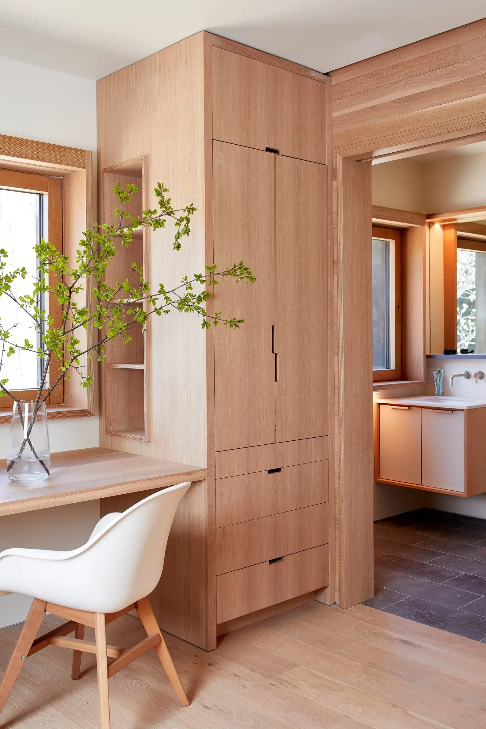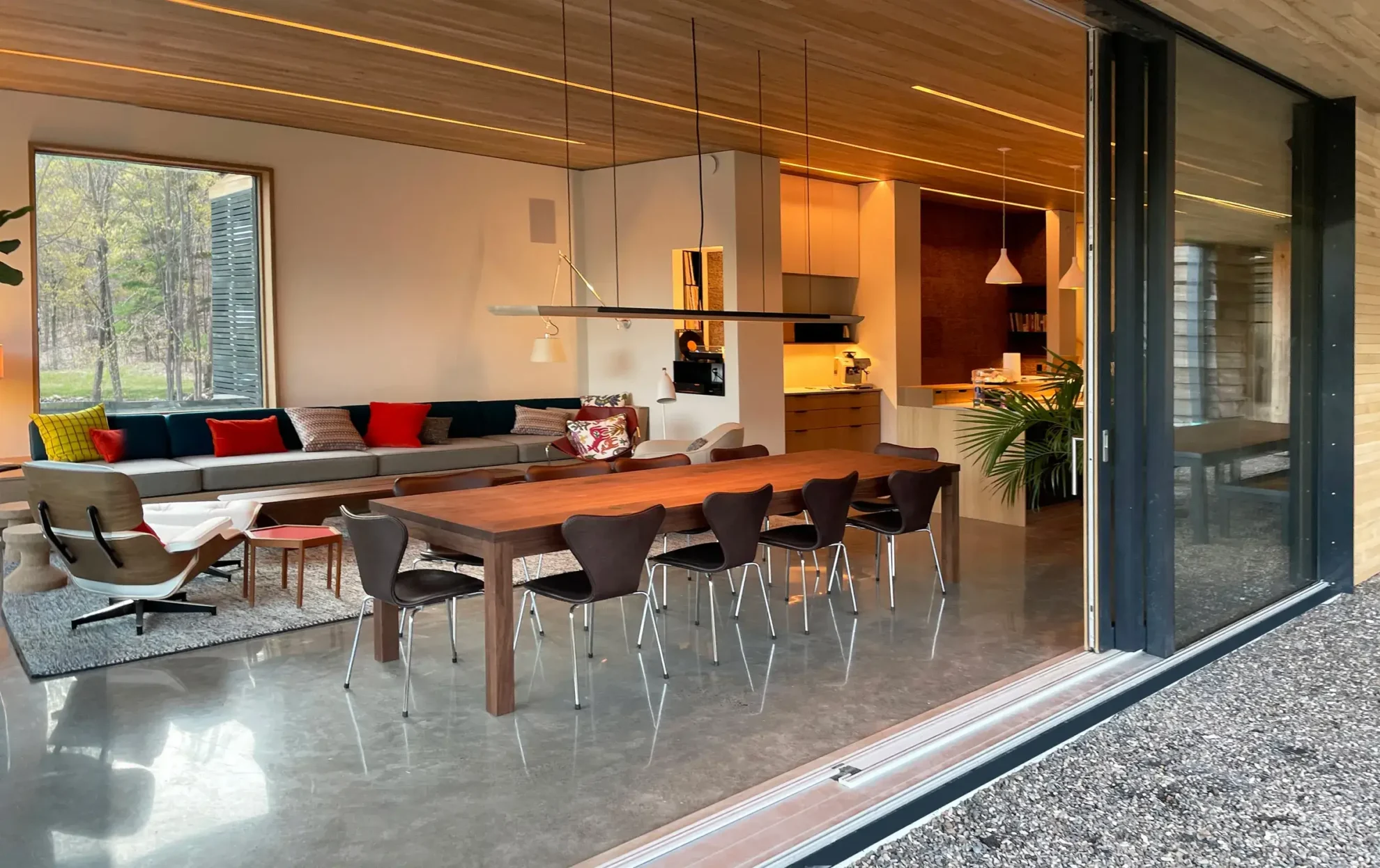 Dwupiętrowy dom ma powierzchnię 315 metrów kwadratowych i ma cztery sypialnie. Głębokie nawisy na każdym z długich boków prostokątnej bryły zapewniają bufor pomiędzy przestrzenią wewnętrzną i zewnętrzną. Architekci dodali domowe biuro na parterze, podczas gdy pozostała część tego poziomu poświęcili otwartej kuchni, salonowi i jadalni. Przestrzeń ta ma wbudowane szafki, które maksymalizują miejsce do przechowywania. Otwierają się także na częściowo zamknięty dziedziniec pomiędzy domem a pobliską stodołą. Na piętrze znajdują się trzy sypialnie dla dzieci, a także główny apartament, w którym znajduje się jeszcze jedno małe biuro.