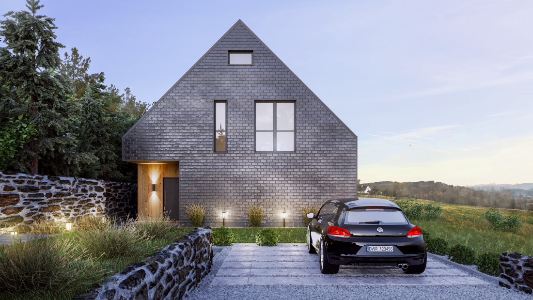 Od początku założeniem projektowym było stworzenie budynku, który wpisze się w estetykę domów sudeckich. Wstępnie planowano elewację w całości drewnianą, jednak ostatecznie wybór padł na łupek — materiał głęboko związany z lokalną architekturą, nadal spotykany na dachach i ścianach szczytowych tradycyjnych budynków. Jego naturalna, surowa faktura nadaje bryle wyrazistość i spójność z kontekstem miejsca.